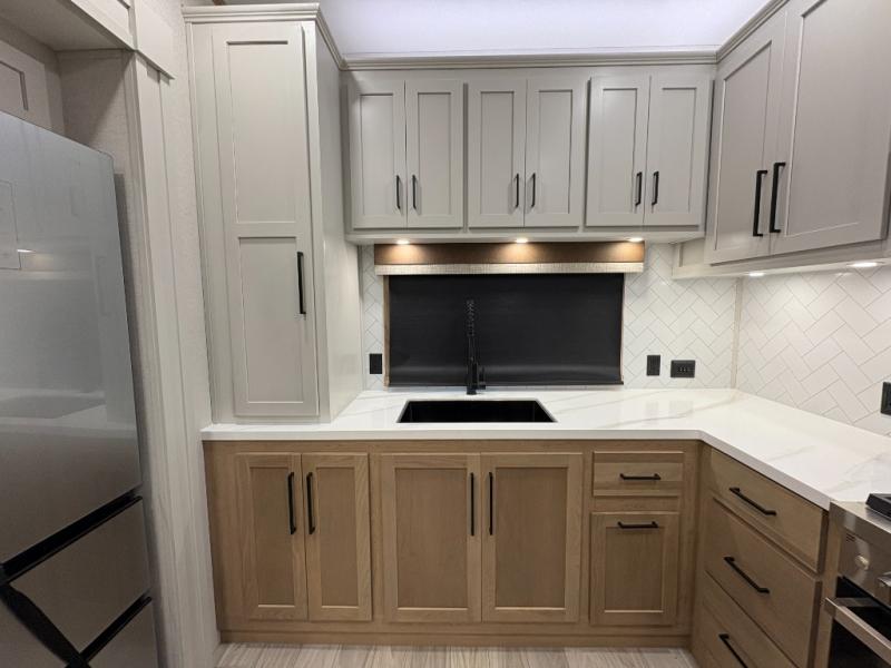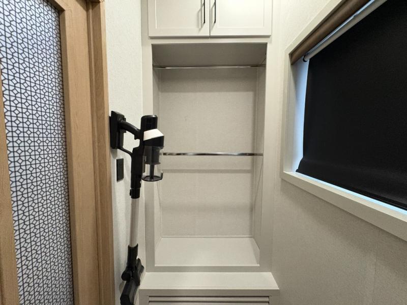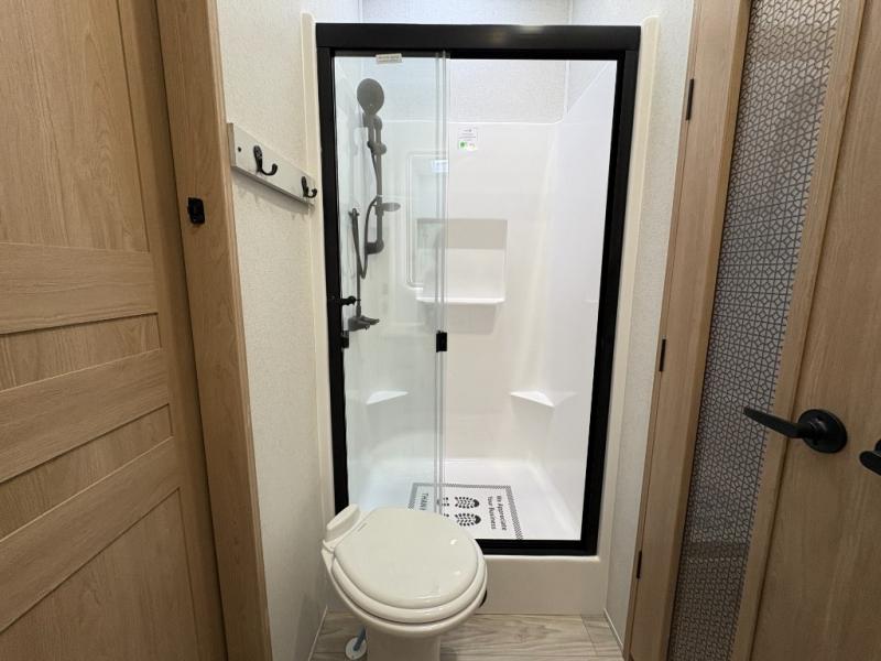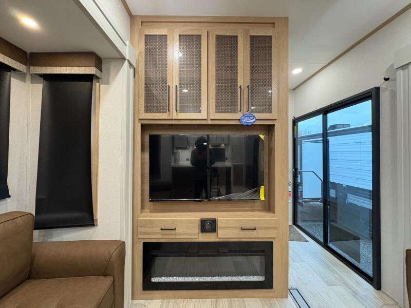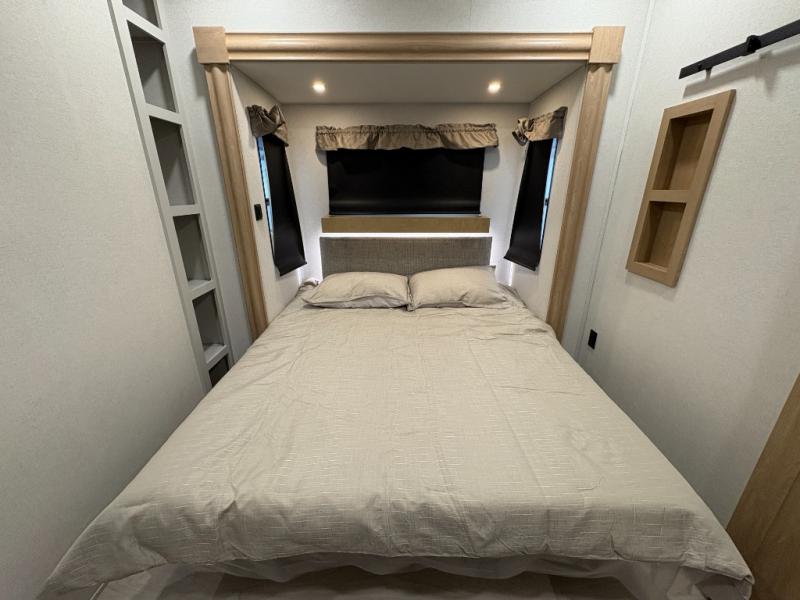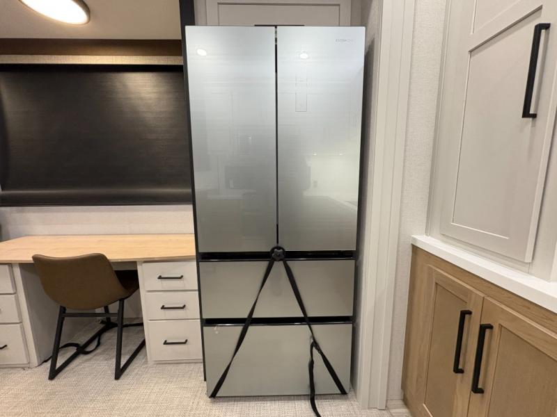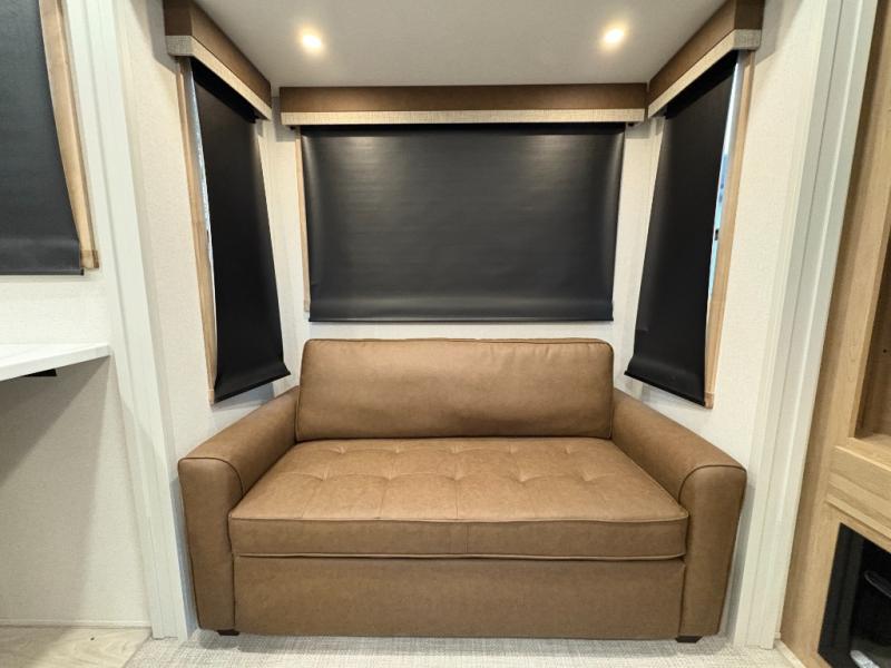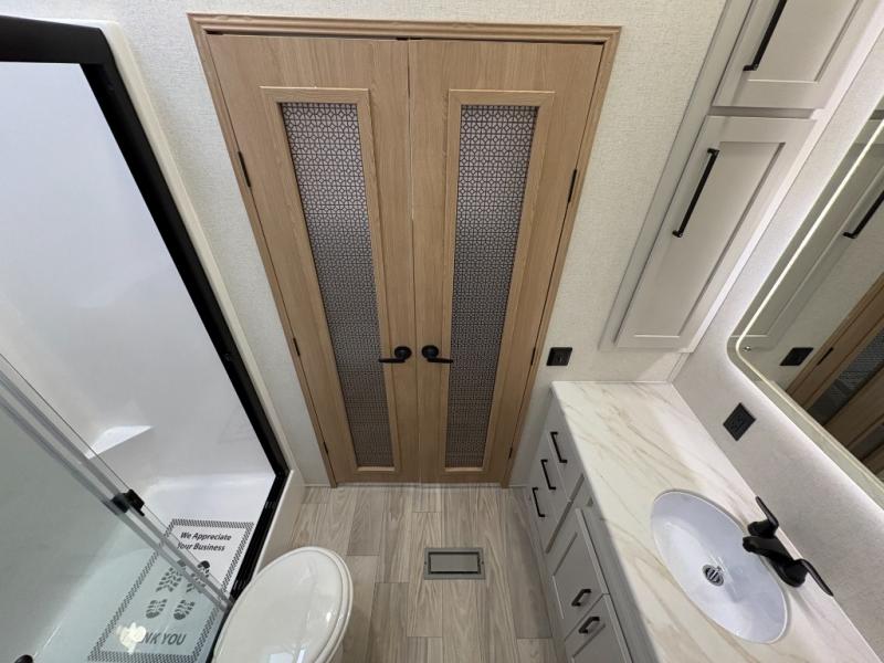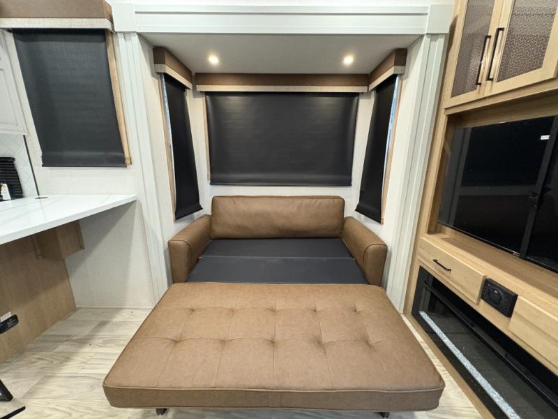 One look at this destination trailer and you'll be sold! You'll love waking up each morning in the master bedroom with a king bed slide out, dual nightstands, and a dresser to keep clothes organized. There is also a spacious front bathroom with a walk-in closet! As you walk to the main living area, you'll find the half bath with washer and dryer prep if you plan to add these appliances. A tri-fold hide-a-bed sofa and theater seating in the living area will let you relax each day, and the bar with stools overlooks the kitchen so you can visit with the chef while dinner is being made.