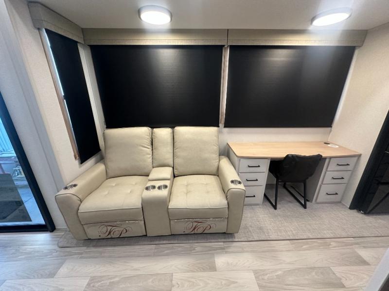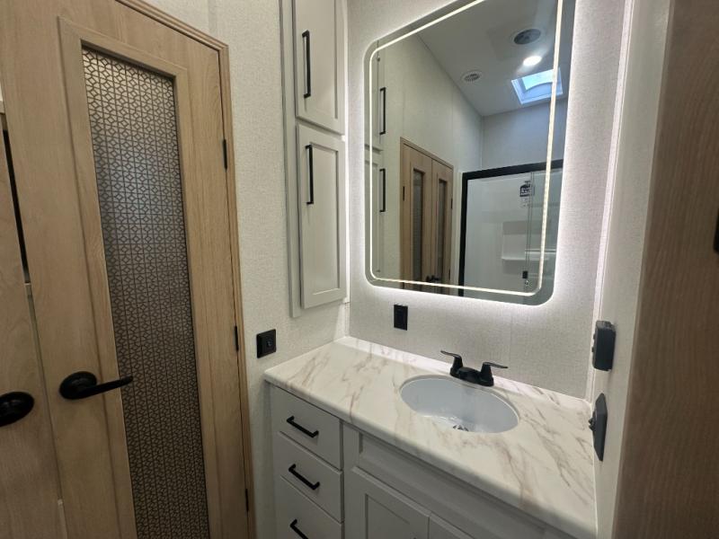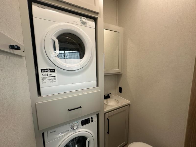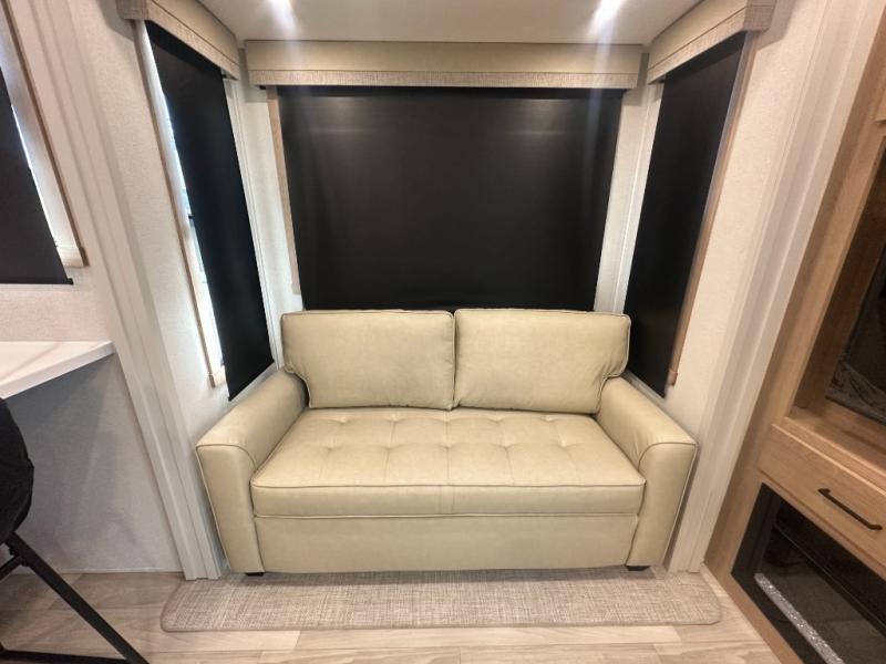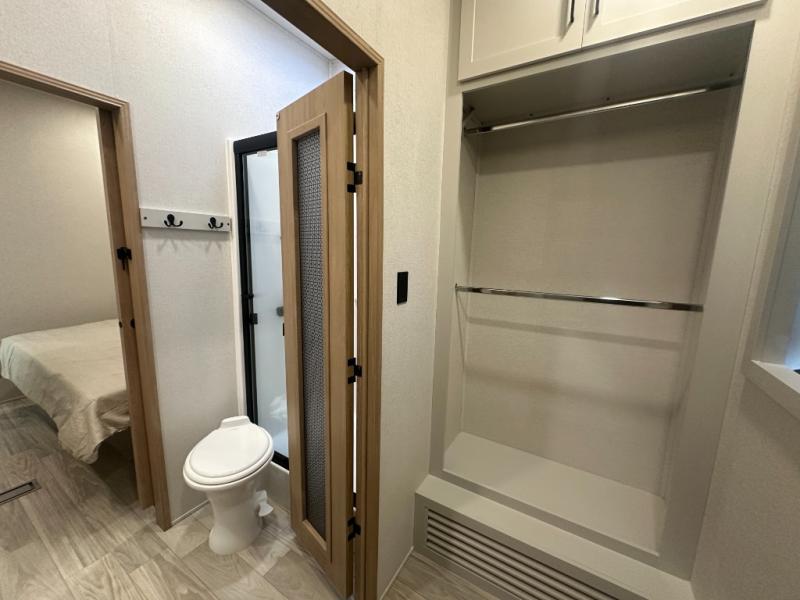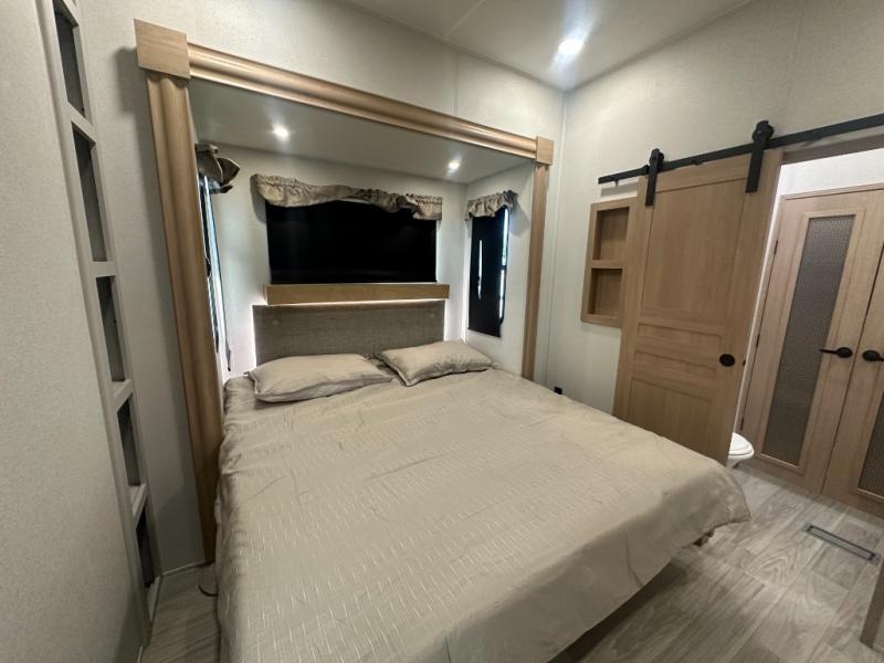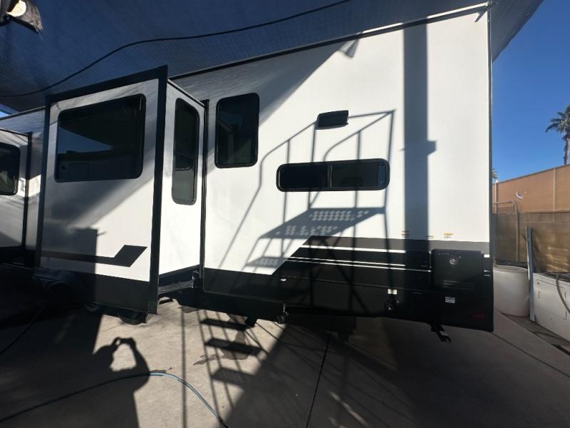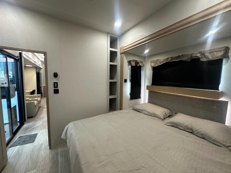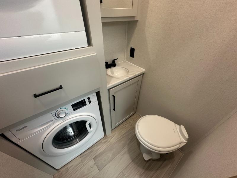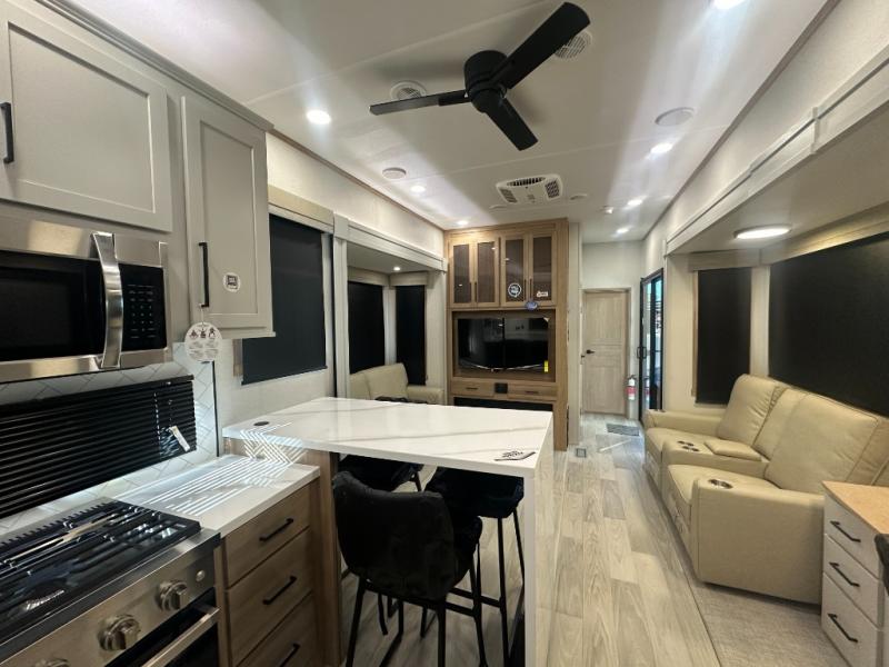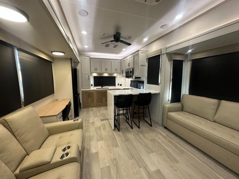 One look at this destination trailer and you'll be sold! You'll love waking up each morning in the master bedroom with a king bed slide out, dual nightstands, and a dresser to keep clothes organized. There is also a spacious front bathroom with a walk-in closet! As you walk to the main living area, you'll find the half bath with washer and dryer prep if you plan to add these appliances. A tri-fold hide-a-bed sofa and theater seating in the living area will let you relax each day, and the bar with stools overlooks the kitchen so you can visit with the chef while dinner is being made.