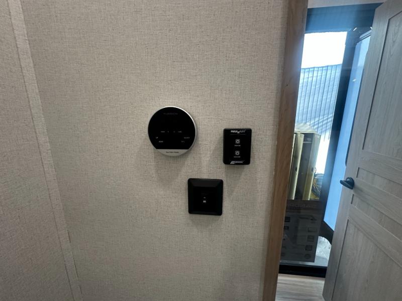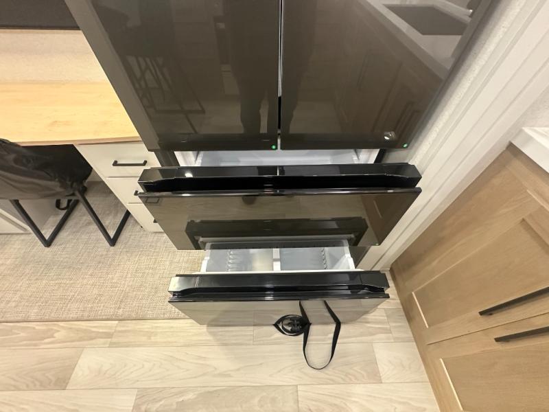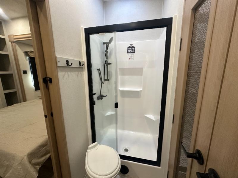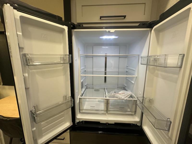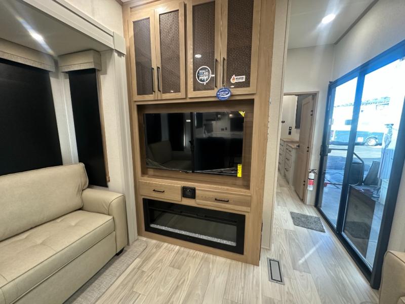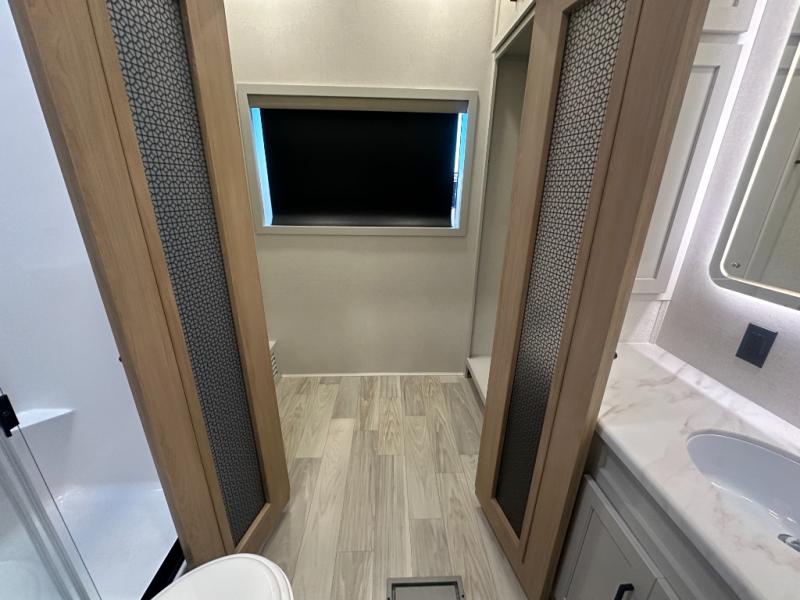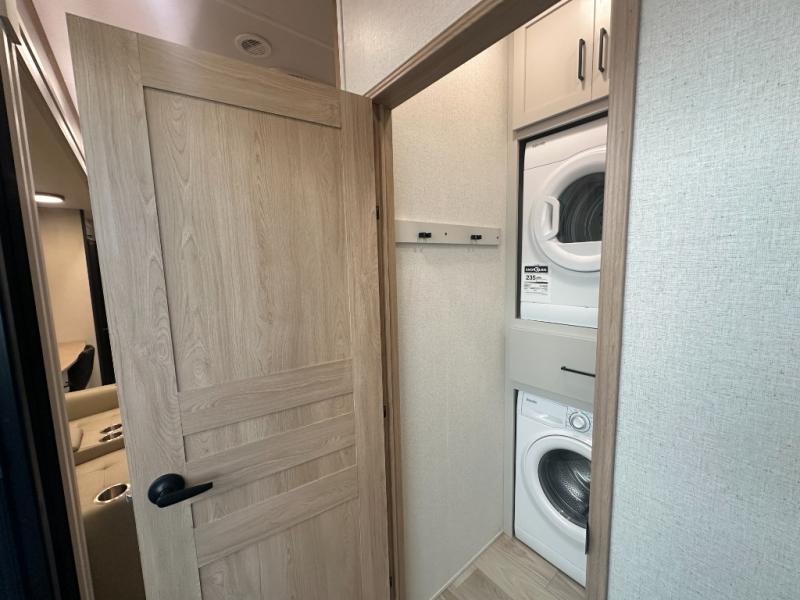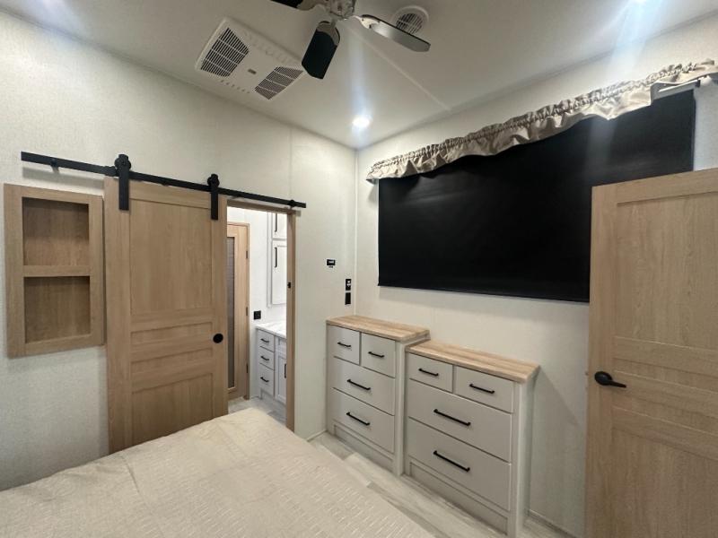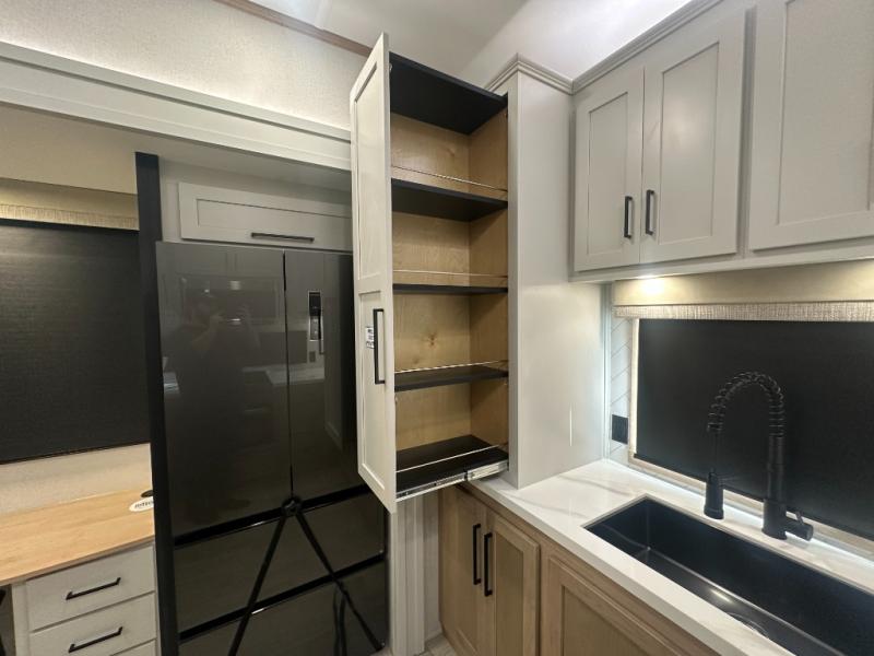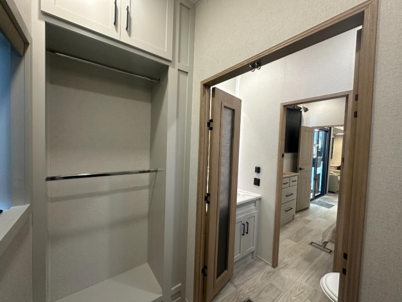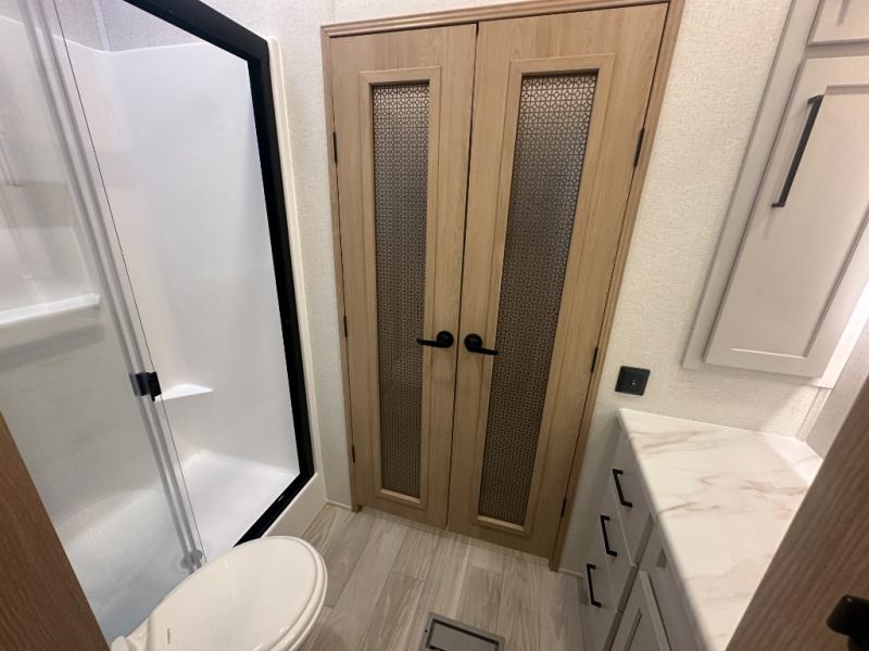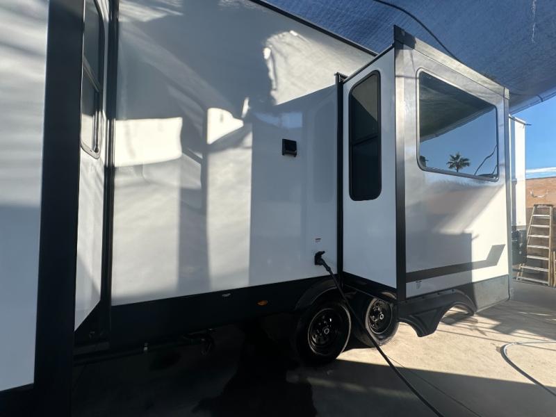 One look at this destination trailer and you'll be sold! You'll love waking up each morning in the master bedroom with a king bed slide out, dual nightstands, and a dresser to keep clothes organized. There is also a spacious front bathroom with a walk-in closet! As you walk to the main living area, you'll find the half bath with washer and dryer prep if you plan to add these appliances. A tri-fold hide-a-bed sofa and theater seating in the living area will let you relax each day, and the bar with stools overlooks the kitchen so you can visit with the chef while dinner is being made.