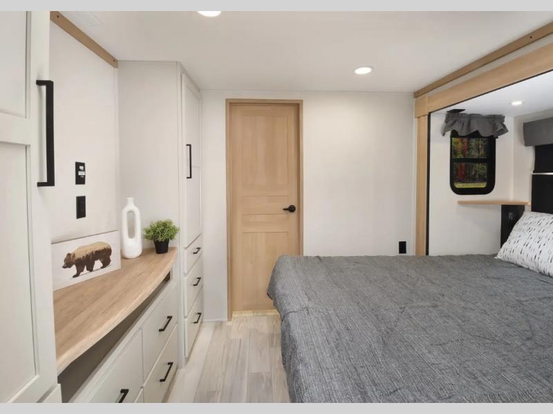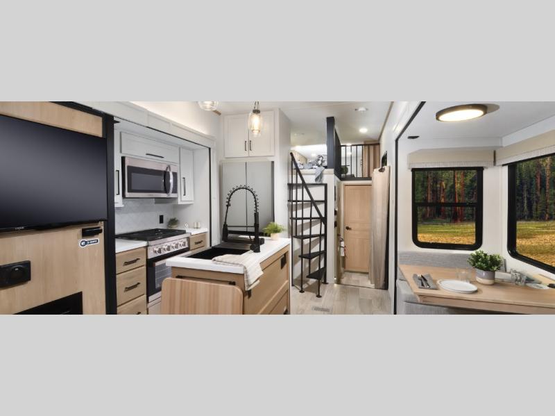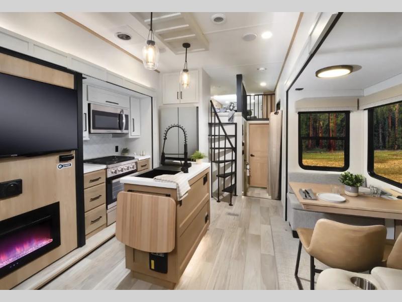 You won't believe the comfort and convenience found in this destination trailer. There are two private bedrooms; one up front with a queen bed slide out and storage space, and one in back with a queen bed slide out and a half bath! There is even washer and dryer prep here if you want to add those appliances and the second entry door is also found in this location so you can easily slip out in the morning. Above each of these rooms is a loft providing three total bunk mats for sleeping, storage cabinets, and TV prep if you want to add entertainment. Everyone can meet in the combined kitchen and living room that includes dual opposing slides, a 60" theater seating across from a 50" flat screen TV and fireplace, plus a free-standing table with chairs and a bench to dine at. The chef of your group will love the large kitchen island, Chef Collection three burner range, and a 16.2 cu. ft. refrigerator for food storage.