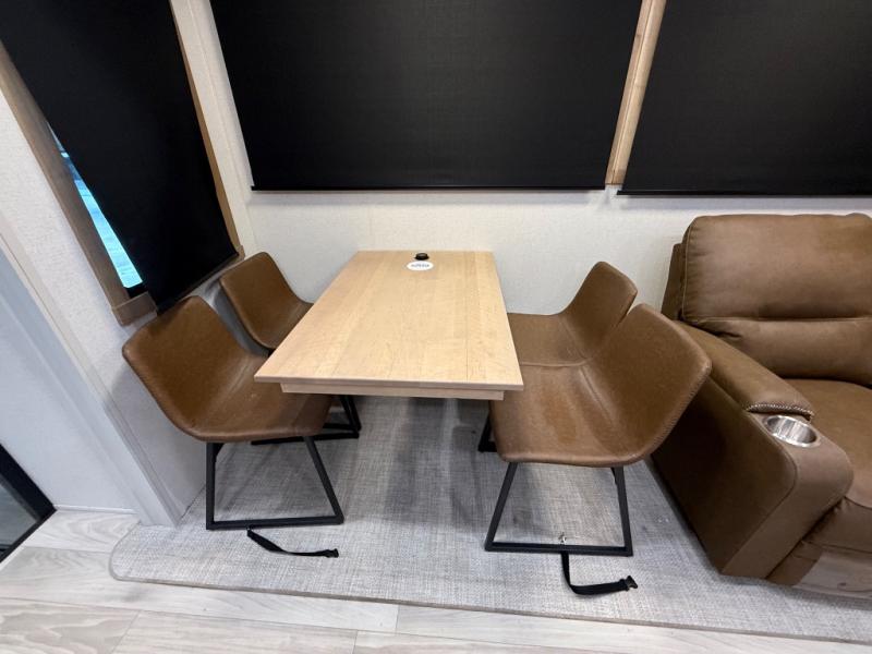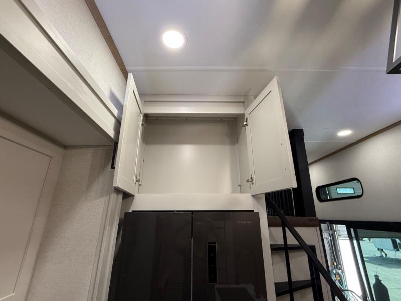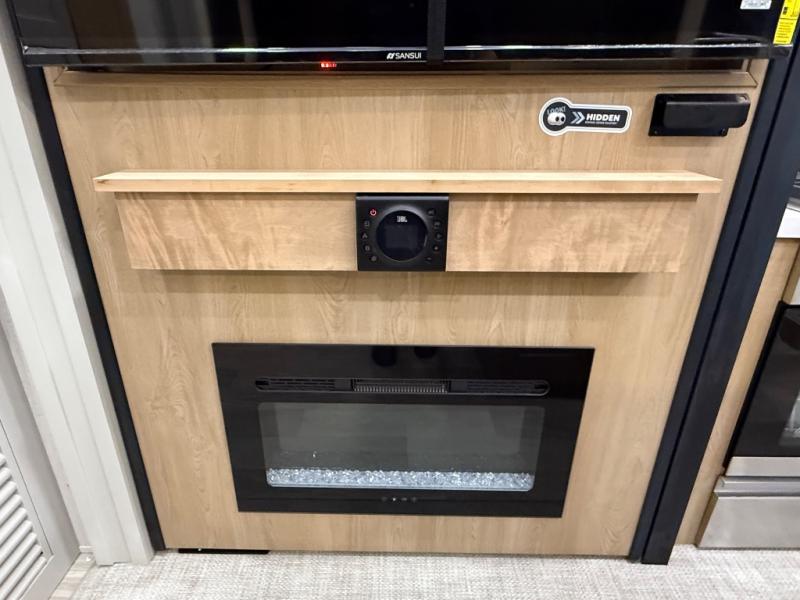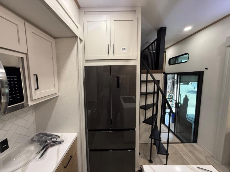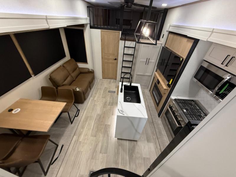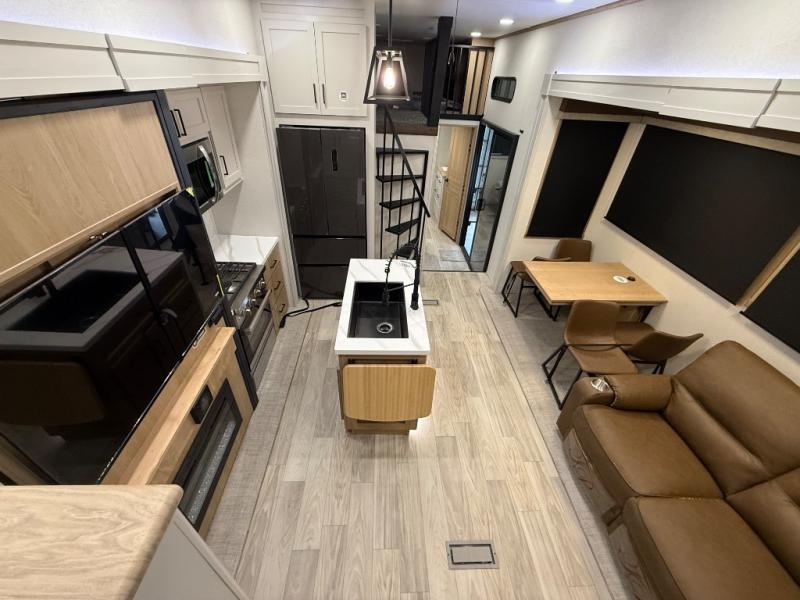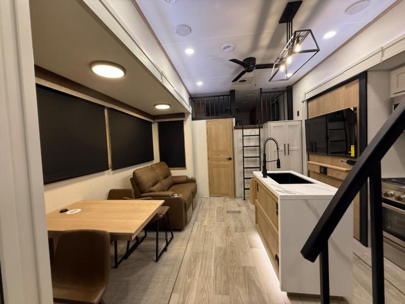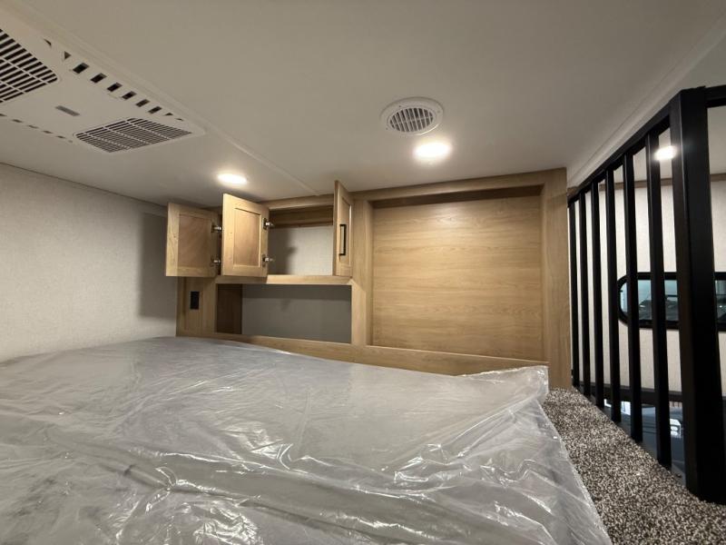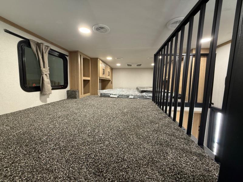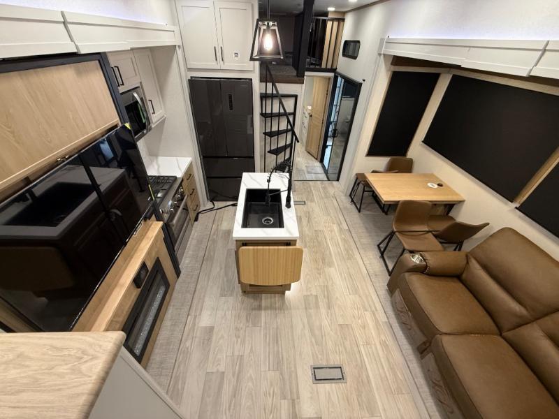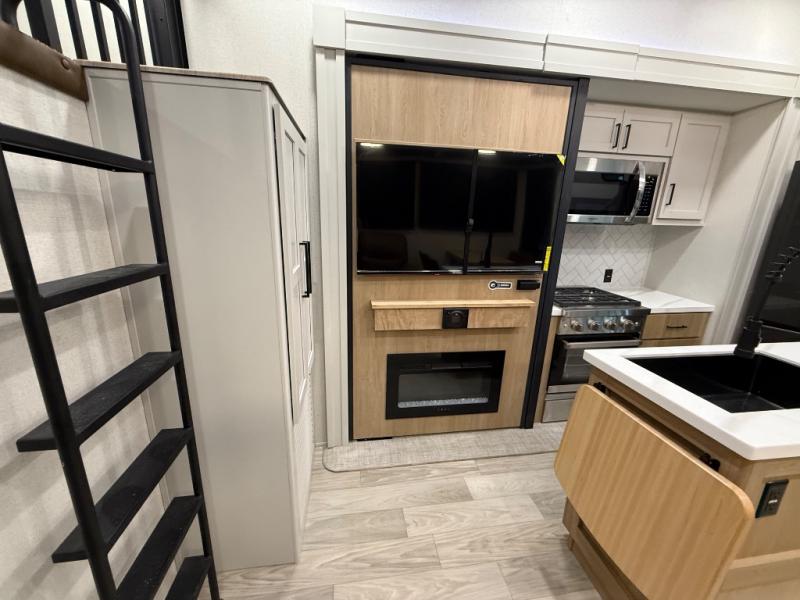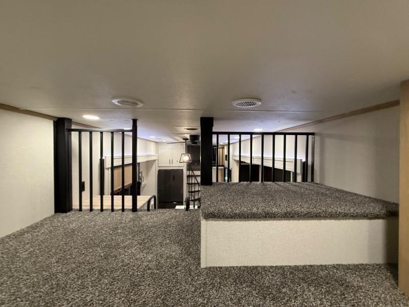 You won't believe the comfort and convenience found in this destination trailer. There are two private bedrooms; one up front with a queen bed slide out and storage space, and one in back with a queen bed slide out and a half bath! There is even washer and dryer prep here if you want to add those appliances and the second entry door is found here so you can easily slip out in the morning. Above each of these rooms is a loft area three total bunk mats, storage cabinets, and TV prep in the front loft if you want to add entertainment. Everyone can meet in the combined kitchen and living room that includes dual opposing slides, theater seating across from the 50" flat screen TV and fireplace, plus a free-standing dinette with chairs and bench seating. The chef of your group will love the large kitchen island with a countertop extension, a 16.2 cu. ft. 12V refrigerator, a hidden pantry, and more!
