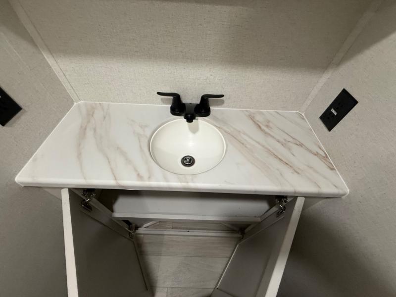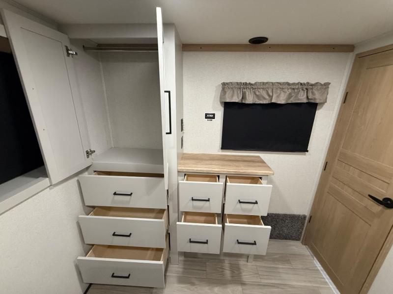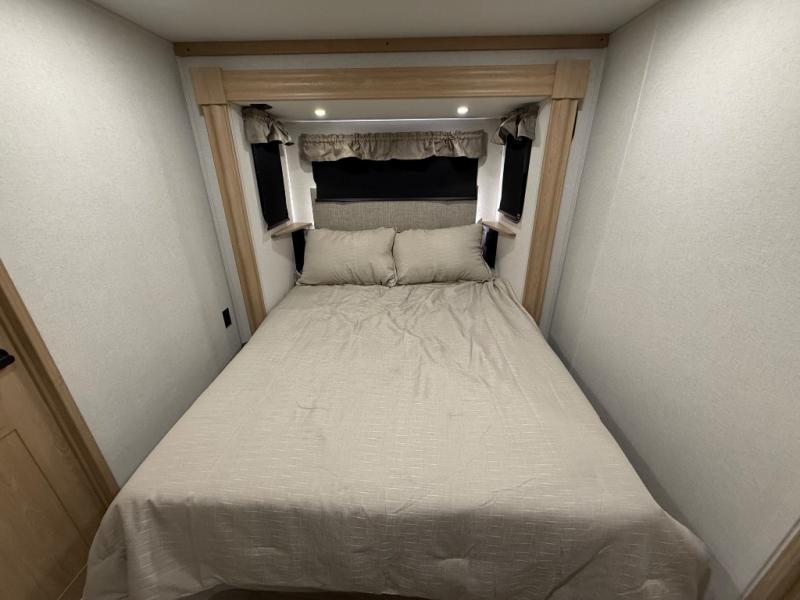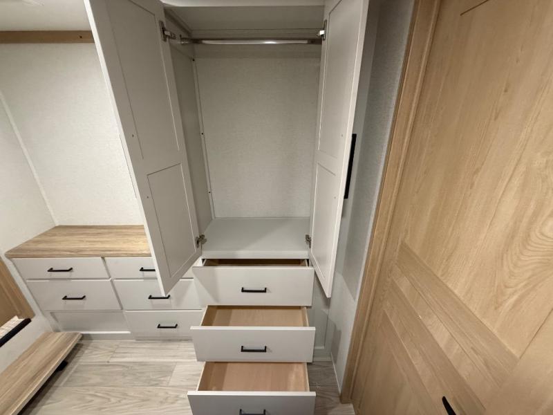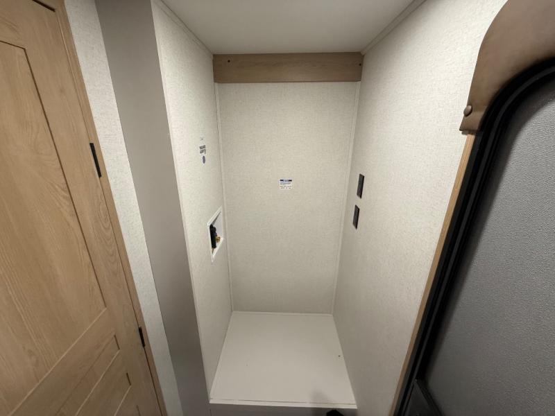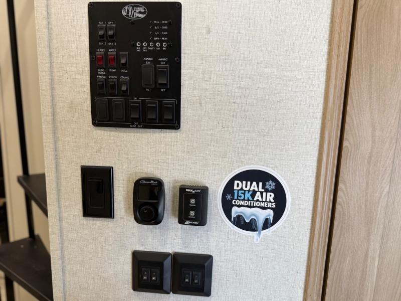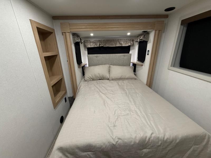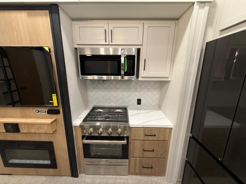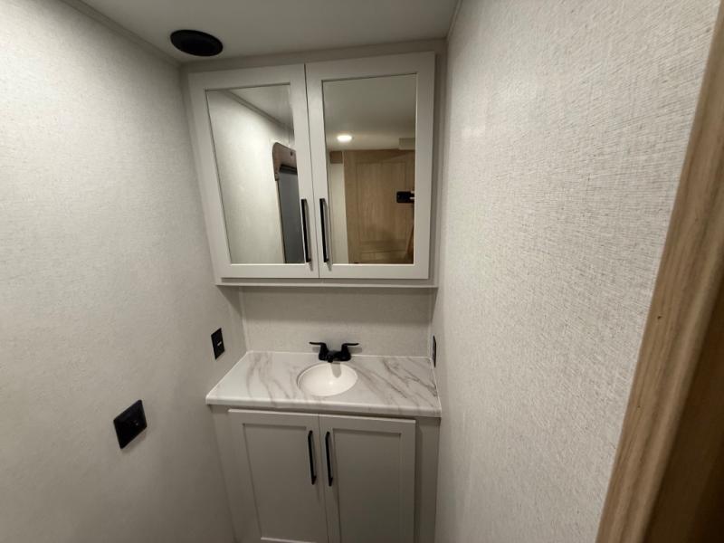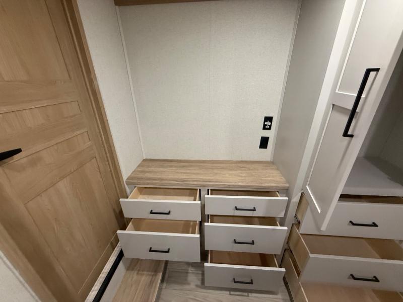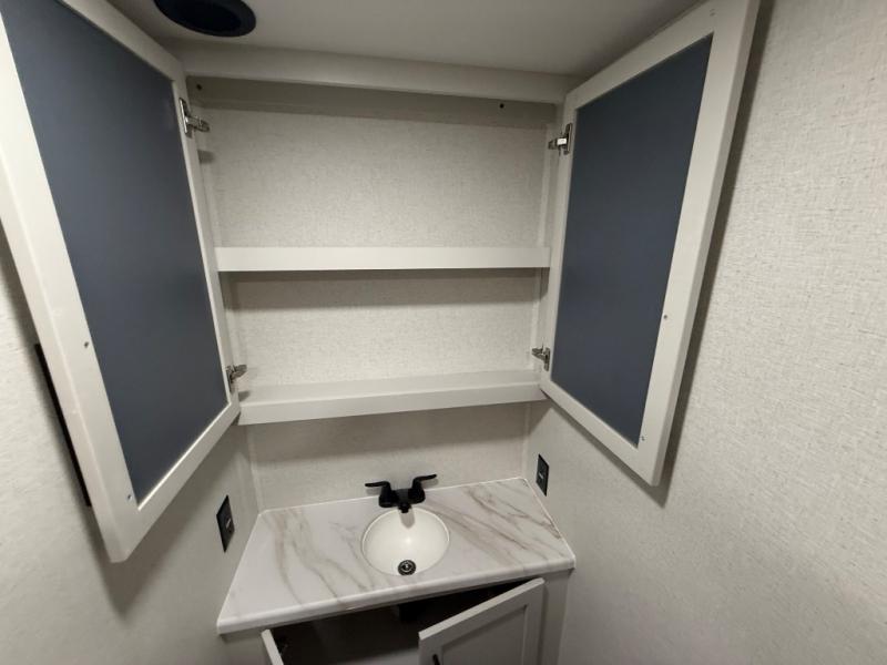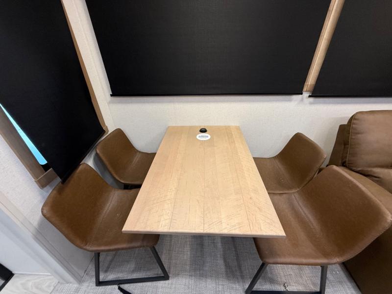 You won't believe the comfort and convenience found in this destination trailer. There are two private bedrooms; one up front with a queen bed slide out and storage space, and one in back with a queen bed slide out and a half bath! There is even washer and dryer prep here if you want to add those appliances and the second entry door is found here so you can easily slip out in the morning. Above each of these rooms is a loft area three total bunk mats, storage cabinets, and TV prep in the front loft if you want to add entertainment. Everyone can meet in the combined kitchen and living room that includes dual opposing slides, theater seating across from the 50" flat screen TV and fireplace, plus a free-standing dinette with chairs and bench seating. The chef of your group will love the large kitchen island with a countertop extension, a 16.2 cu. ft. 12V refrigerator, a hidden pantry, and more!
