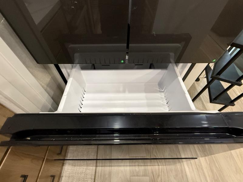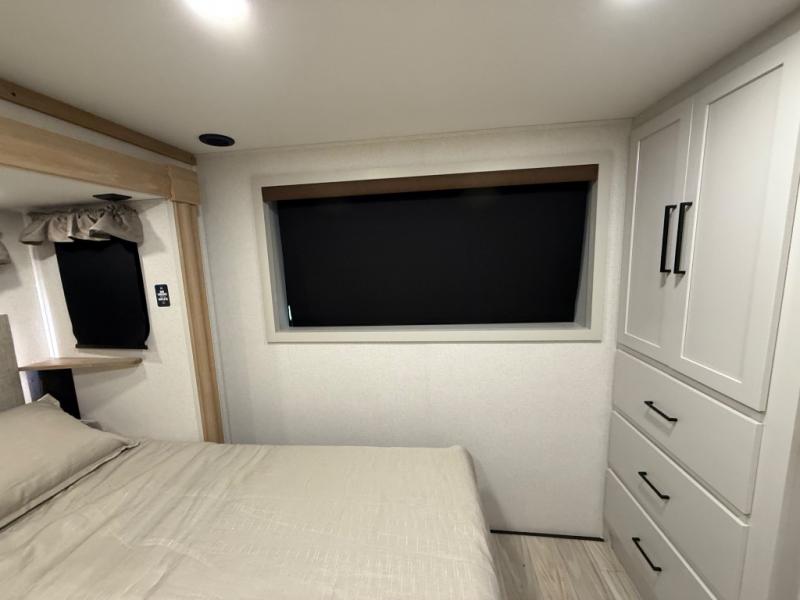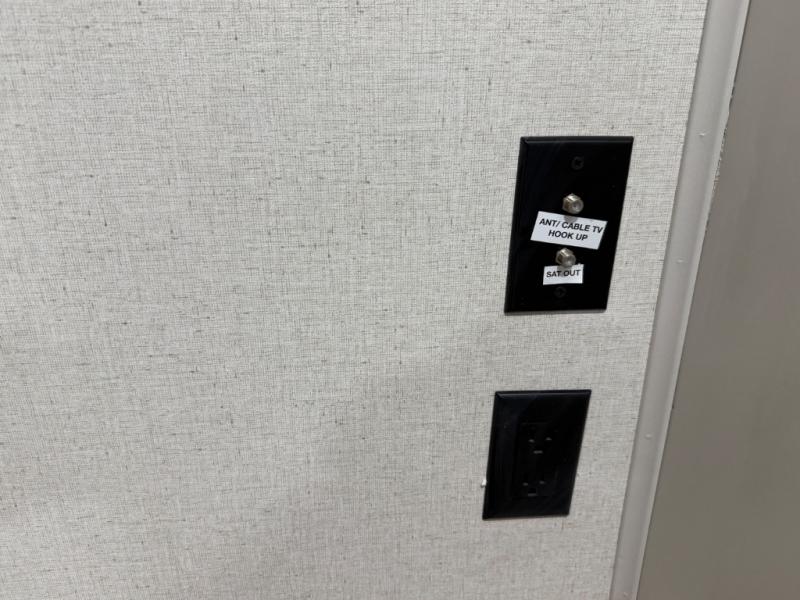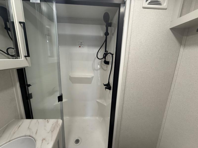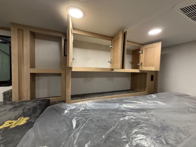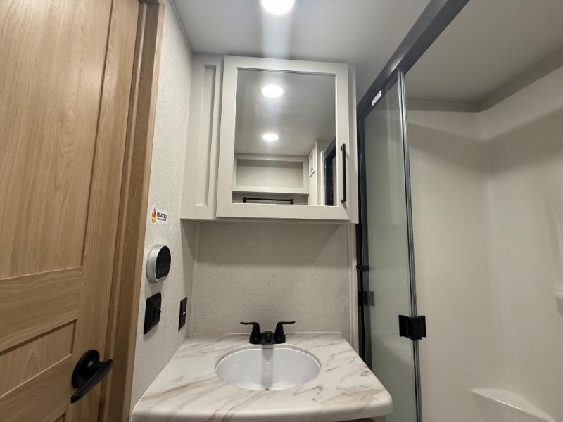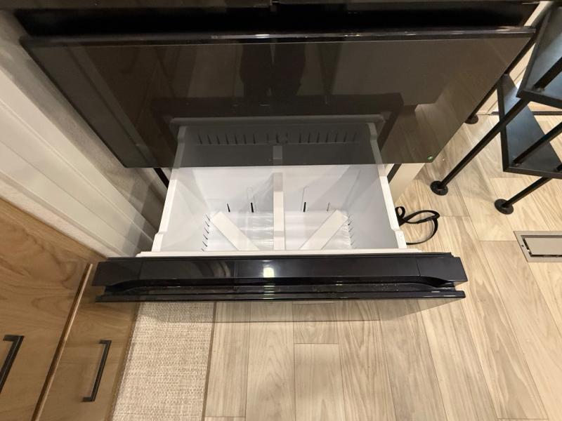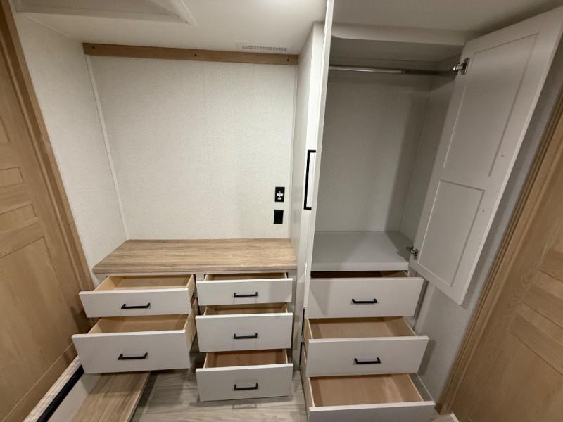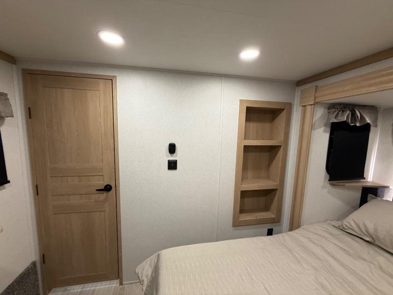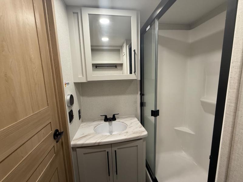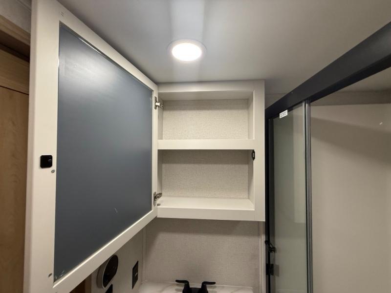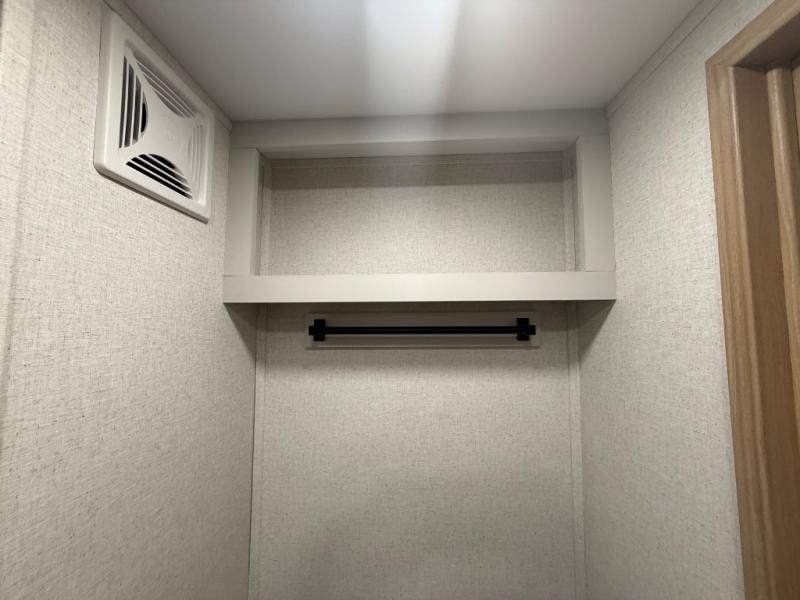 You won't believe the comfort and convenience found in this destination trailer. There are two private bedrooms; one up front with a queen bed slide out and storage space, and one in back with a queen bed slide out and a half bath! There is even washer and dryer prep here if you want to add those appliances and the second entry door is found here so you can easily slip out in the morning. Above each of these rooms is a loft area three total bunk mats, storage cabinets, and TV prep in the front loft if you want to add entertainment. Everyone can meet in the combined kitchen and living room that includes dual opposing slides, theater seating across from the 50" flat screen TV and fireplace, plus a free-standing dinette with chairs and bench seating. The chef of your group will love the large kitchen island with a countertop extension, a 16.2 cu. ft. 12V refrigerator, a hidden pantry, and more!
