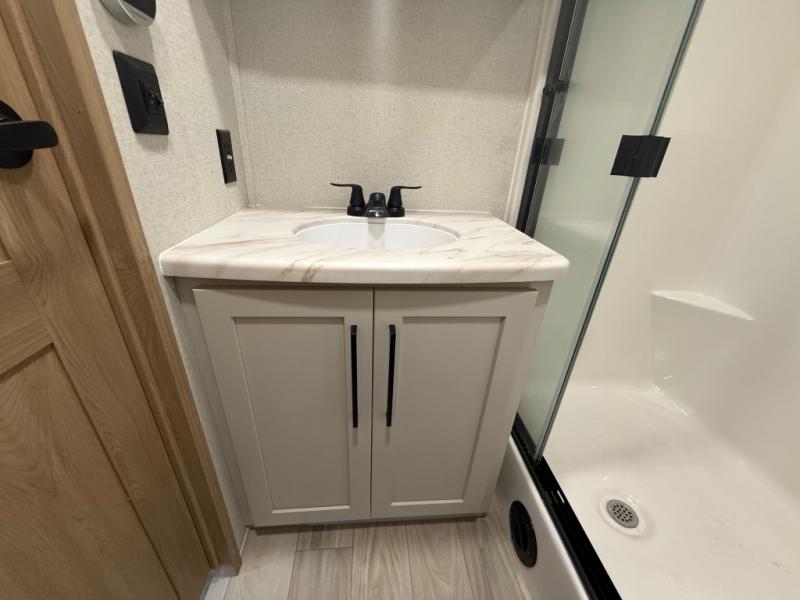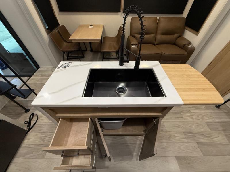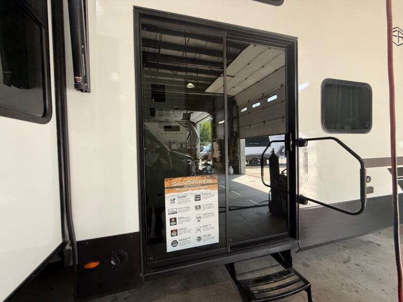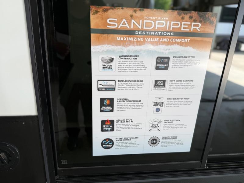 The Sandpiper Destination Trailers by Forest River are ready for extended stays at the location of your choice! The cambered powder coated frame with rust prohibitor will help extend the life of your RV and the Underbelly Armor will protect your trailer and provide better insulation. There are also color matched exterior fiberglass sidewalls outside, along with rain gutters with extra long drip spouts to prevent black streaking, and an exterior porch light just like at home. The Destination Package includes features to make your trips hassle-free, like the two 15,000 BTU A/C units, on-demand water heater, and Chef Collection three burner 24" range. A commercial style kitchen faucet and designer backsplash is included with the Extended Stay Package, as well as solid surface countertops, and a stainless steel apron sink with a strainer to name a few comforts. Available options include a central vacuum system, stabilizer jacks, plus dual pane windows and more!