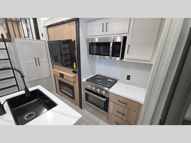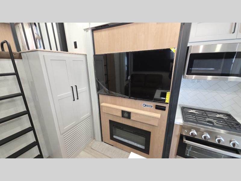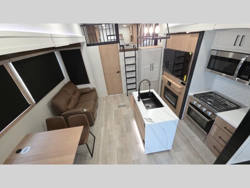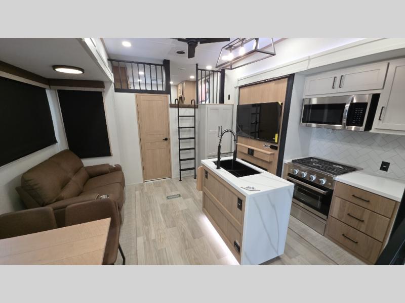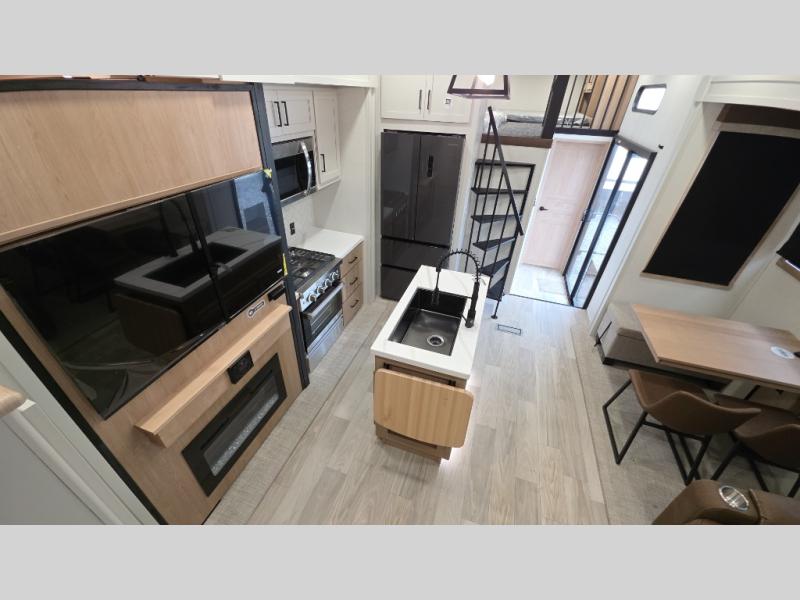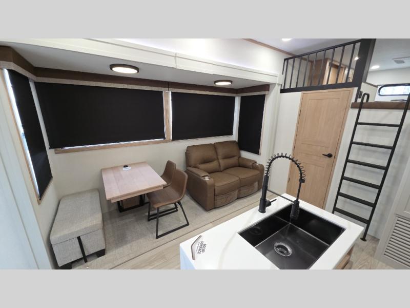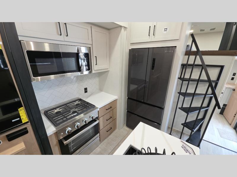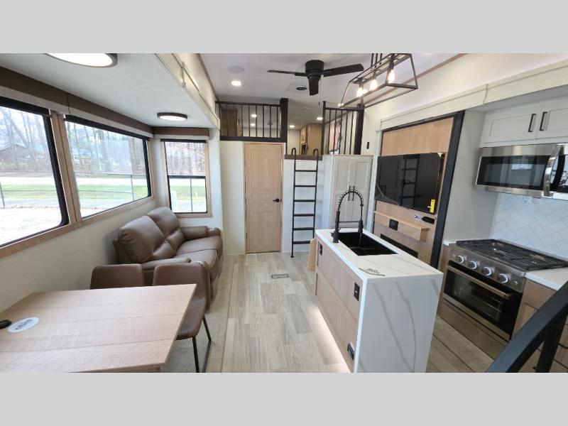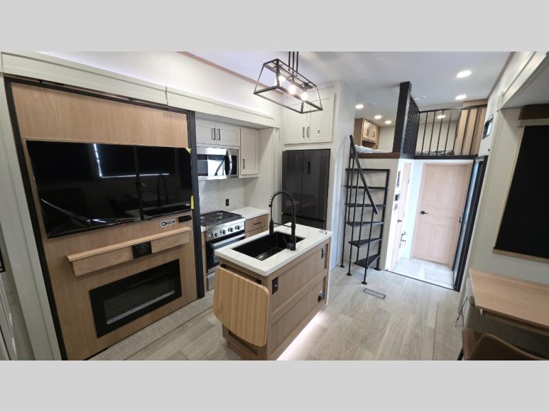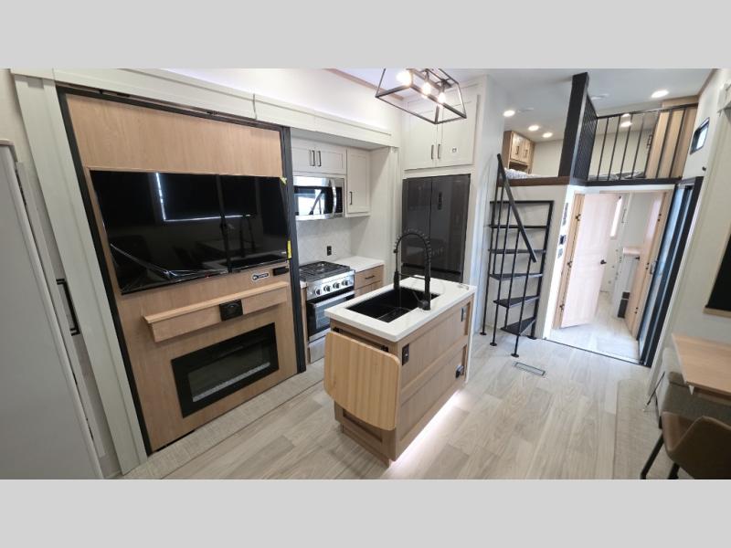 You won't believe the comfort and convenience found in this destination trailer. There are two private bedrooms; one up front with a queen bed slide out and storage space, and one in back with a queen bed slide out and a half bath! There is even washer and dryer prep here if you want to add those appliances and the second entry door is also found in this location so you can easily slip out in the morning. Above each of these rooms is a loft providing three total bunk mats for sleeping, storage cabinets, and TV prep if you want to add entertainment. Everyone can meet in the combined kitchen and living room that includes dual opposing slides, a 60" theater seating across from a 50" flat screen TV and fireplace, plus a free-standing table with chairs and a bench to dine at. The chef of your group will love the large kitchen island, Chef Collection three burner range, and a 16.2 cu. ft. refrigerator for food storage.