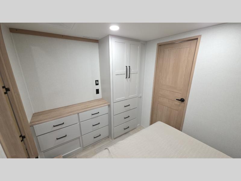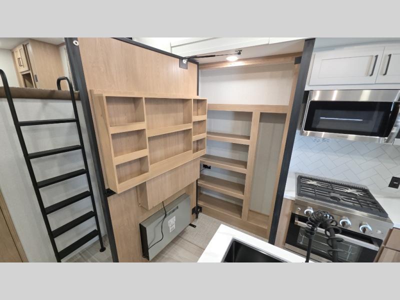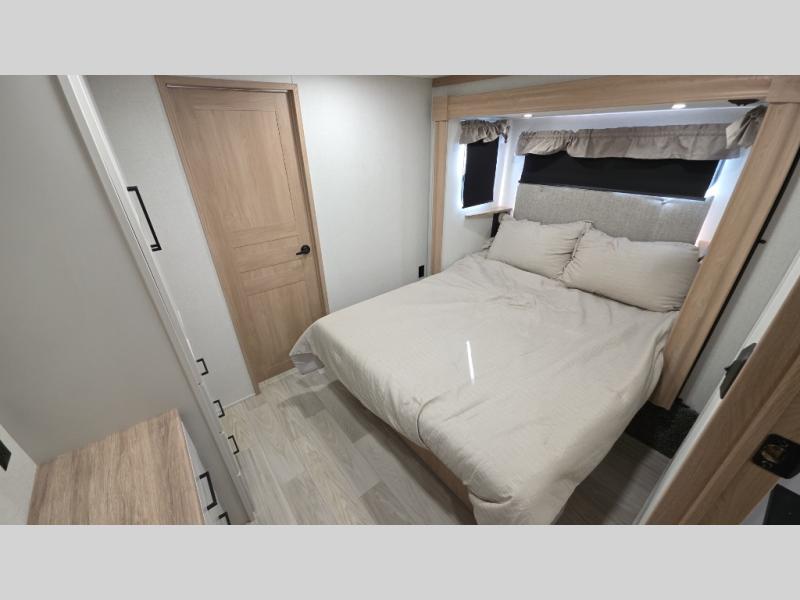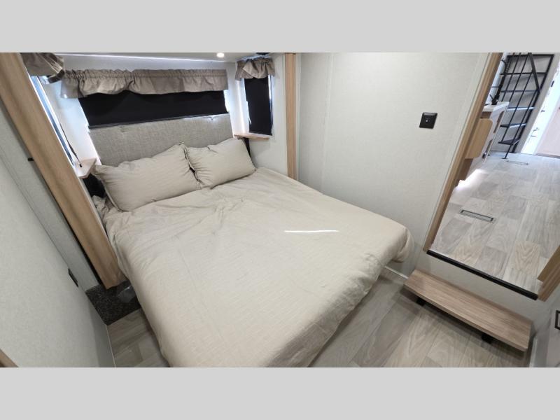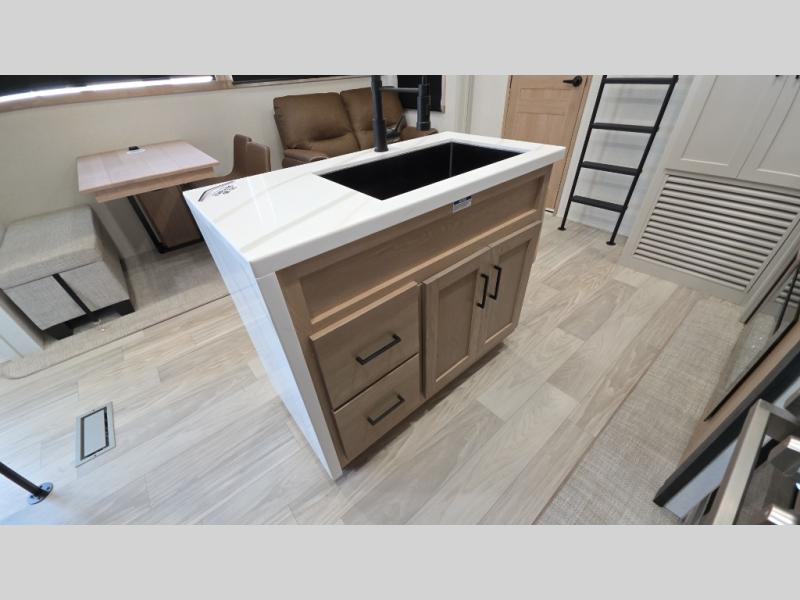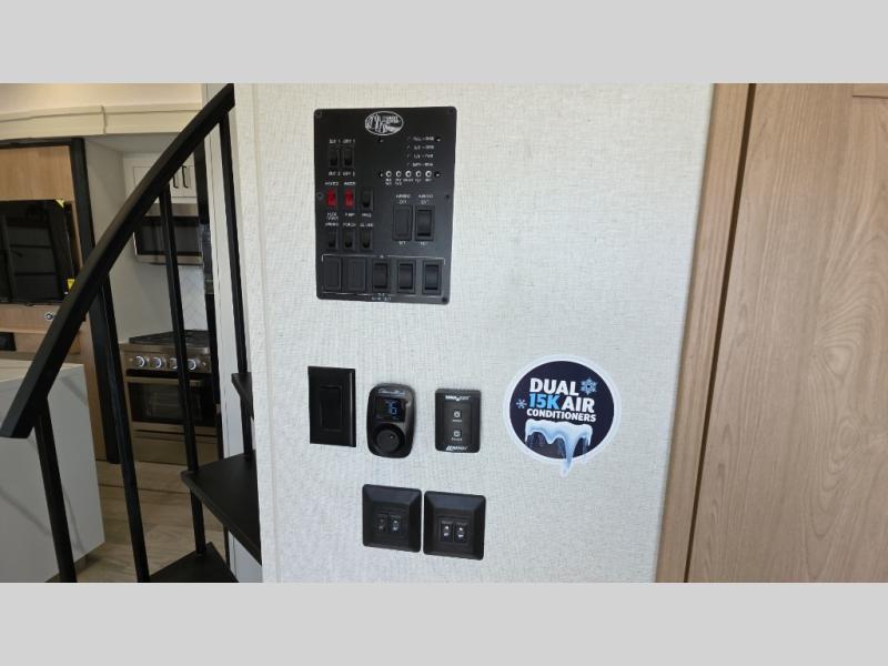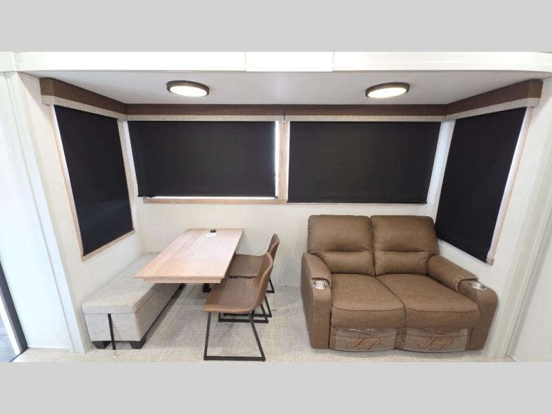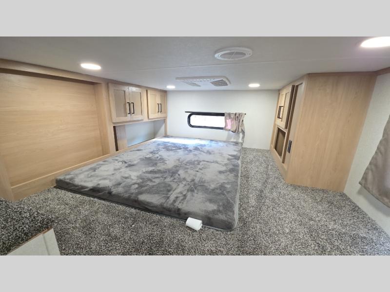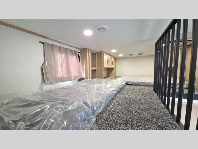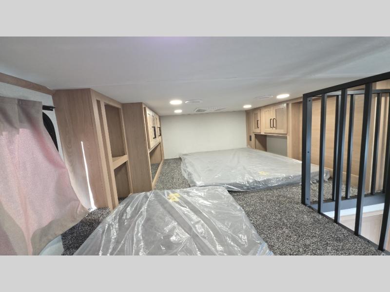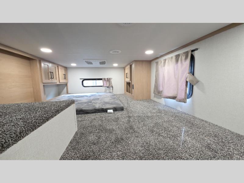 You won't believe the comfort and convenience found in this destination trailer. There are two private bedrooms; one up front with a queen bed slide out and storage space, and one in back with a queen bed slide out and a half bath! There is even washer and dryer prep here if you want to add those appliances and the second entry door is also found in this location so you can easily slip out in the morning. Above each of these rooms is a loft providing three total bunk mats for sleeping, storage cabinets, and TV prep if you want to add entertainment. Everyone can meet in the combined kitchen and living room that includes dual opposing slides, a 60" theater seating across from a 50" flat screen TV and fireplace, plus a free-standing table with chairs and a bench to dine at. The chef of your group will love the large kitchen island, Chef Collection three burner range, and a 16.2 cu. ft. refrigerator for food storage.