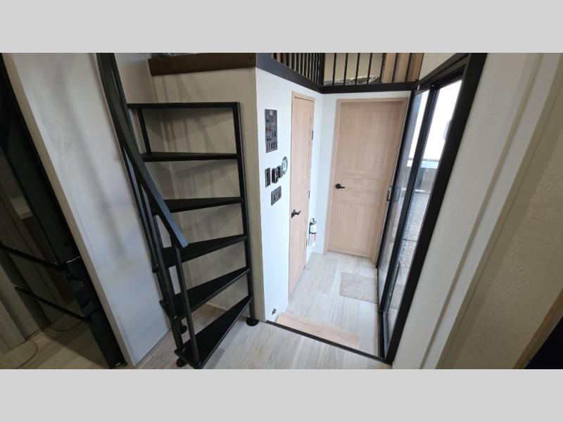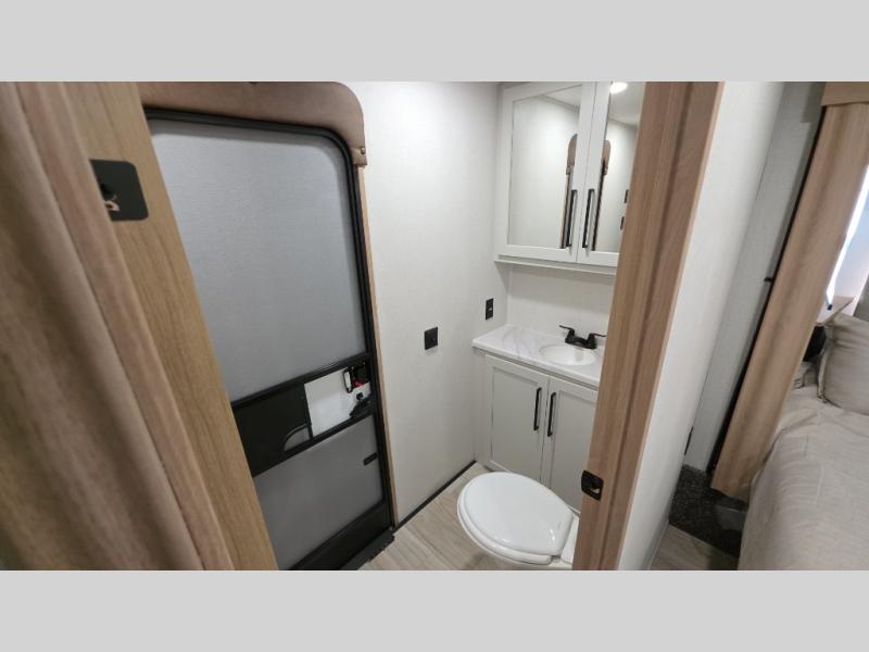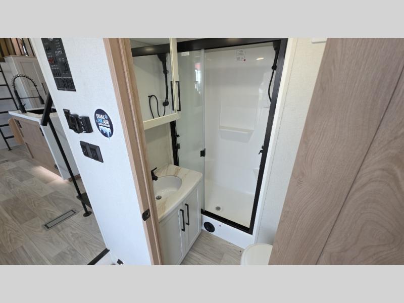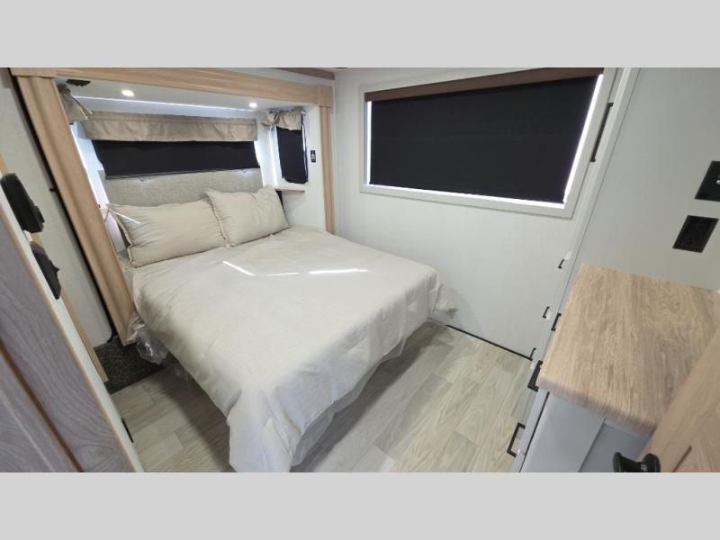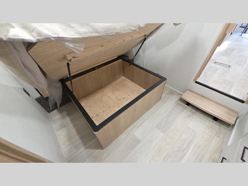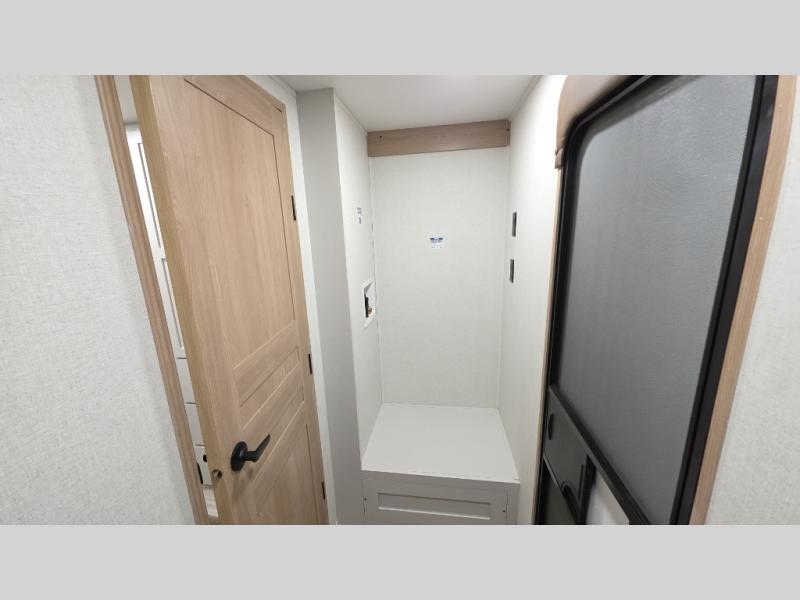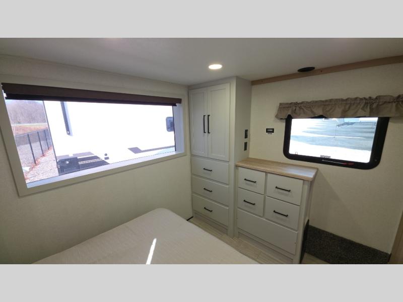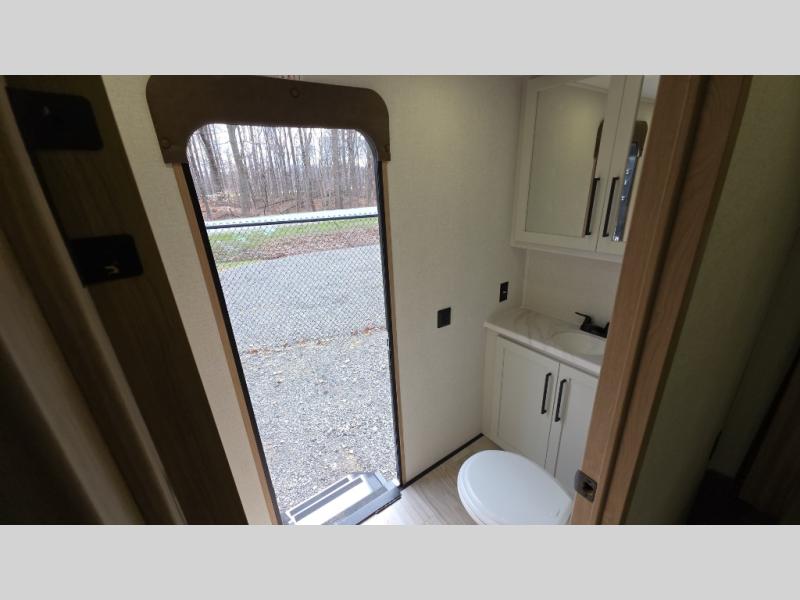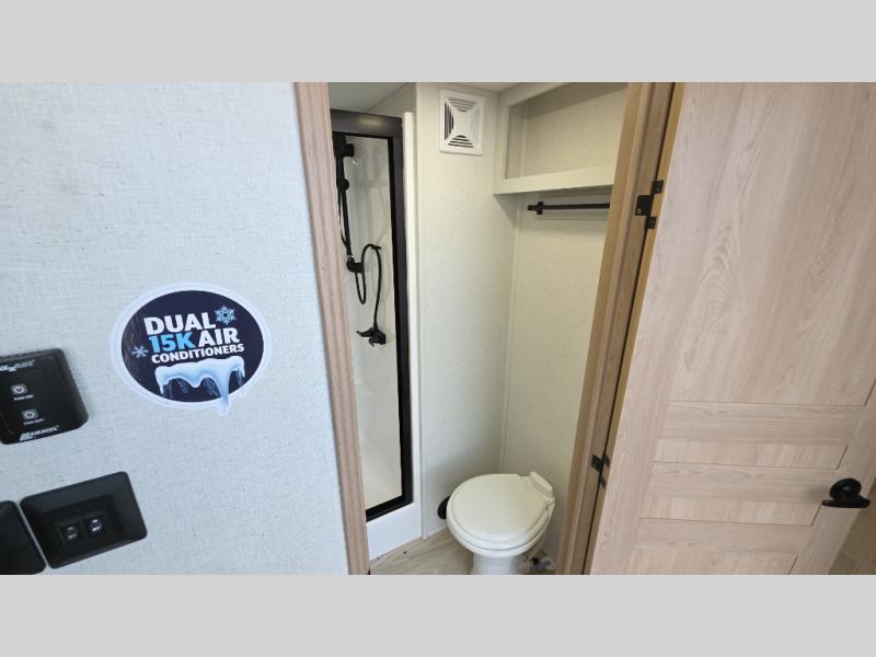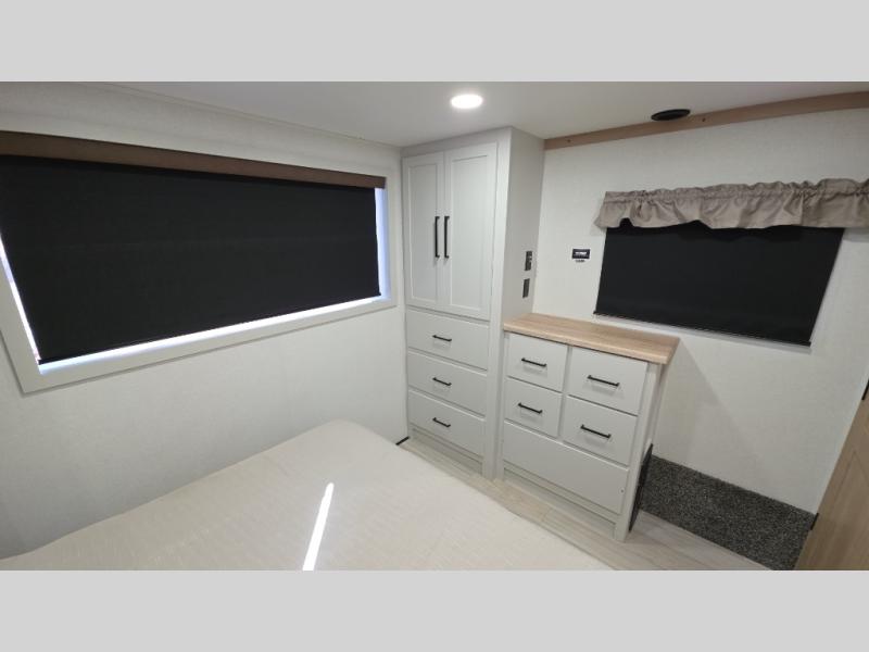 You won't believe the comfort and convenience found in this destination trailer. There are two private bedrooms; one up front with a queen bed slide out and storage space, and one in back with a queen bed slide out and a half bath! There is even washer and dryer prep here if you want to add those appliances and the second entry door is also found in this location so you can easily slip out in the morning. Above each of these rooms is a loft providing three total bunk mats for sleeping, storage cabinets, and TV prep if you want to add entertainment. Everyone can meet in the combined kitchen and living room that includes dual opposing slides, a 60" theater seating across from a 50" flat screen TV and fireplace, plus a free-standing table with chairs and a bench to dine at. The chef of your group will love the large kitchen island, Chef Collection three burner range, and a 16.2 cu. ft. refrigerator for food storage.