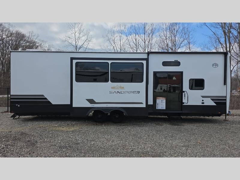 With each Sandpiper Destination Trailer by Forest River you will enjoy many luxurious features, such as crown molding over the kitchen cabinets, solid surface kitchen countertops, a memory foam mattress, plus so much more. The extra large picture windows throughout let natural light in and provide beautiful outdoor views, and each model includes three or more slides for added interior space. You'll find many exterior conveniences, like the porch light with an interior switch, the rain gutters with extra long drip spouts to prevent black streaking, and an electric awning with LED light strip, plus more! You will stay comfortable year around with dual 15,000 A/C units plus each model is constructed with an Underbelly Armor for better protection and insulation!