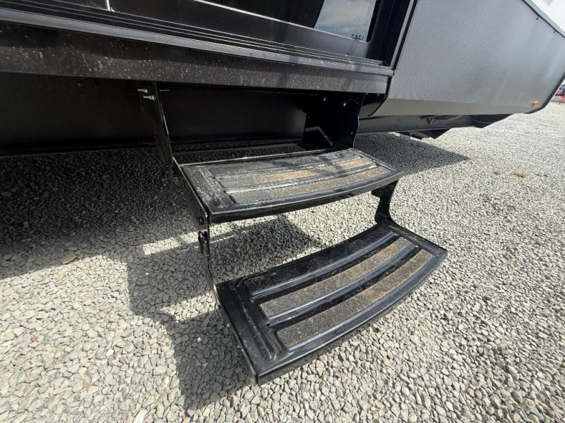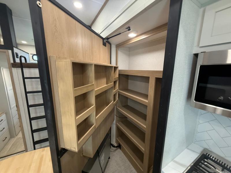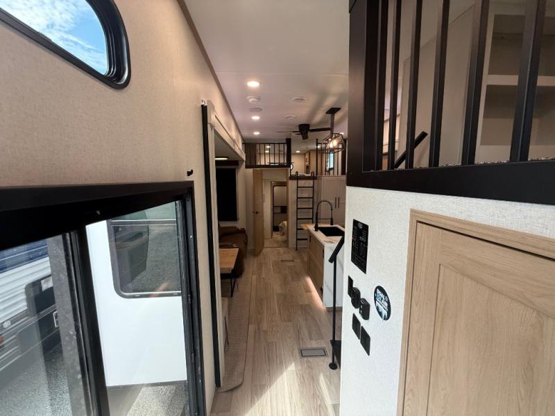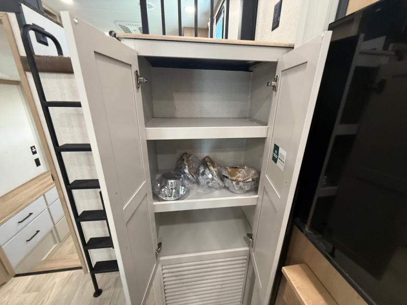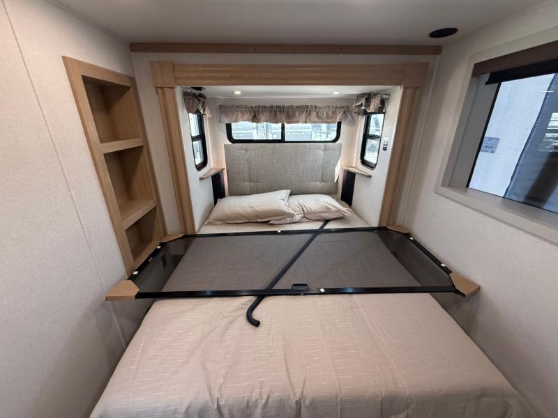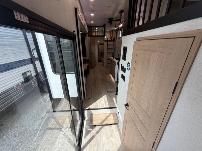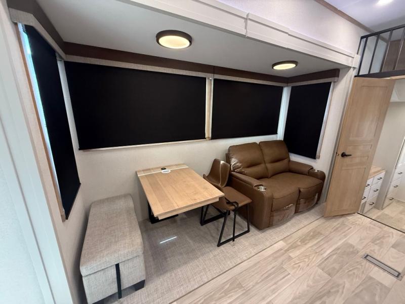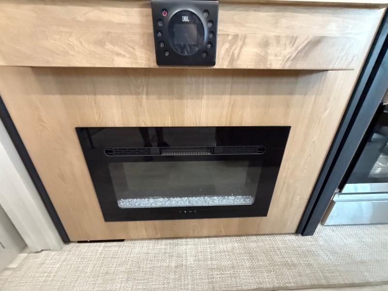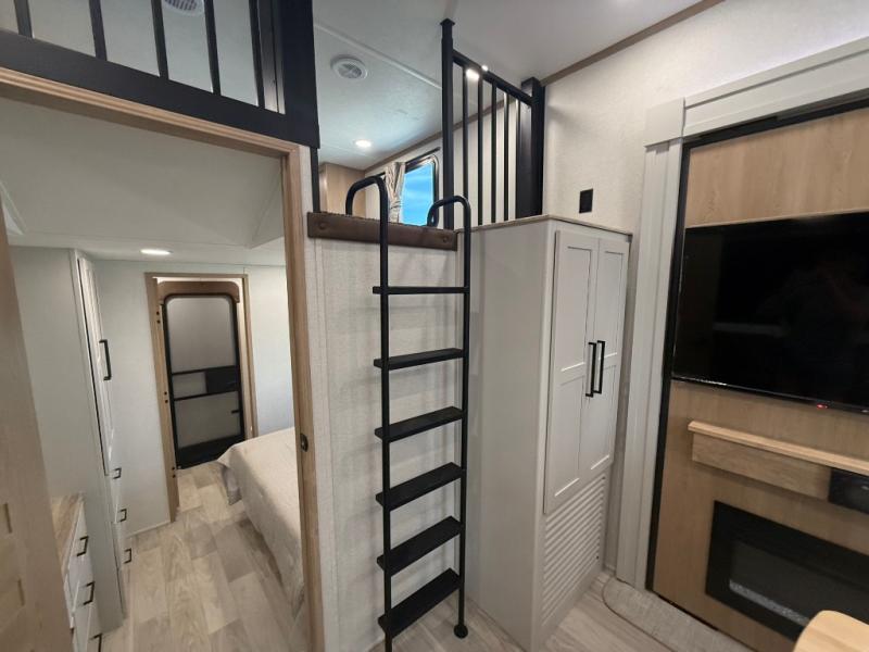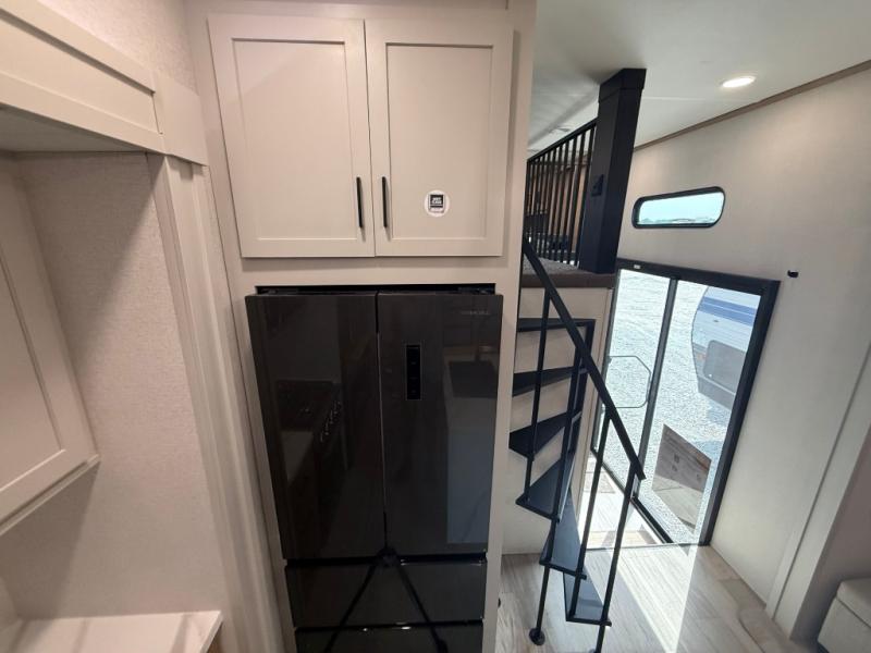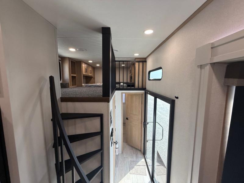 You won't believe the comfort and convenience found in this destination trailer. There are two private bedrooms; one up front with a queen bed slide out and storage space, and one in back with a queen bed slide out and a half bath! There is even washer and dryer prep here if you want to add those appliances and the second entry door is also found in this location so you can easily slip out in the morning. Above each of these rooms is a loft providing three total bunk mats for sleeping, storage cabinets, and TV prep if you want to add entertainment. Everyone can meet in the combined kitchen and living room that includes dual opposing slides, a 60" theater seating across from a 50" flat screen TV and fireplace, plus a free-standing table with chairs and a bench to dine at. The chef of your group will love the large kitchen island, Chef Collection three burner range, and a 16.2 cu. ft. refrigerator for food storage.
