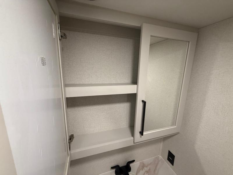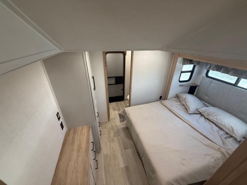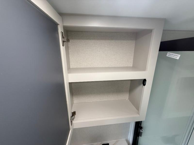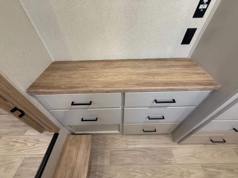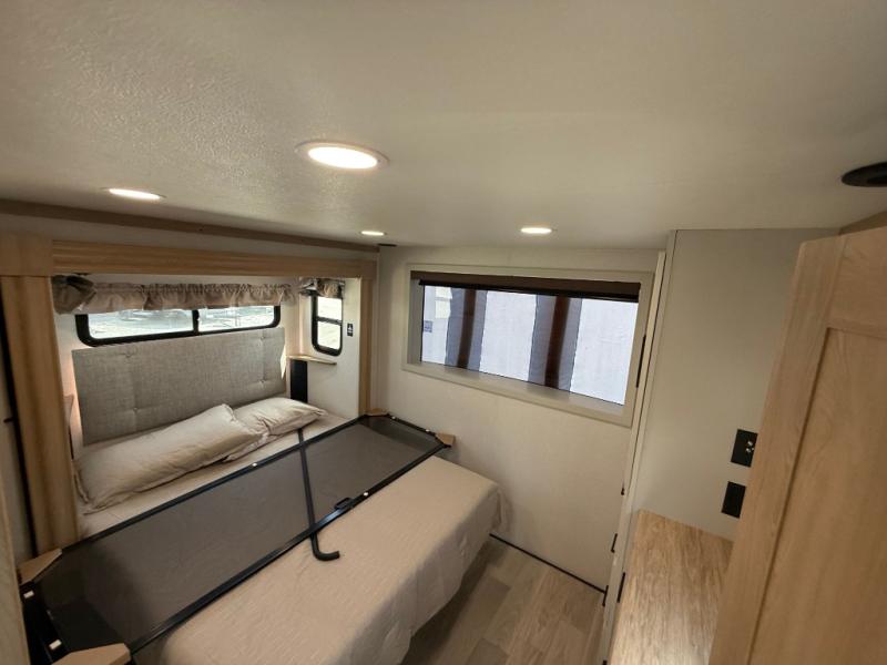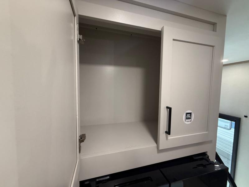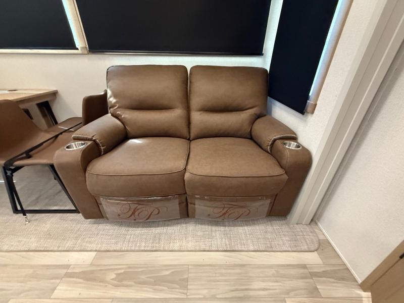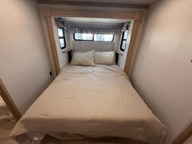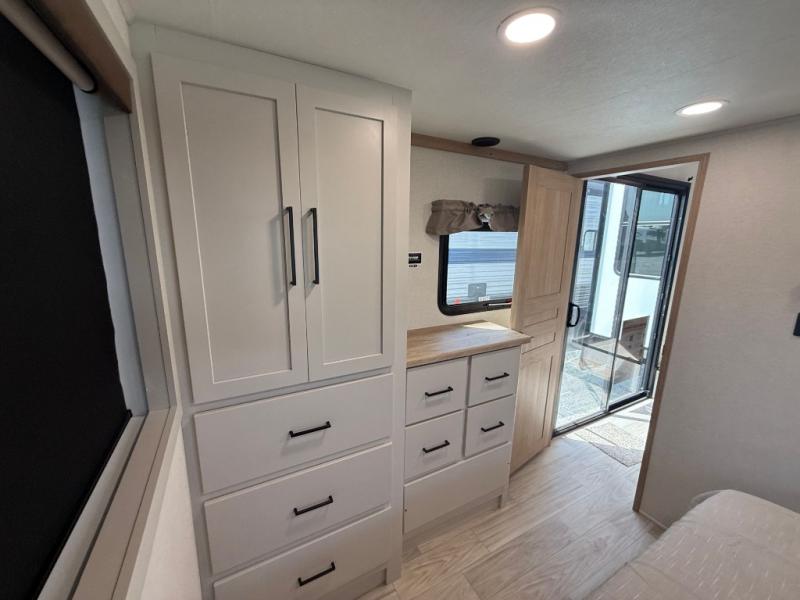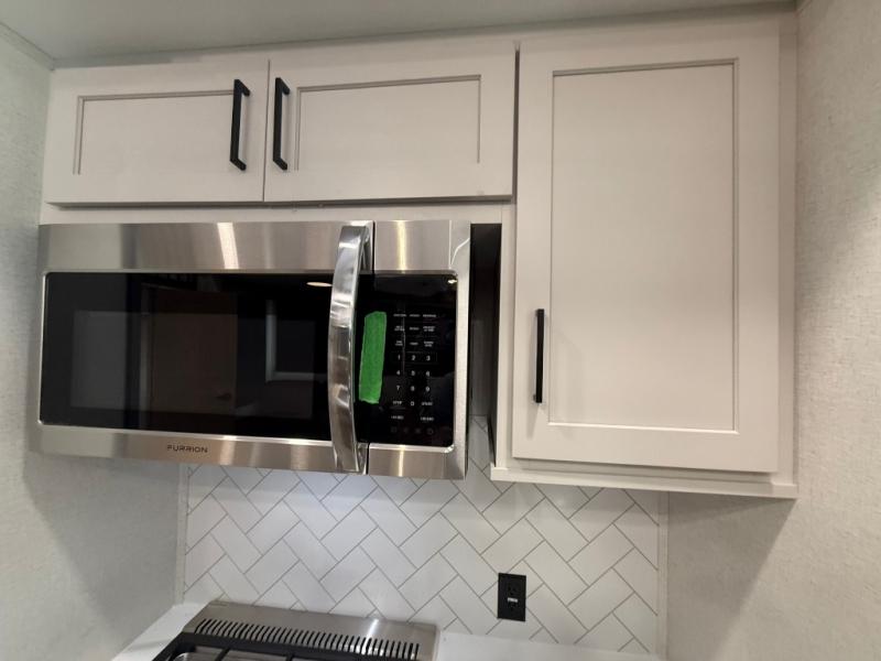 You won't believe the comfort and convenience found in this destination trailer. There are two private bedrooms; one up front with a queen bed slide out and storage space, and one in back with a queen bed slide out and a half bath! There is even washer and dryer prep here if you want to add those appliances and the second entry door is also found in this location so you can easily slip out in the morning. Above each of these rooms is a loft providing three total bunk mats for sleeping, storage cabinets, and TV prep if you want to add entertainment. Everyone can meet in the combined kitchen and living room that includes dual opposing slides, a 60" theater seating across from a 50" flat screen TV and fireplace, plus a free-standing table with chairs and a bench to dine at. The chef of your group will love the large kitchen island, Chef Collection three burner range, and a 16.2 cu. ft. refrigerator for food storage.