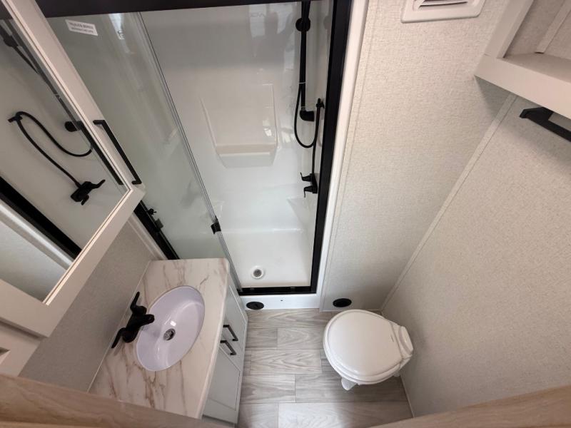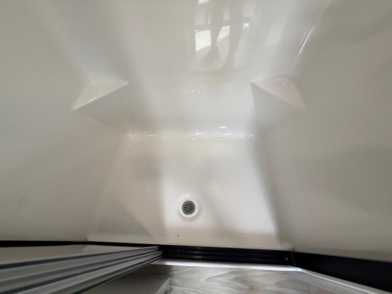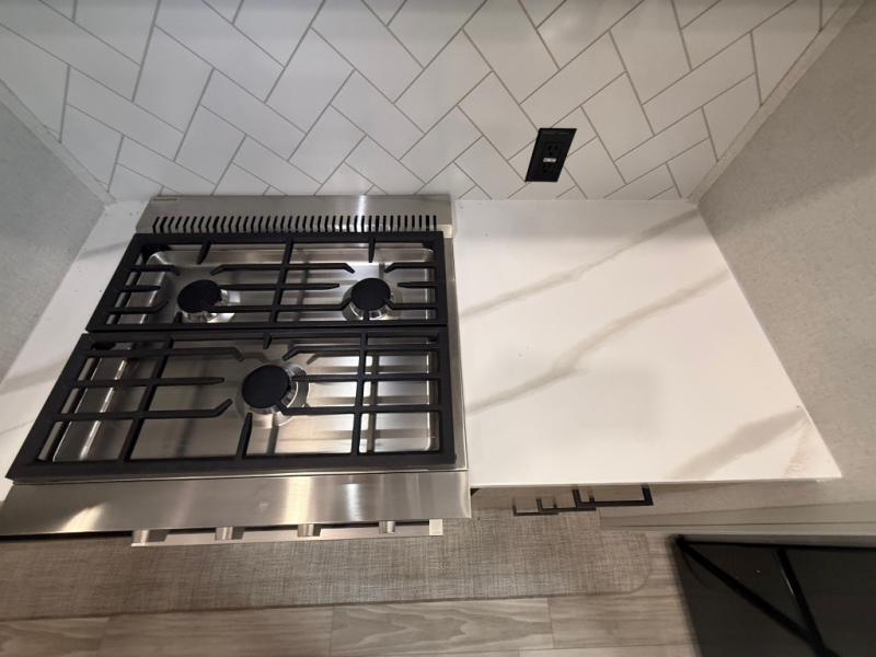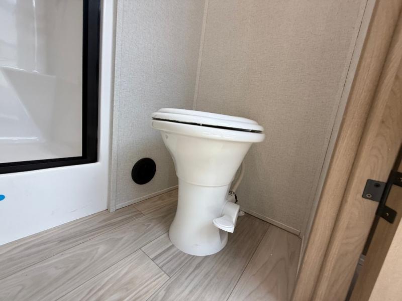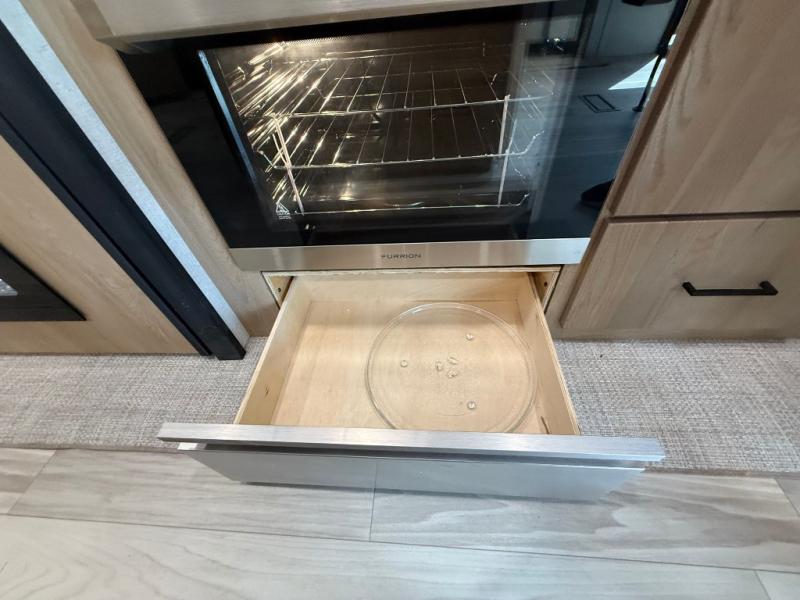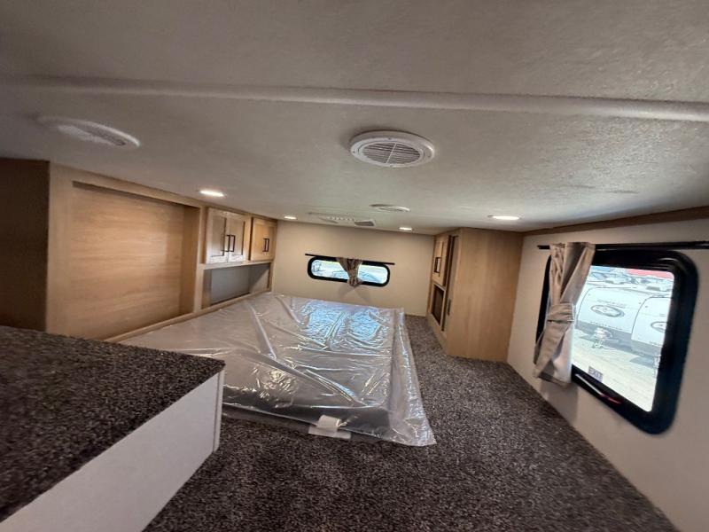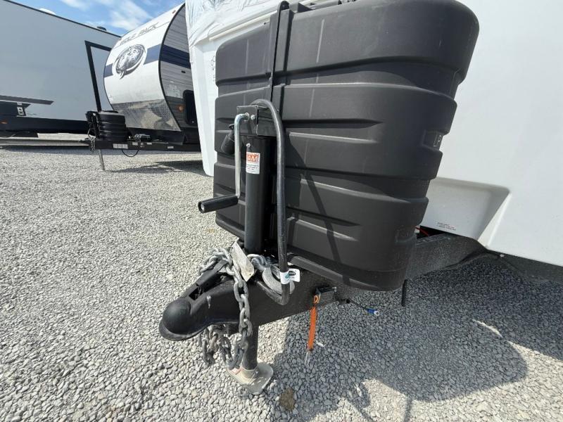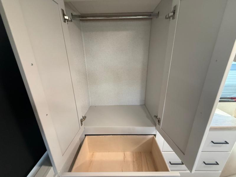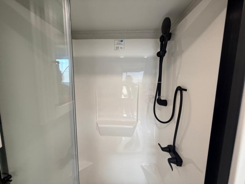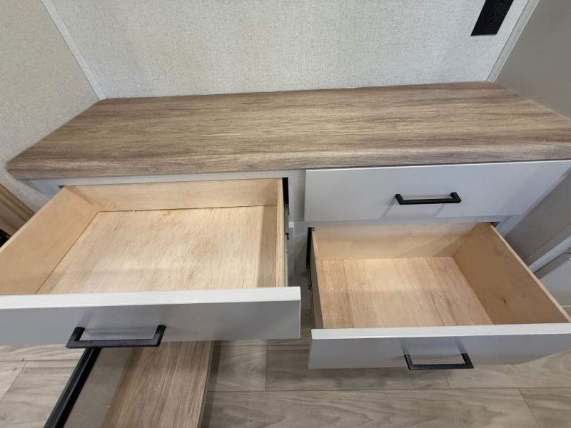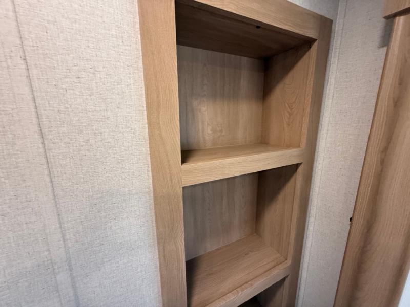 You won't believe the comfort and convenience found in this destination trailer. There are two private bedrooms; one up front with a queen bed slide out and storage space, and one in back with a queen bed slide out and a half bath! There is even washer and dryer prep here if you want to add those appliances and the second entry door is also found in this location so you can easily slip out in the morning. Above each of these rooms is a loft providing three total bunk mats for sleeping, storage cabinets, and TV prep if you want to add entertainment. Everyone can meet in the combined kitchen and living room that includes dual opposing slides, a 60" theater seating across from a 50" flat screen TV and fireplace, plus a free-standing table with chairs and a bench to dine at. The chef of your group will love the large kitchen island, Chef Collection three burner range, and a 16.2 cu. ft. refrigerator for food storage.