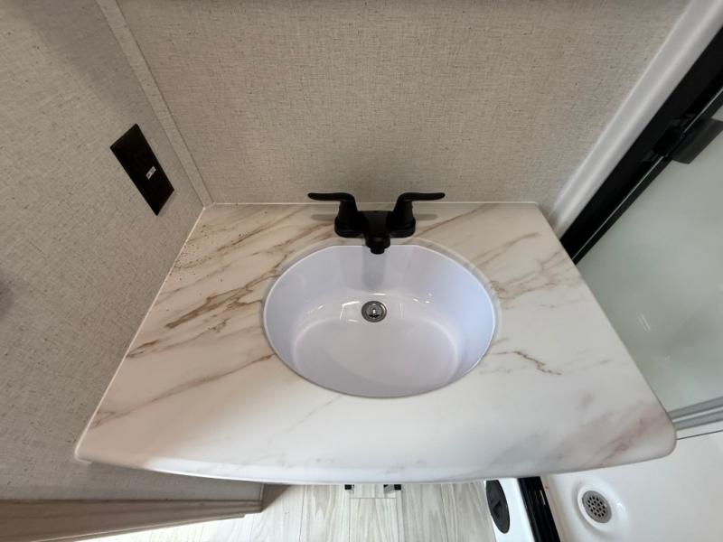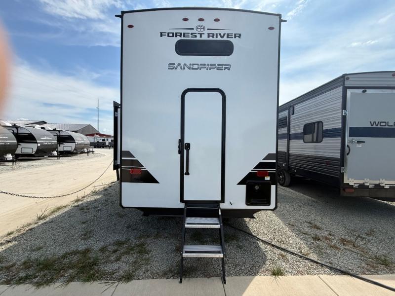 With each Sandpiper Destination Trailer by Forest River you will enjoy many luxurious features, such as crown molding over the kitchen cabinets, solid surface kitchen countertops, a memory foam mattress, plus so much more. The extra large picture windows throughout let natural light in and provide beautiful outdoor views, and each model includes three or more slides for added interior space. You'll find many exterior conveniences, like the porch light with an interior switch, the rain gutters with extra long drip spouts to prevent black streaking, and an electric awning with LED light strip, plus more! You will stay comfortable year around with dual 15,000 A/C units plus each model is constructed with an Underbelly Armor for better protection and insulation!