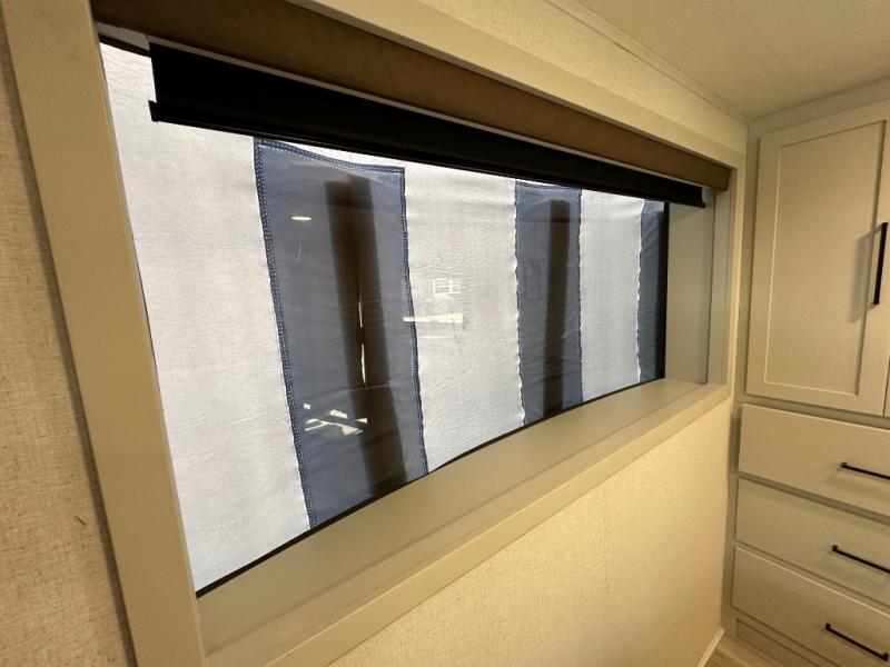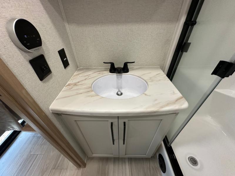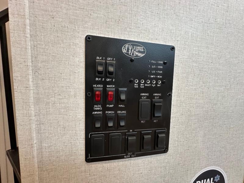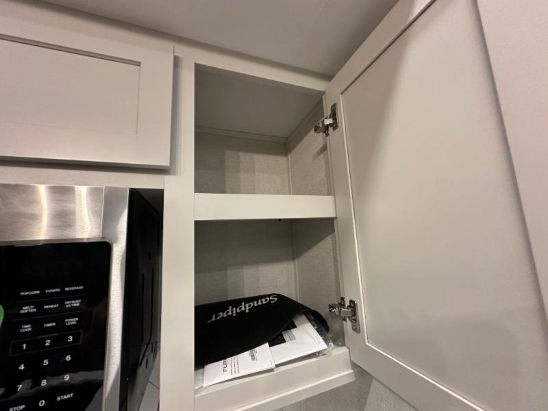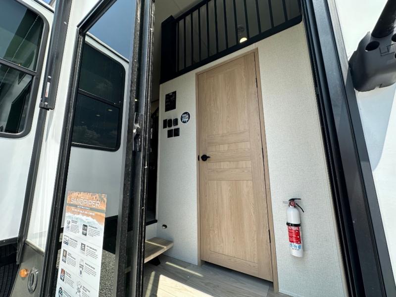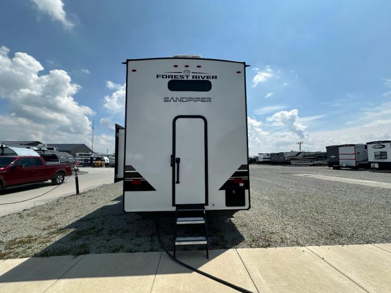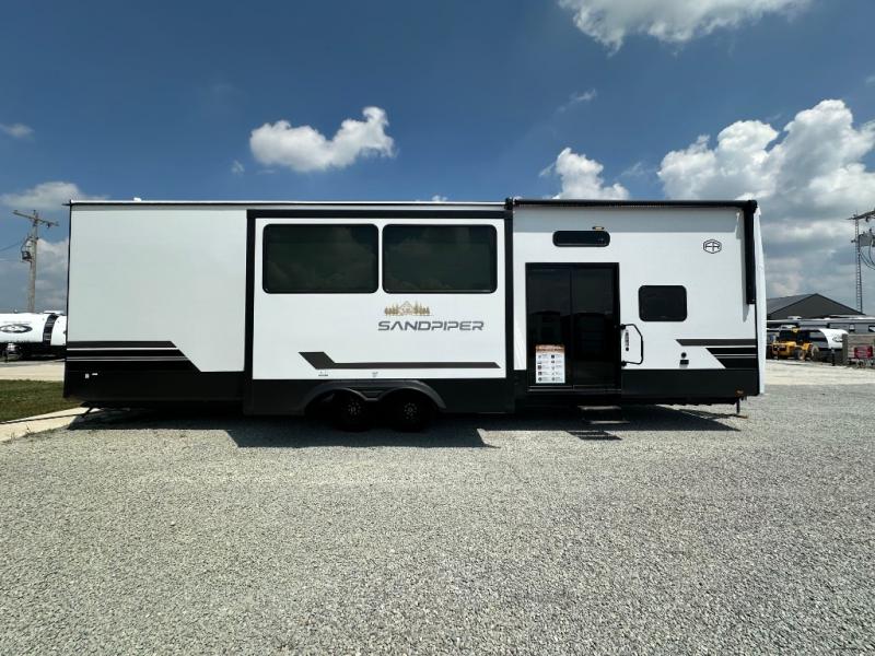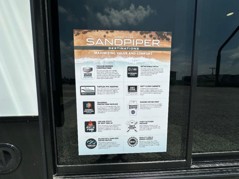 With each Sandpiper Destination Trailer by Forest River you will enjoy many luxurious features, such as crown molding over the kitchen cabinets, solid surface kitchen countertops, a memory foam mattress, plus so much more. The extra large picture windows throughout let natural light in and provide beautiful outdoor views, and each model includes three or more slides for added interior space. You'll find many exterior conveniences, like the porch light with an interior switch, the rain gutters with extra long drip spouts to prevent black streaking, and an electric awning with LED light strip, plus more! You will stay comfortable year around with dual 15,000 A/C units plus each model is constructed with an Underbelly Armor for better protection and insulation!