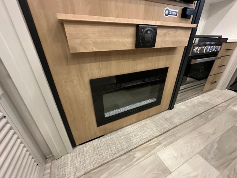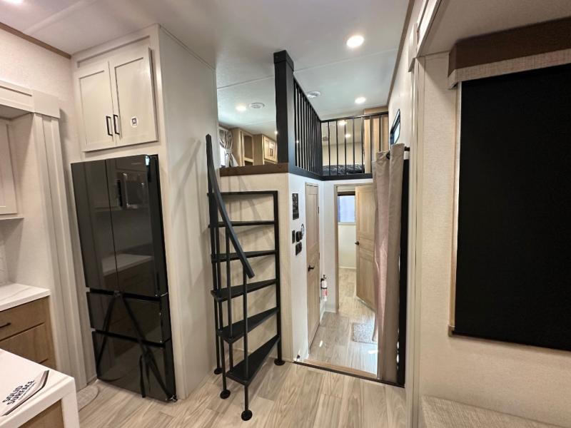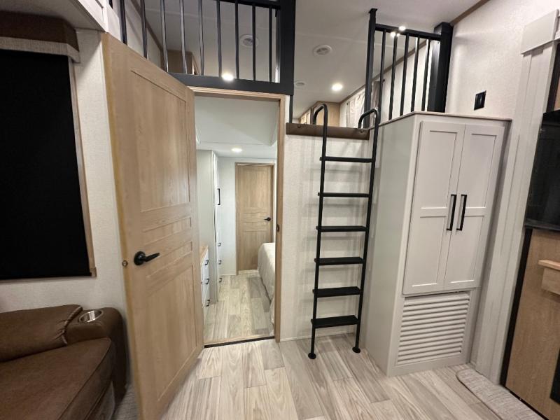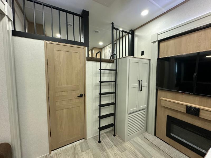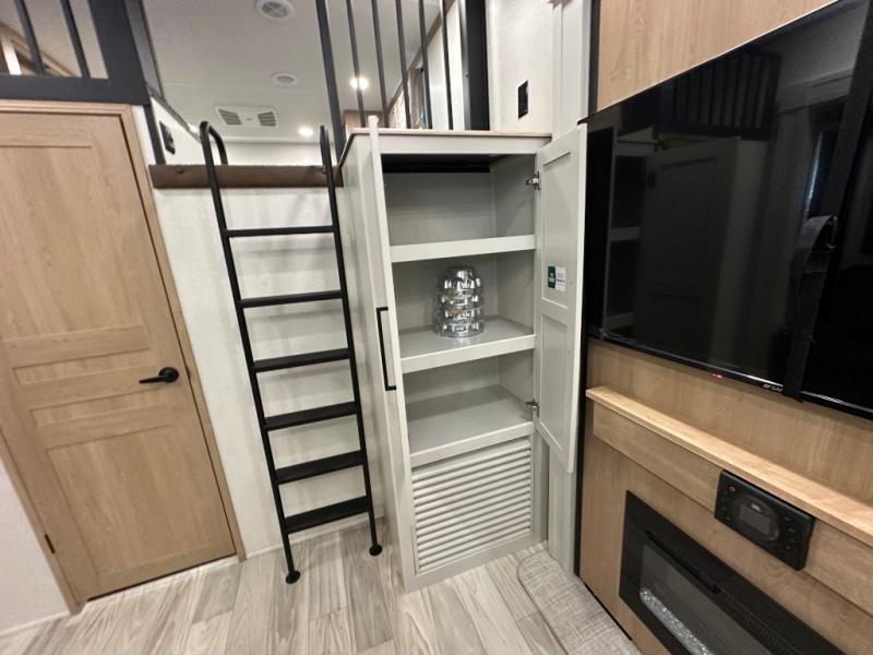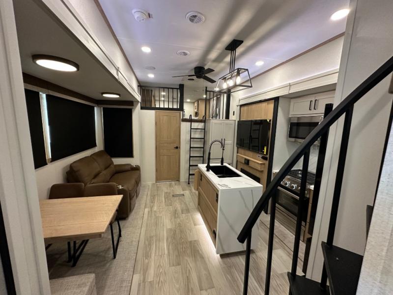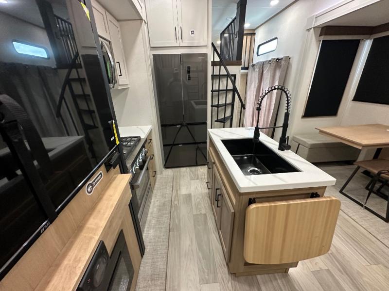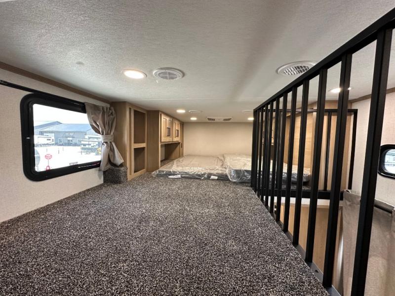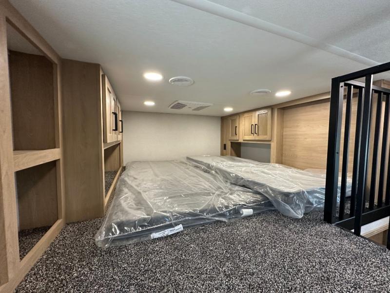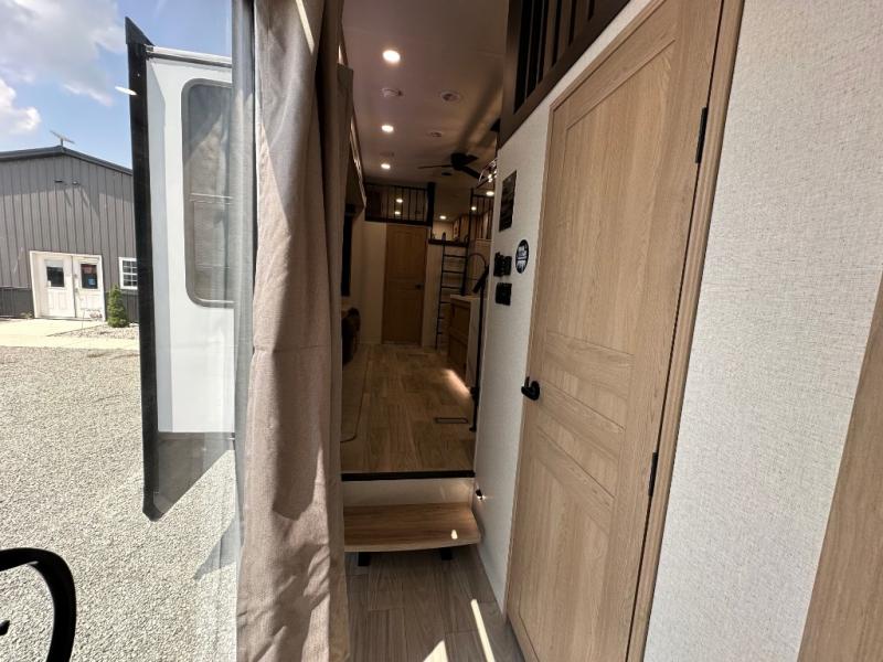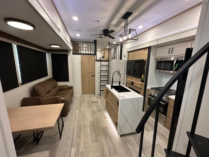 You won't believe the comfort and convenience found in this destination trailer. There are two private bedrooms; one up front with a queen bed slide out and storage space, and one in back with a queen bed slide out and a half bath! There is even washer and dryer prep here if you want to add those appliances and the second entry door is also found in this location so you can easily slip out in the morning. Above each of these rooms is a loft providing three total bunk mats for sleeping, storage cabinets, and TV prep if you want to add entertainment. Everyone can meet in the combined kitchen and living room that includes dual opposing slides, a 60" theater seating across from a 50" flat screen TV and fireplace, plus a free-standing table with chairs and a bench to dine at. The chef of your group will love the large kitchen island, Chef Collection three burner range, and a 16.2 cu. ft. refrigerator for food storage.