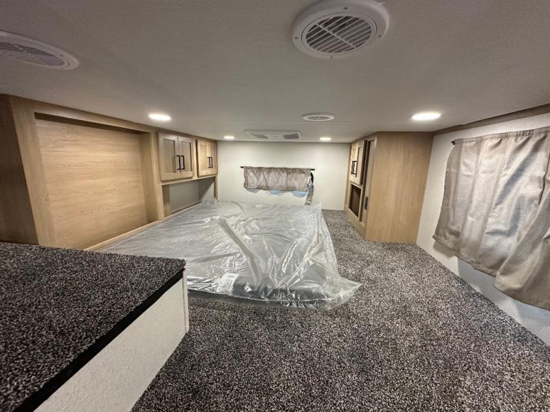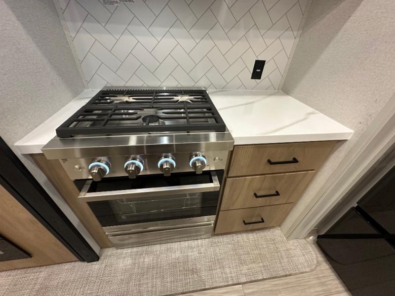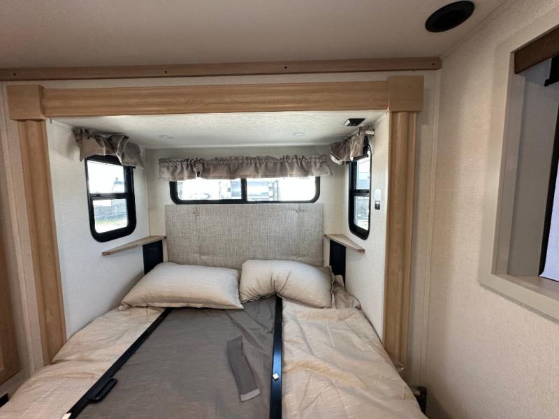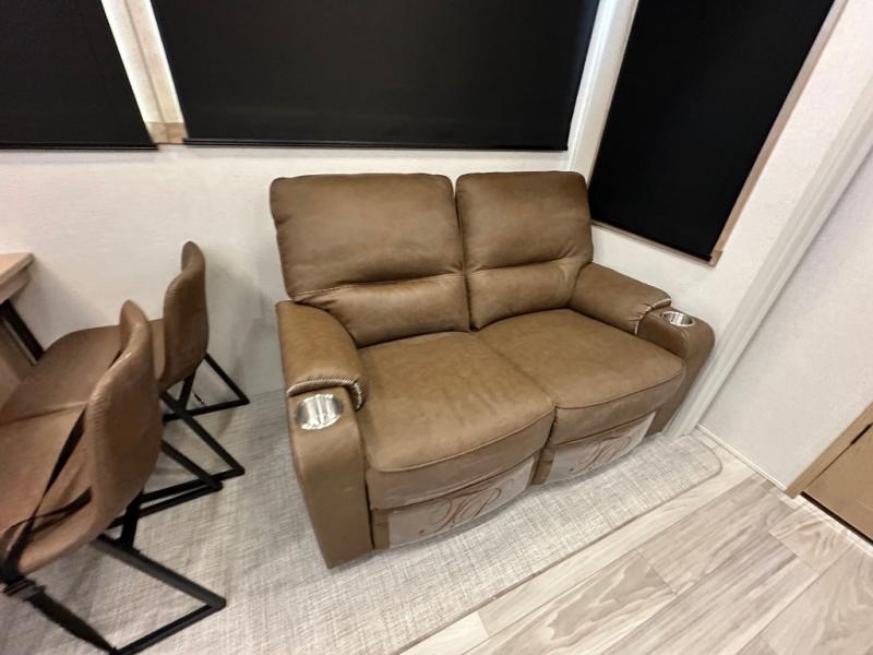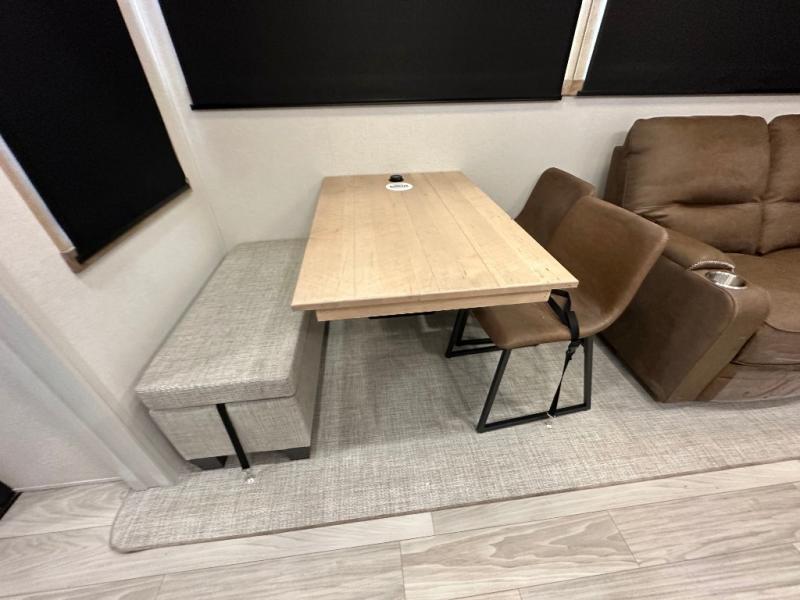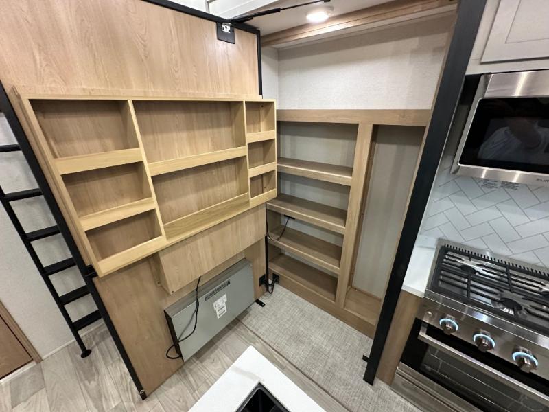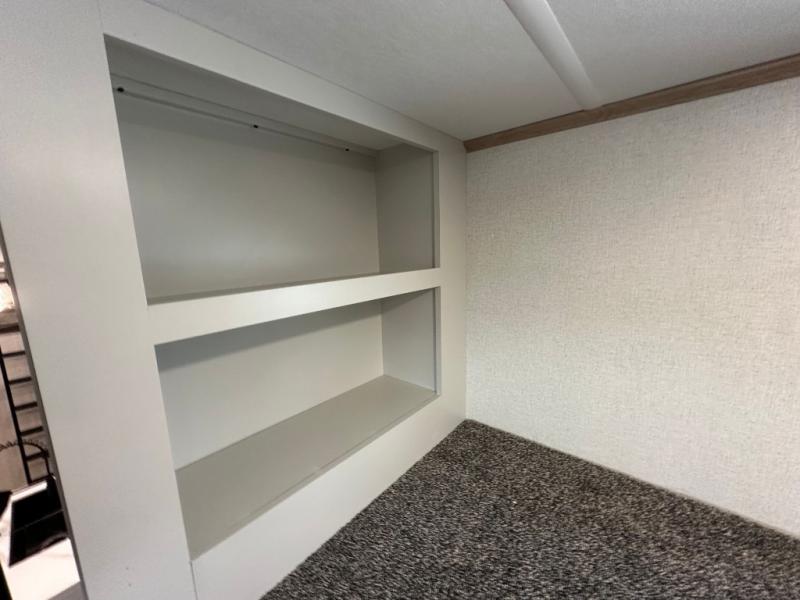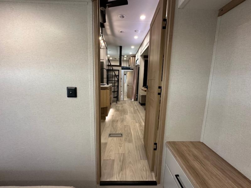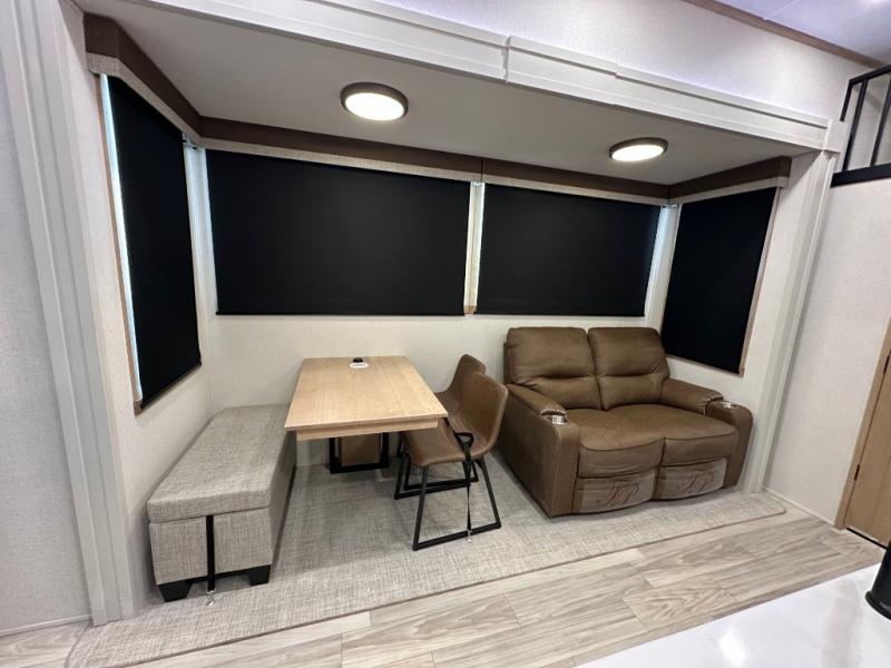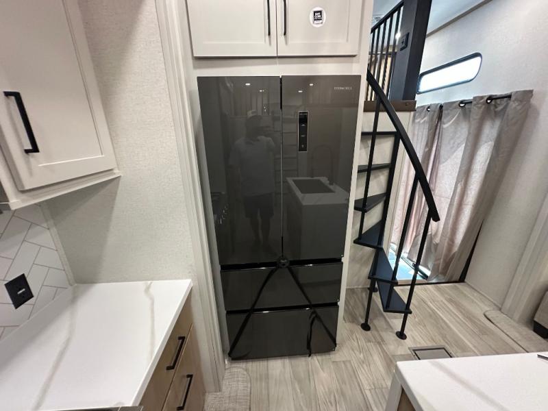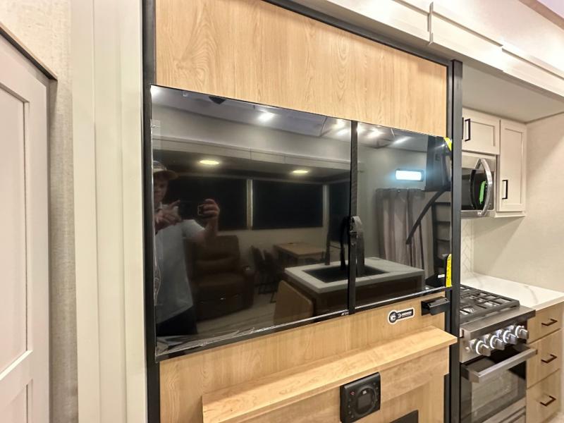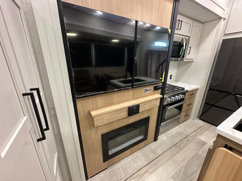 You won't believe the comfort and convenience found in this destination trailer. There are two private bedrooms; one up front with a queen bed slide out and storage space, and one in back with a queen bed slide out and a half bath! There is even washer and dryer prep here if you want to add those appliances and the second entry door is also found in this location so you can easily slip out in the morning. Above each of these rooms is a loft providing three total bunk mats for sleeping, storage cabinets, and TV prep if you want to add entertainment. Everyone can meet in the combined kitchen and living room that includes dual opposing slides, a 60" theater seating across from a 50" flat screen TV and fireplace, plus a free-standing table with chairs and a bench to dine at. The chef of your group will love the large kitchen island, Chef Collection three burner range, and a 16.2 cu. ft. refrigerator for food storage.
