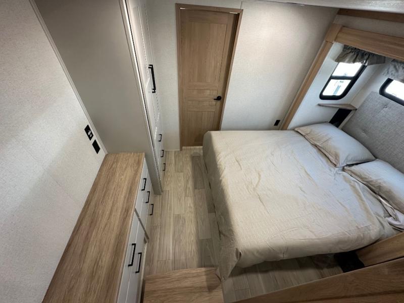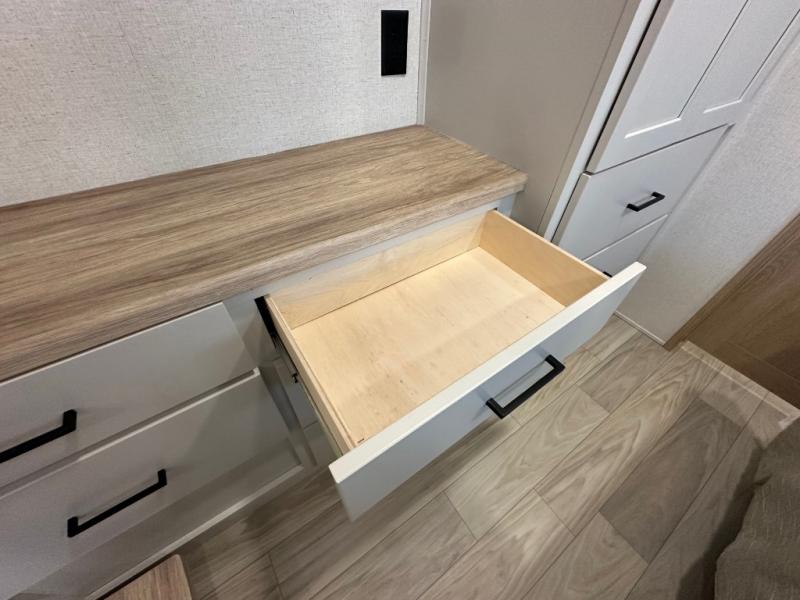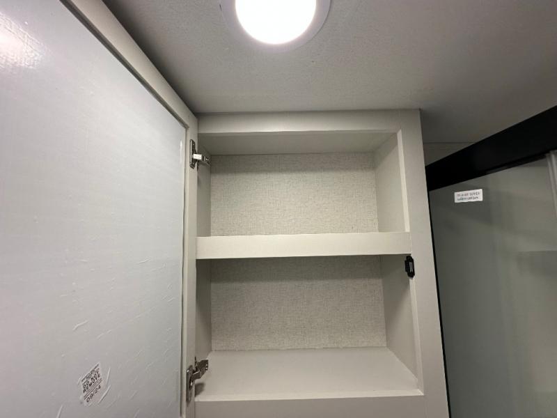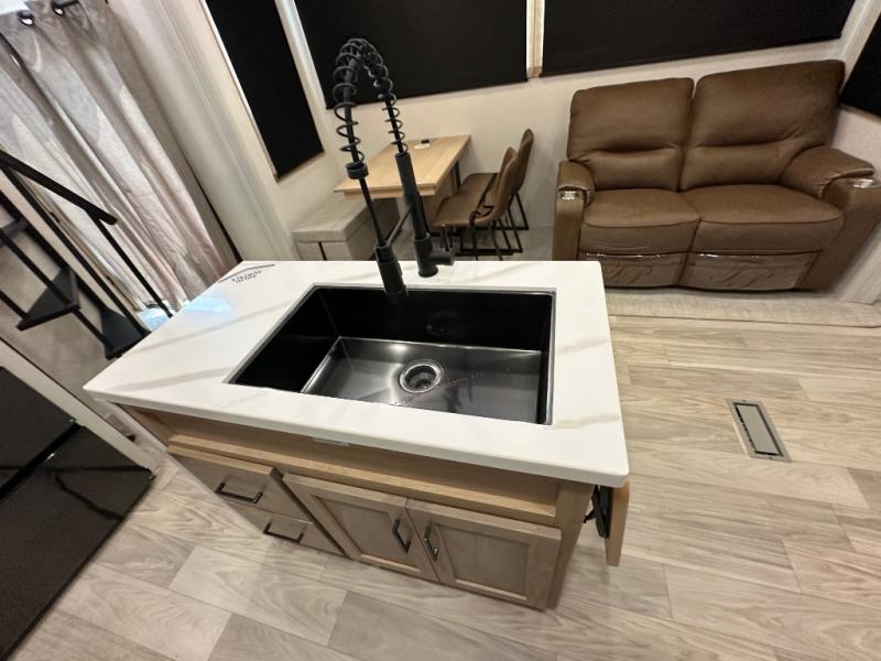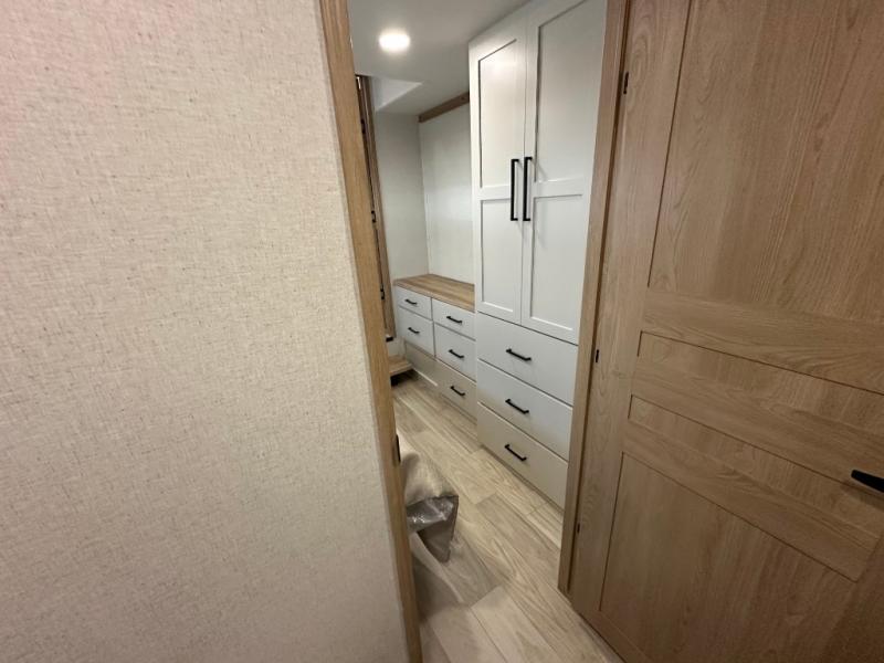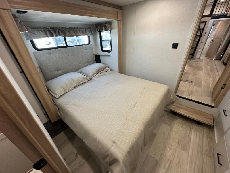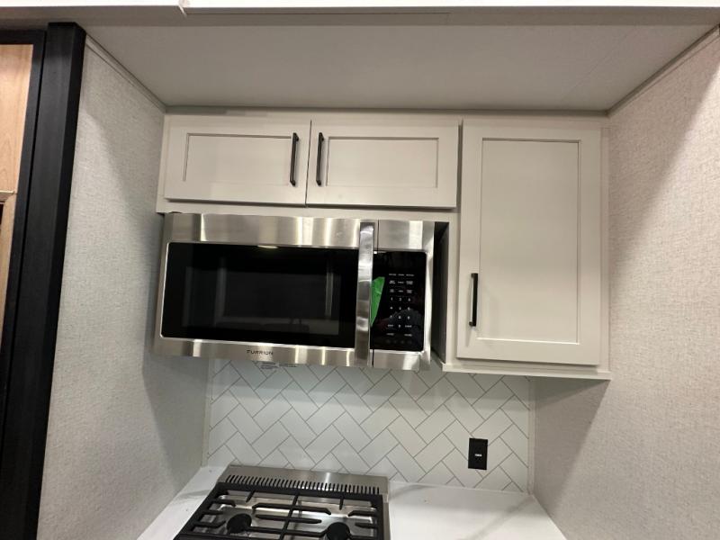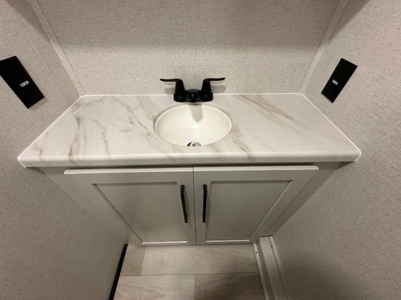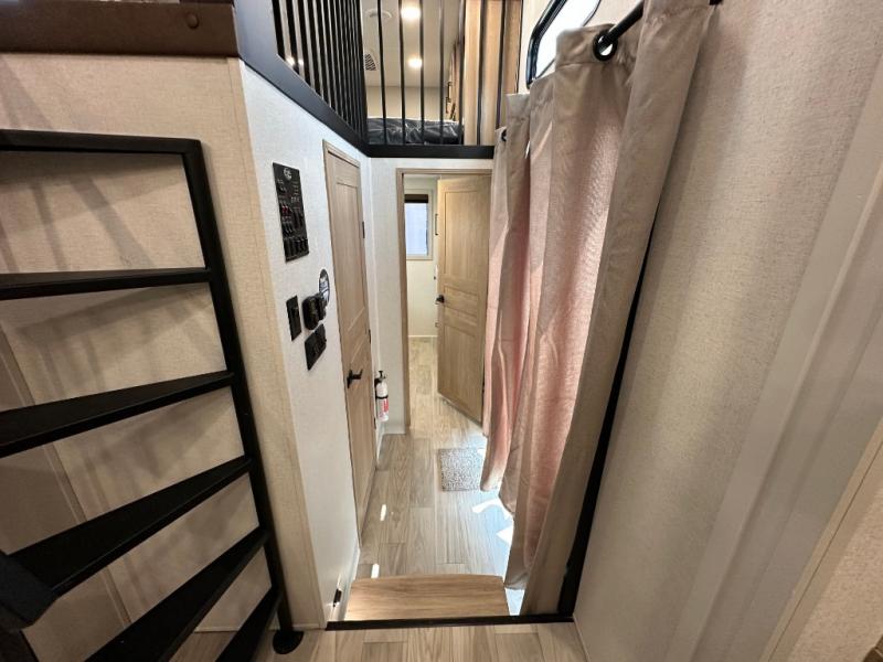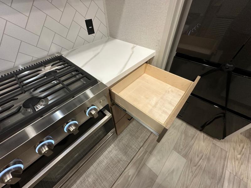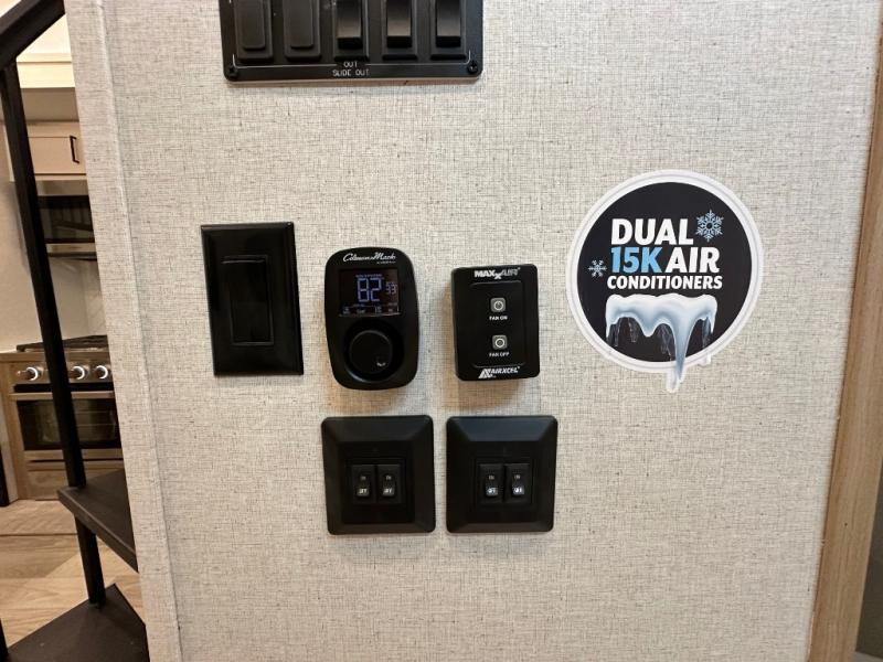 You won't believe the comfort and convenience found in this destination trailer. There are two private bedrooms; one up front with a queen bed slide out and storage space, and one in back with a queen bed slide out and a half bath! There is even washer and dryer prep here if you want to add those appliances and the second entry door is also found in this location so you can easily slip out in the morning. Above each of these rooms is a loft providing three total bunk mats for sleeping, storage cabinets, and TV prep if you want to add entertainment. Everyone can meet in the combined kitchen and living room that includes dual opposing slides, a 60" theater seating across from a 50" flat screen TV and fireplace, plus a free-standing table with chairs and a bench to dine at. The chef of your group will love the large kitchen island, Chef Collection three burner range, and a 16.2 cu. ft. refrigerator for food storage.