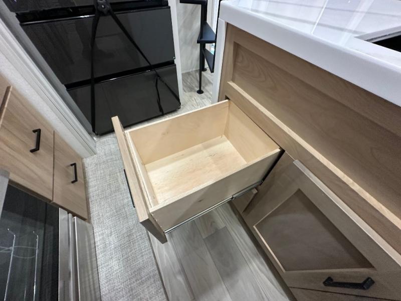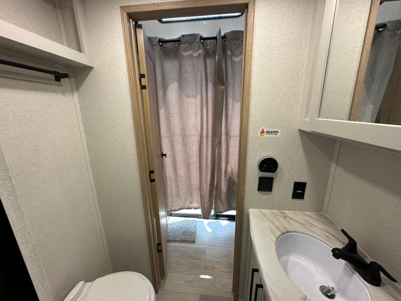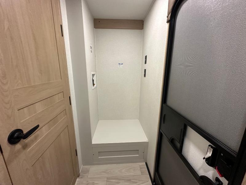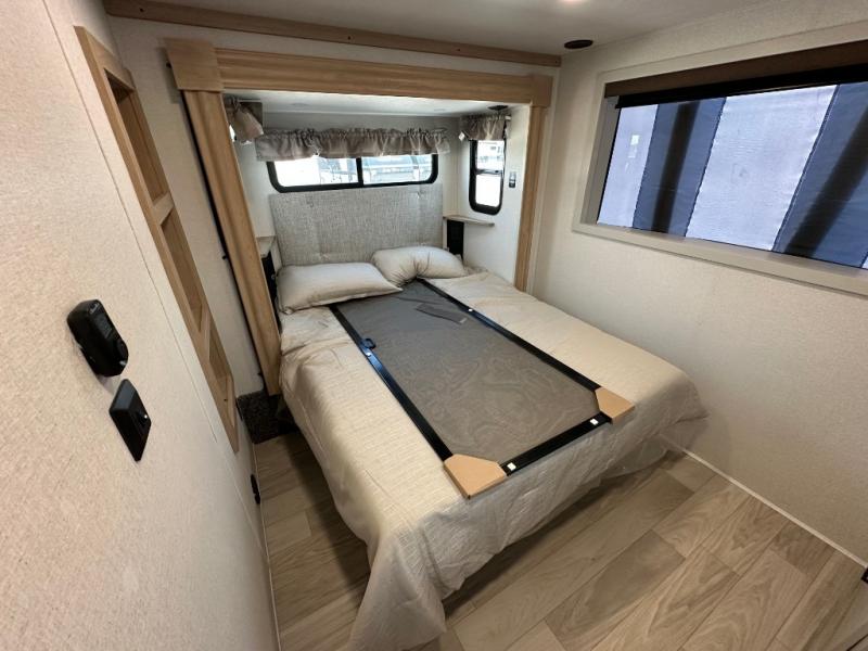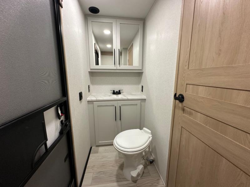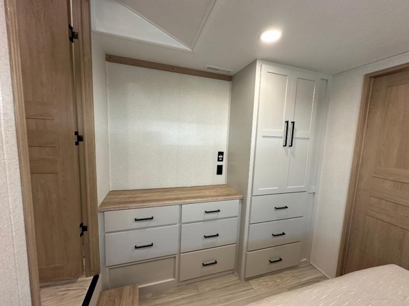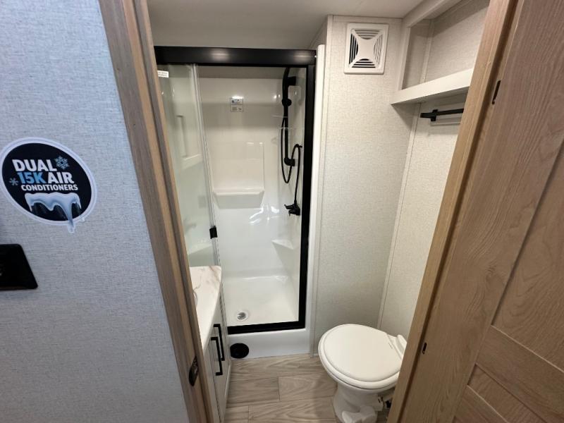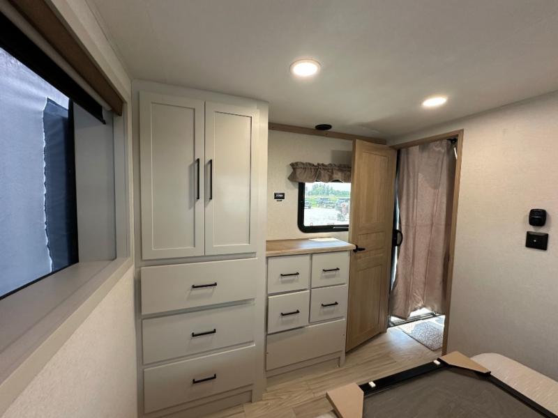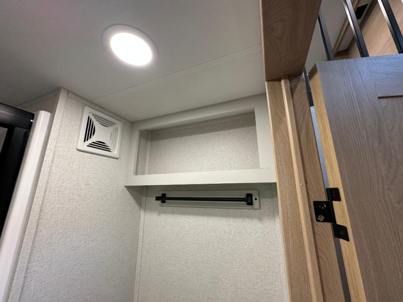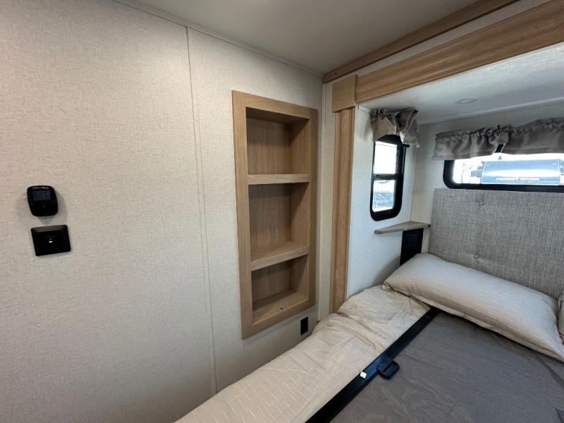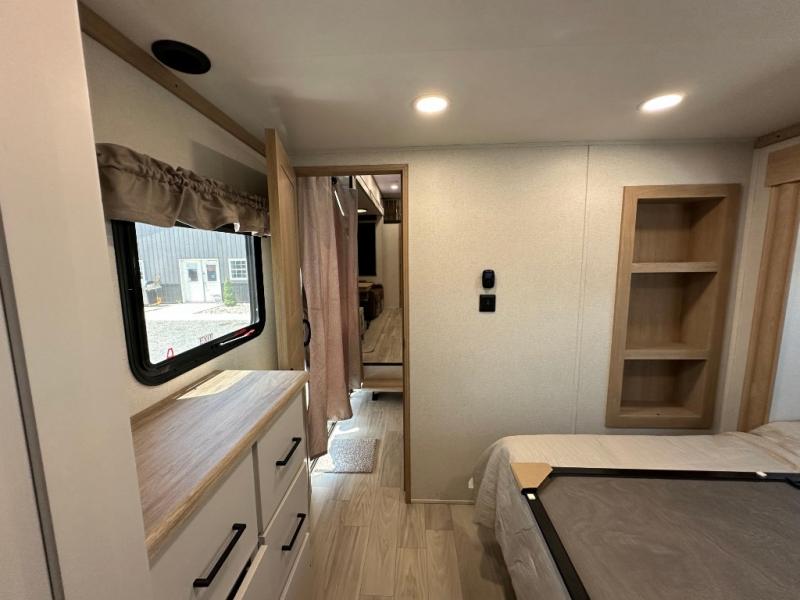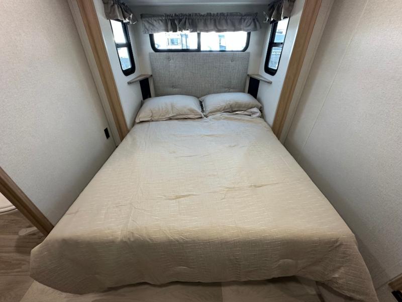 You won't believe the comfort and convenience found in this destination trailer. There are two private bedrooms; one up front with a queen bed slide out and storage space, and one in back with a queen bed slide out and a half bath! There is even washer and dryer prep here if you want to add those appliances and the second entry door is also found in this location so you can easily slip out in the morning. Above each of these rooms is a loft providing three total bunk mats for sleeping, storage cabinets, and TV prep if you want to add entertainment. Everyone can meet in the combined kitchen and living room that includes dual opposing slides, a 60" theater seating across from a 50" flat screen TV and fireplace, plus a free-standing table with chairs and a bench to dine at. The chef of your group will love the large kitchen island, Chef Collection three burner range, and a 16.2 cu. ft. refrigerator for food storage.