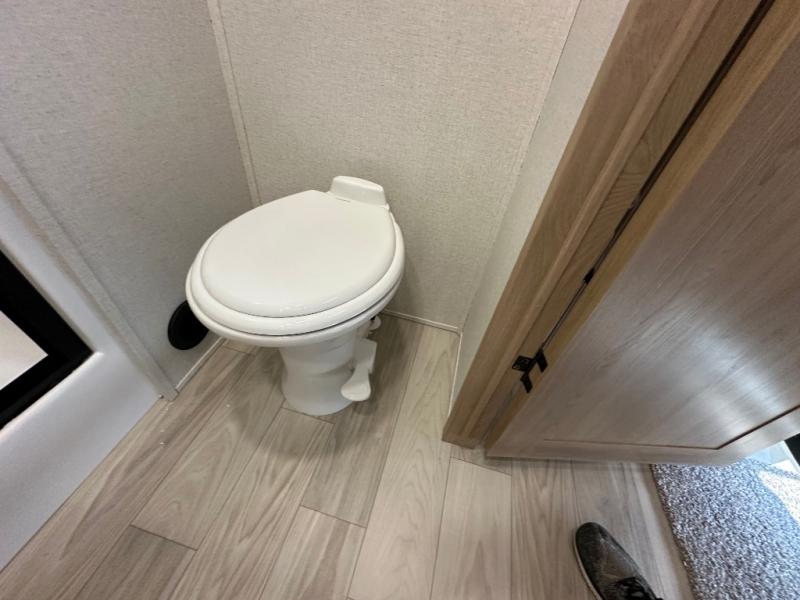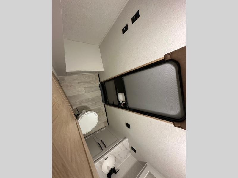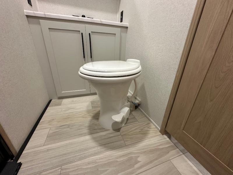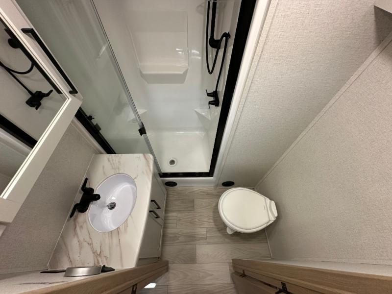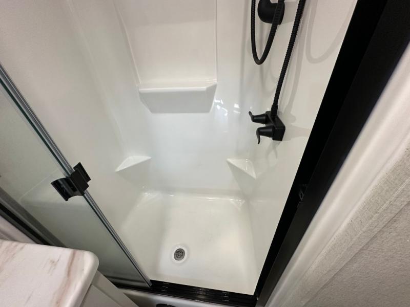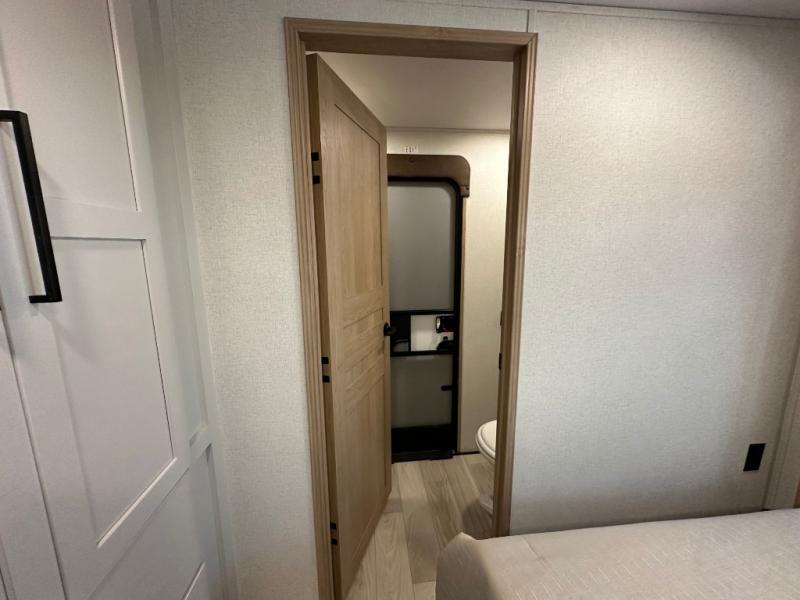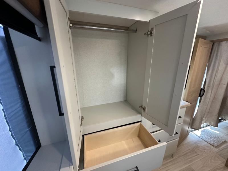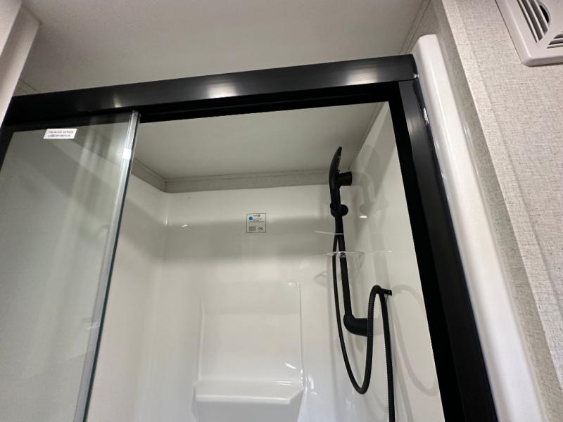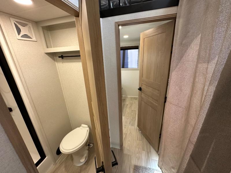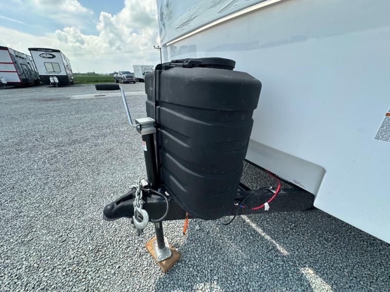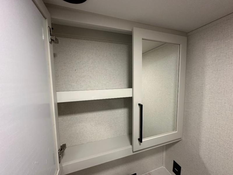 You won't believe the comfort and convenience found in this destination trailer. There are two private bedrooms; one up front with a queen bed slide out and storage space, and one in back with a queen bed slide out and a half bath! There is even washer and dryer prep here if you want to add those appliances and the second entry door is also found in this location so you can easily slip out in the morning. Above each of these rooms is a loft providing three total bunk mats for sleeping, storage cabinets, and TV prep if you want to add entertainment. Everyone can meet in the combined kitchen and living room that includes dual opposing slides, a 60" theater seating across from a 50" flat screen TV and fireplace, plus a free-standing table with chairs and a bench to dine at. The chef of your group will love the large kitchen island, Chef Collection three burner range, and a 16.2 cu. ft. refrigerator for food storage.