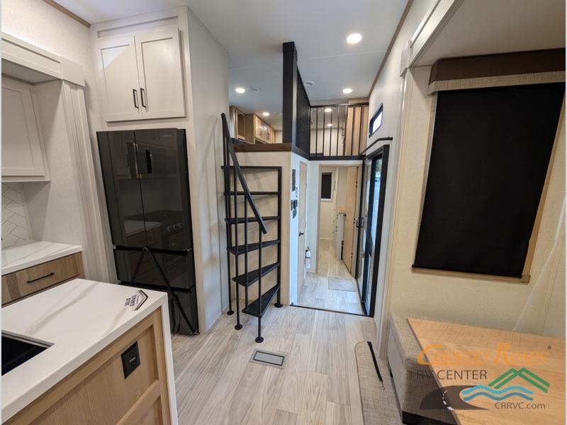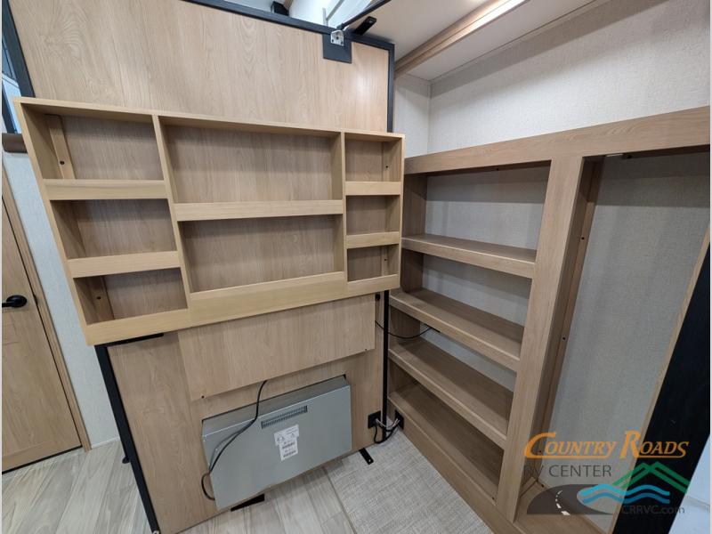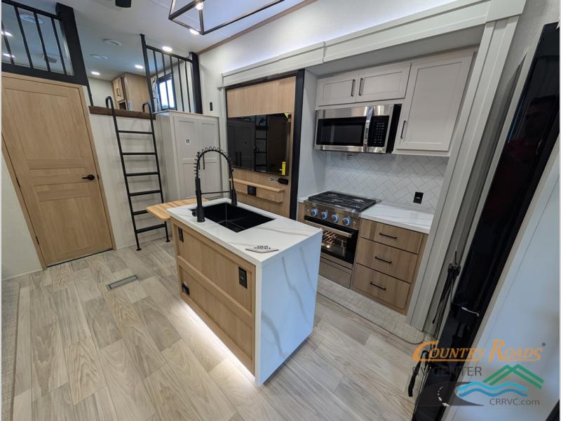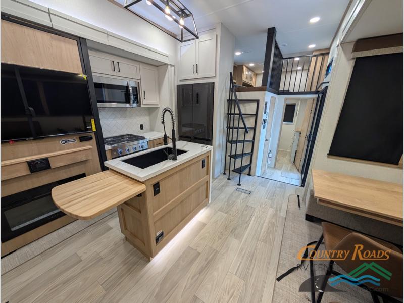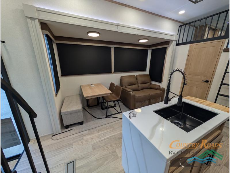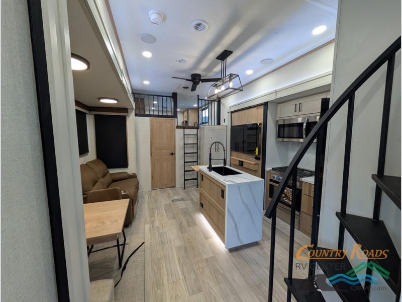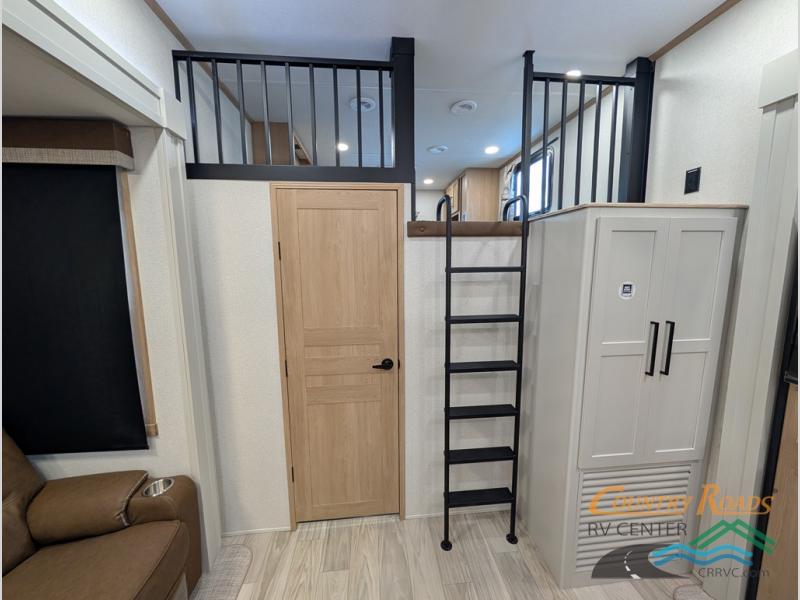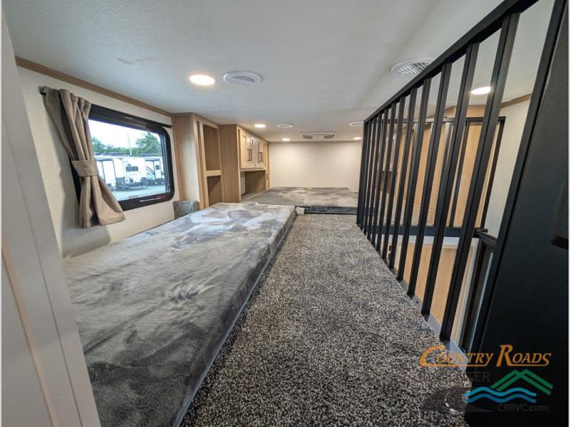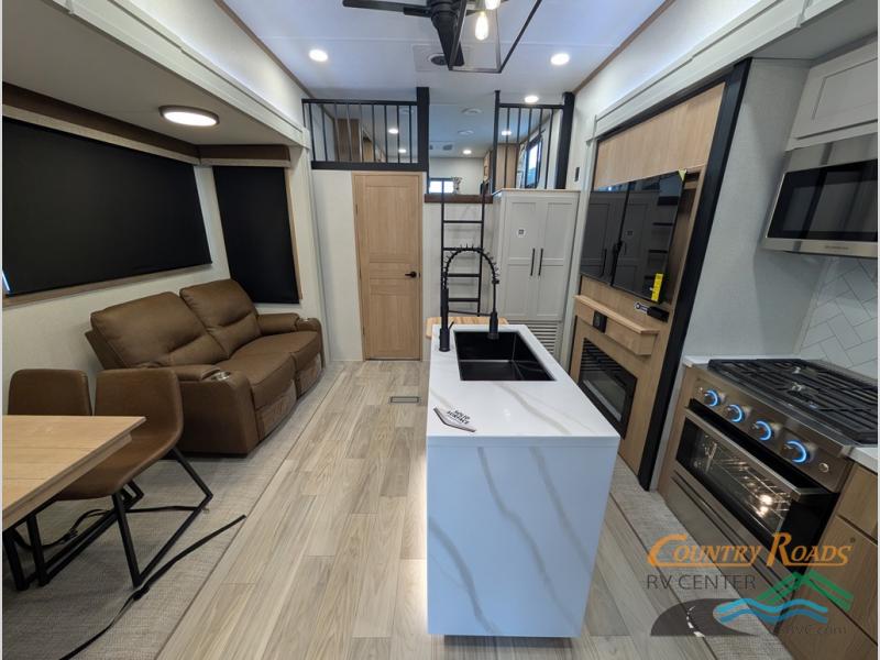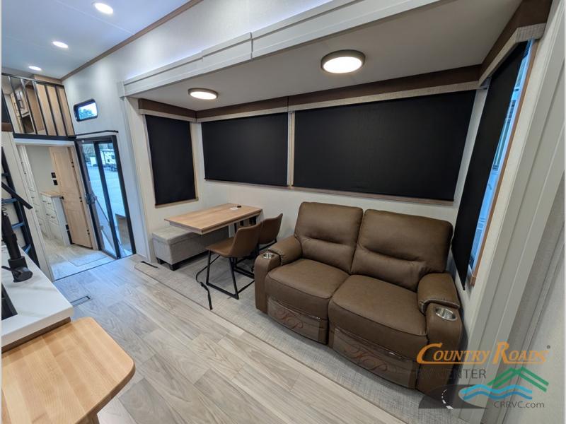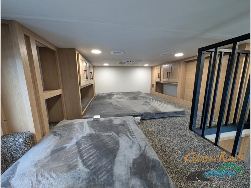 You won't believe the comfort and convenience found in this destination trailer. There are two private bedrooms; one up front with a queen bed slide out and storage space, and one in back with a queen bed slide out and a half bath! There is even washer and dryer prep here if you want to add those appliances and the second entry door is found here so you can easily slip out in the morning. Above each of these rooms is a loft area three total bunk mats, storage cabinets, and TV prep in the front loft if you want to add entertainment. Everyone can meet in the combined kitchen and living room that includes dual opposing slides, theater seating across from the 50" flat screen TV and fireplace, plus a free-standing dinette with chairs and bench seating. The chef of your group will love the large kitchen island with a countertop extension, a 16.2 cu. ft. 12V refrigerator, a hidden pantry, and more!