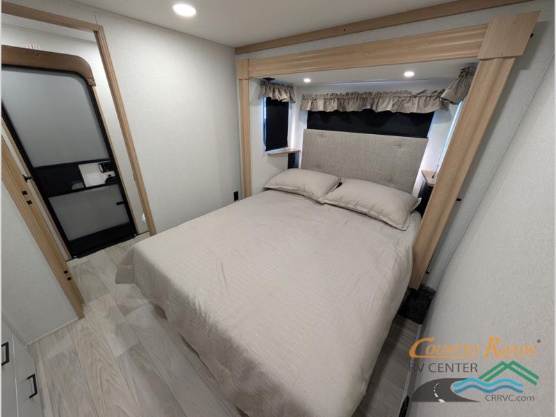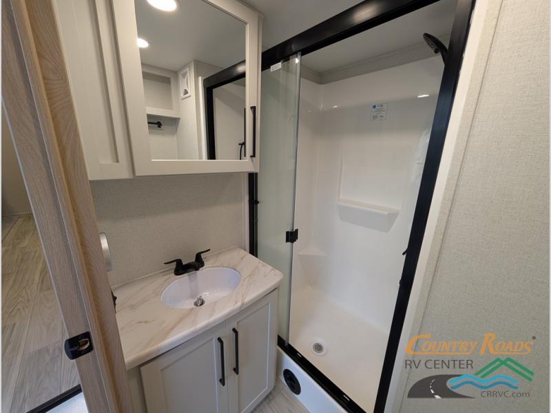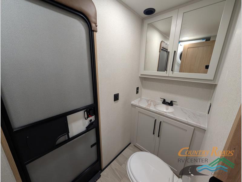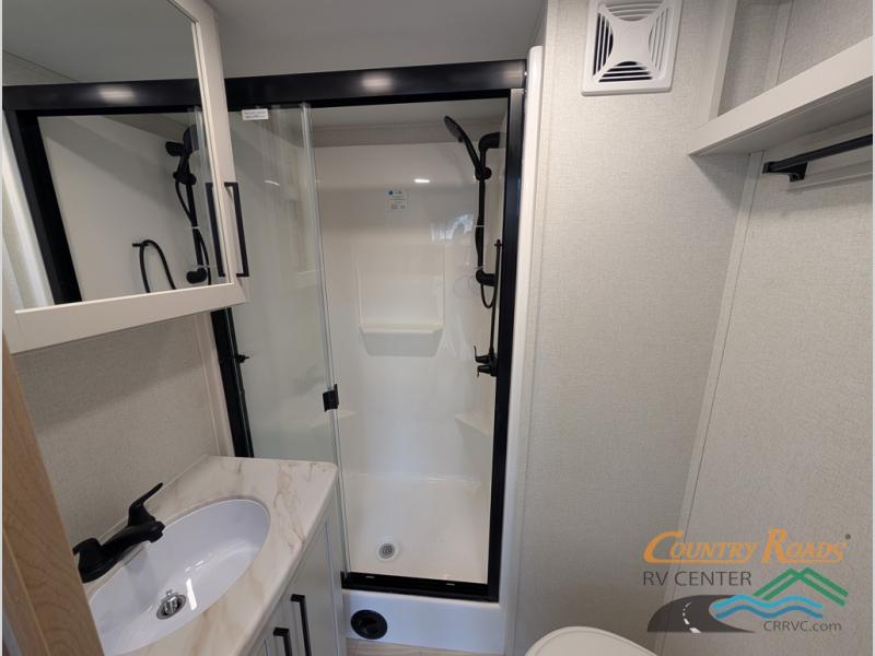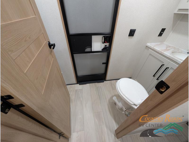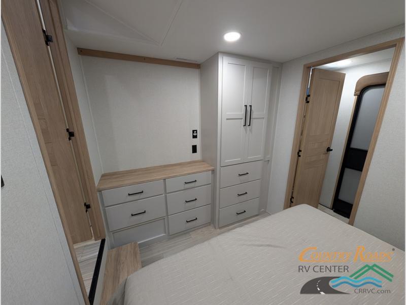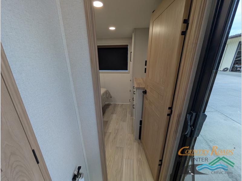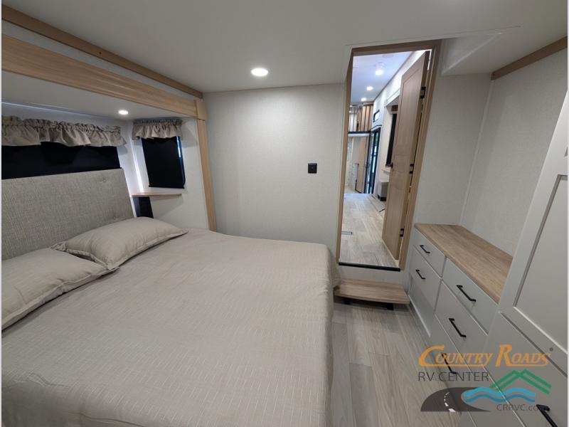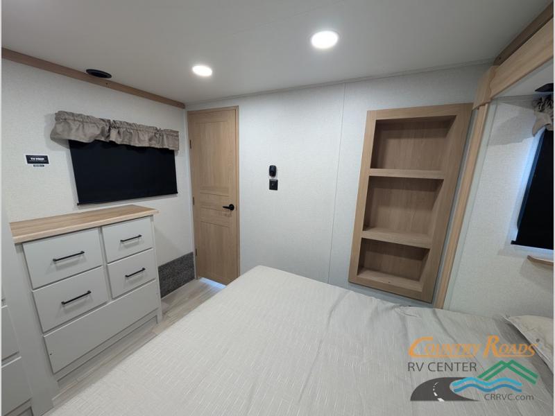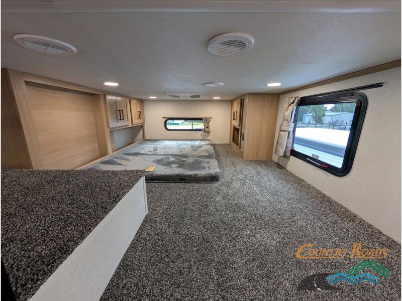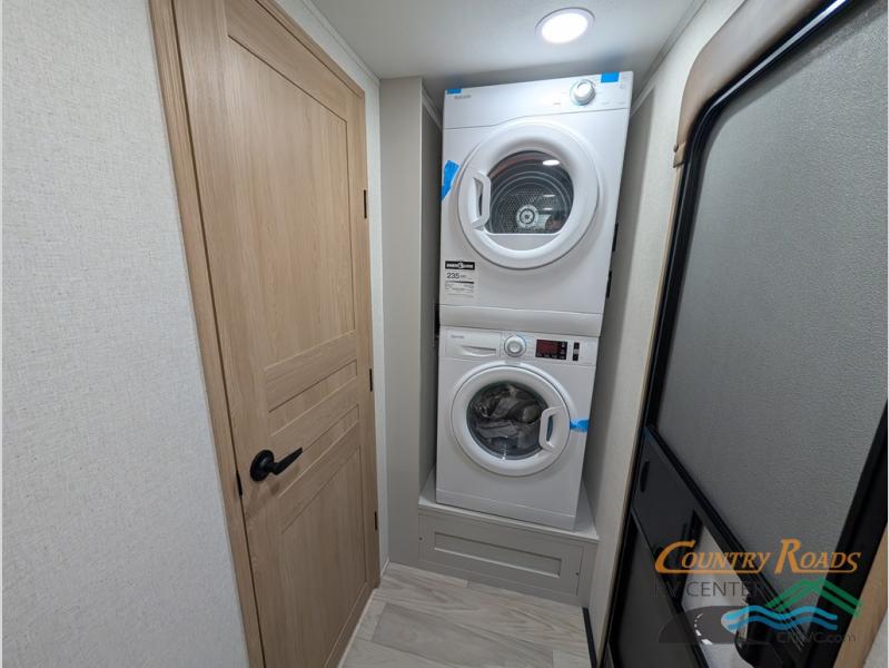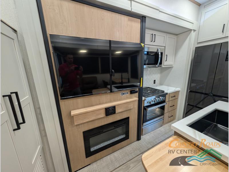 You won't believe the comfort and convenience found in this destination trailer. There are two private bedrooms; one up front with a queen bed slide out and storage space, and one in back with a queen bed slide out and a half bath! There is even washer and dryer prep here if you want to add those appliances and the second entry door is found here so you can easily slip out in the morning. Above each of these rooms is a loft area three total bunk mats, storage cabinets, and TV prep in the front loft if you want to add entertainment. Everyone can meet in the combined kitchen and living room that includes dual opposing slides, theater seating across from the 50" flat screen TV and fireplace, plus a free-standing dinette with chairs and bench seating. The chef of your group will love the large kitchen island with a countertop extension, a 16.2 cu. ft. 12V refrigerator, a hidden pantry, and more!