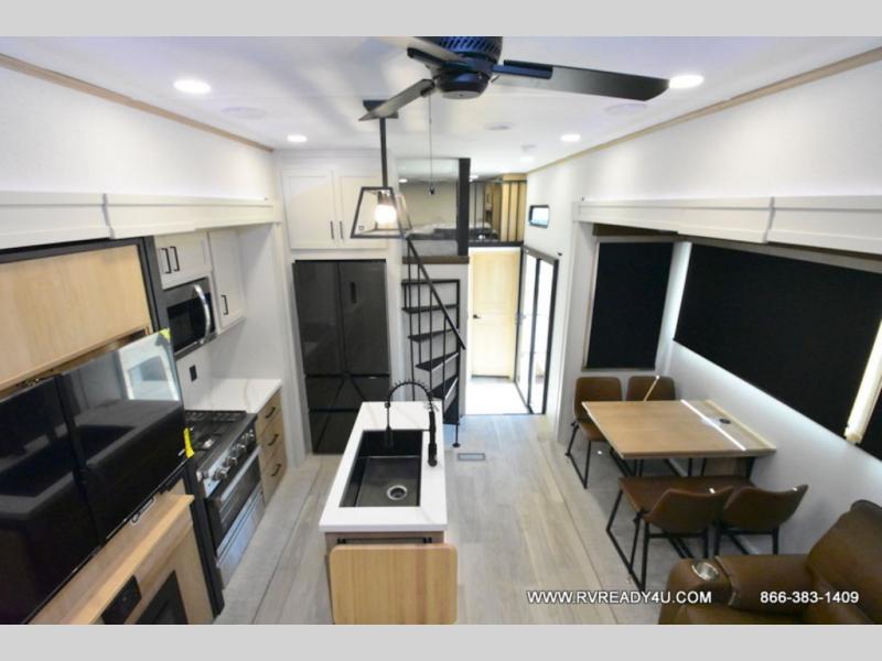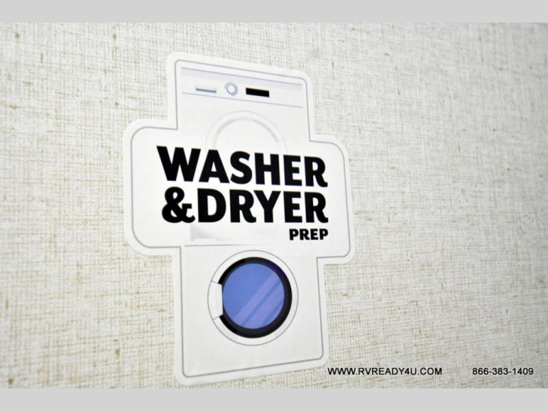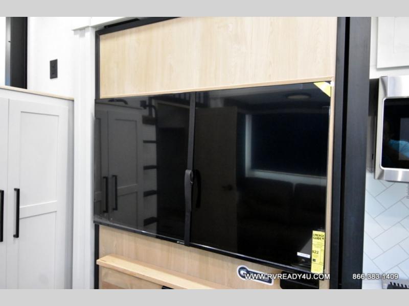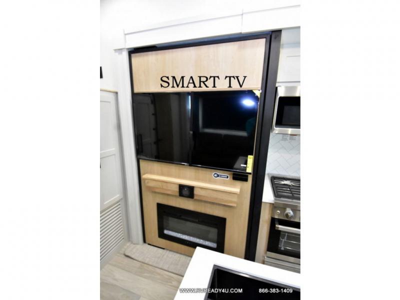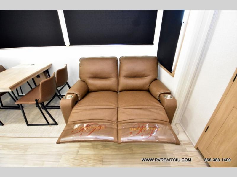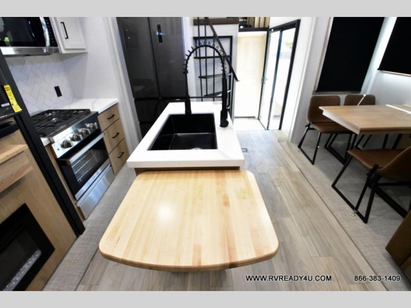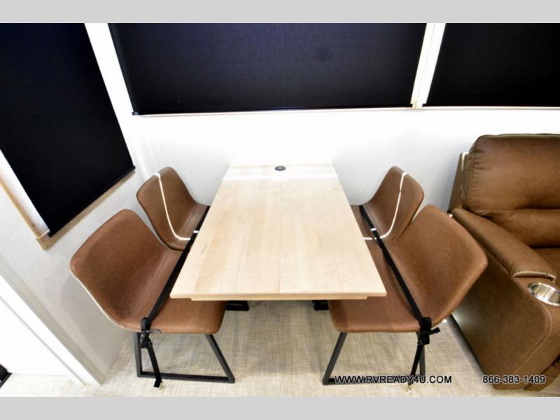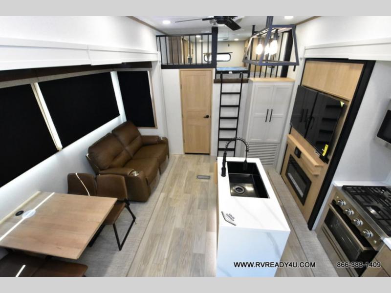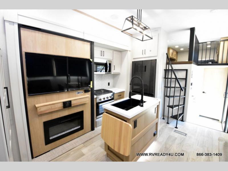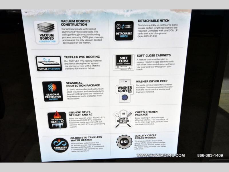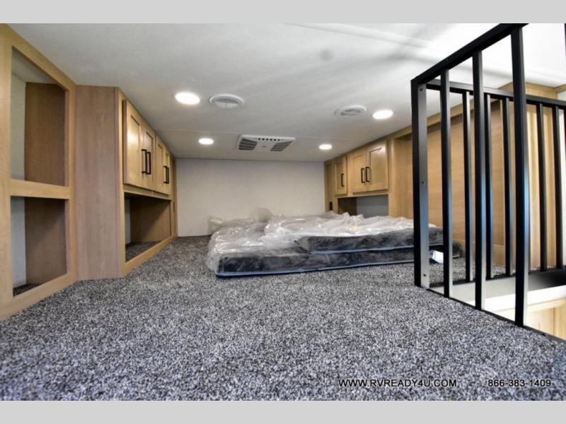You won't believe the comfort and convenience found in this destination trailer. There are two private bedrooms; one up front with a queen bed slide out and storage space, and one in back with a queen bed slide out and a half bath! There is even washer and dryer prep here if you want to add those appliances and the second entry door is also found in this location so you can easily slip out in the morning. Above each of these rooms is a loft providing three total bunk mats for sleeping, storage cabinets, and TV prep if you want to add entertainment. Everyone can meet in the combined kitchen and living room that includes dual opposing slides, a 60" theater seating across from a 50" flat screen TV and fireplace, plus a free-standing table with chairs and a bench to dine at. The chef of your group will love the large kitchen island, Chef Collection three burner range, and a 16.2 cu. ft. refrigerator for food storage.