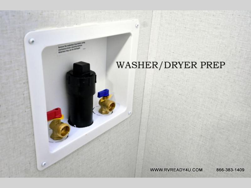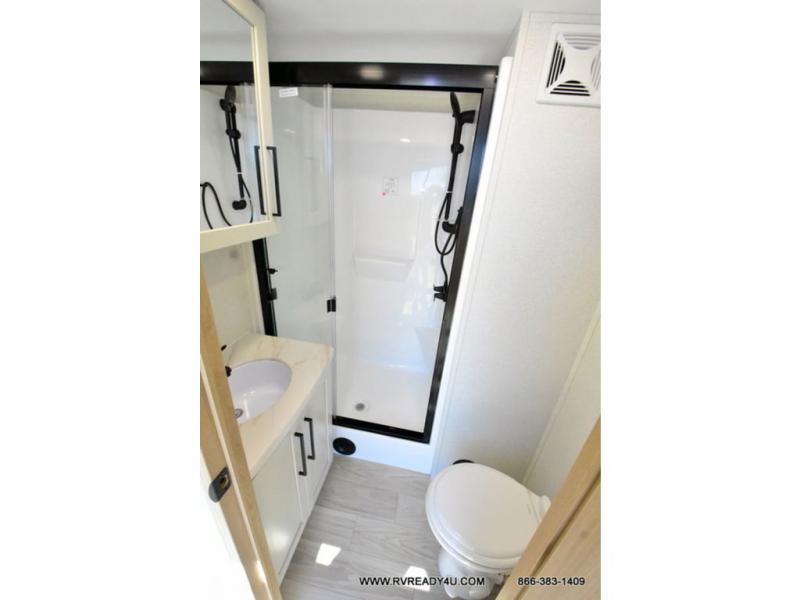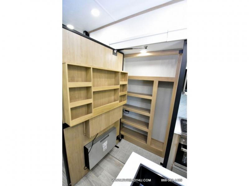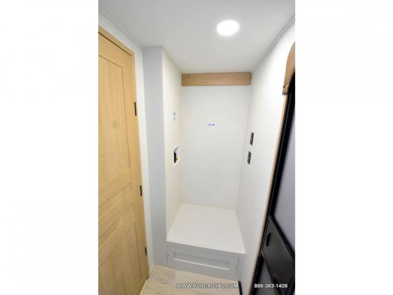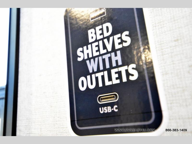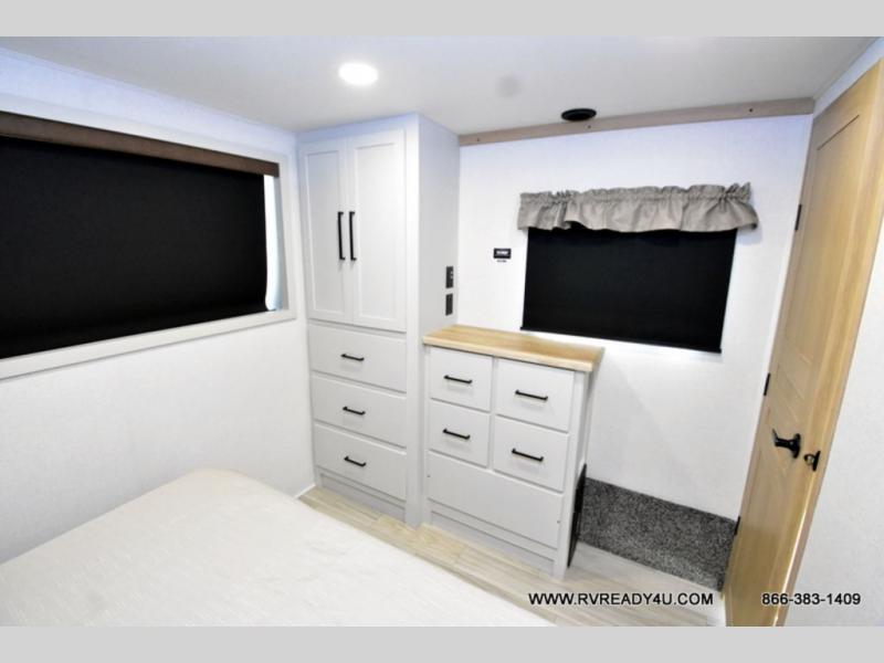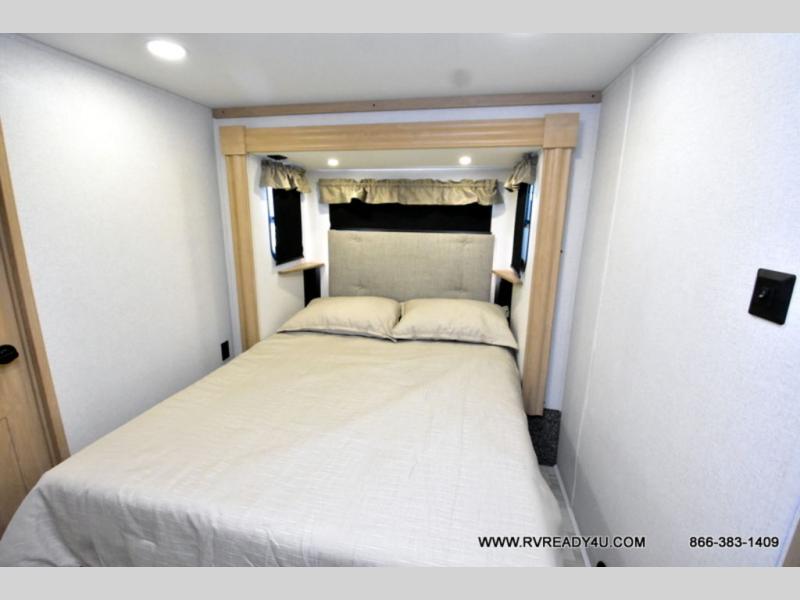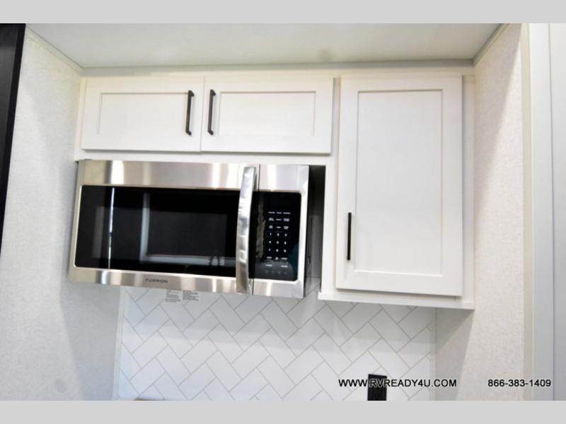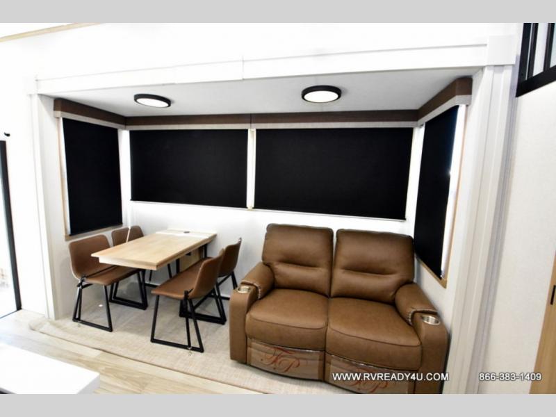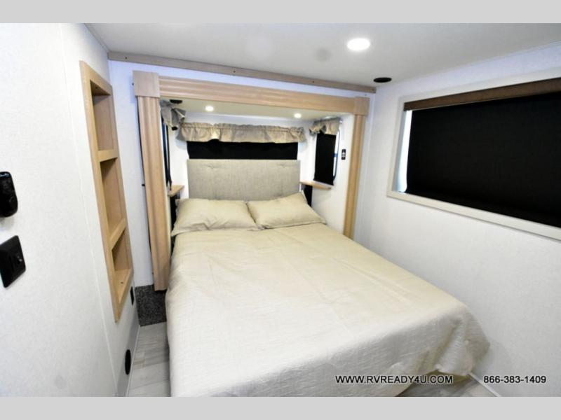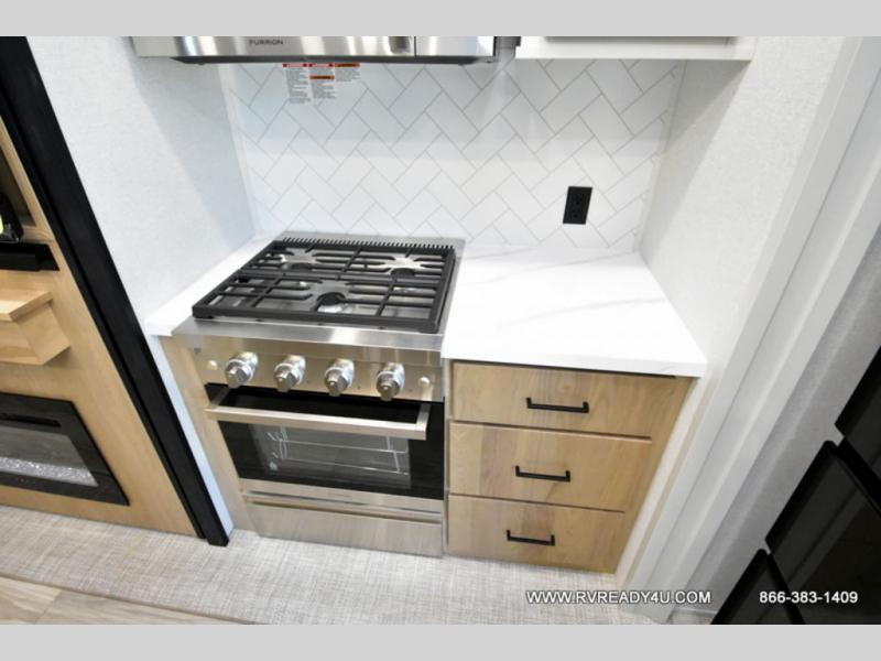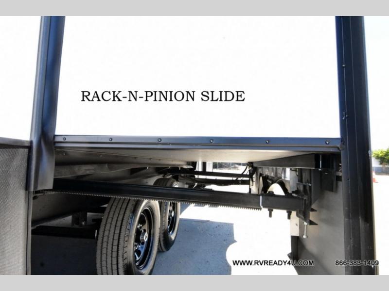 You won't believe the comfort and convenience found in this destination trailer. There are two private bedrooms; one up front with a queen bed slide out and storage space, and one in back with a queen bed slide out and a half bath! There is even washer and dryer prep here if you want to add those appliances and the second entry door is also found in this location so you can easily slip out in the morning. Above each of these rooms is a loft providing three total bunk mats for sleeping, storage cabinets, and TV prep if you want to add entertainment. Everyone can meet in the combined kitchen and living room that includes dual opposing slides, a 60" theater seating across from a 50" flat screen TV and fireplace, plus a free-standing table with chairs and a bench to dine at. The chef of your group will love the large kitchen island, Chef Collection three burner range, and a 16.2 cu. ft. refrigerator for food storage.