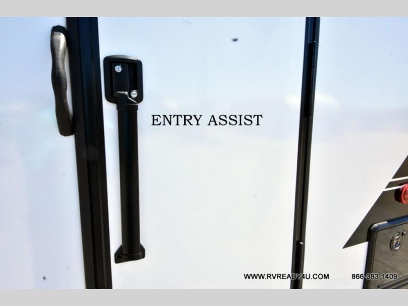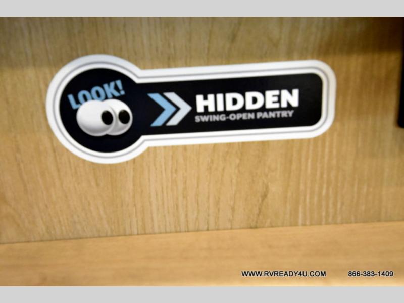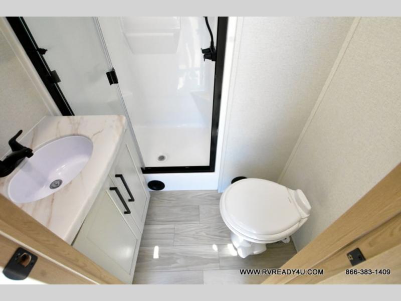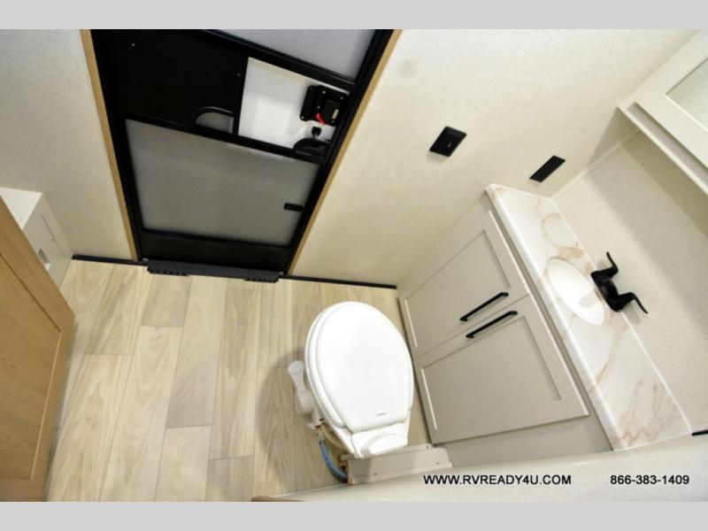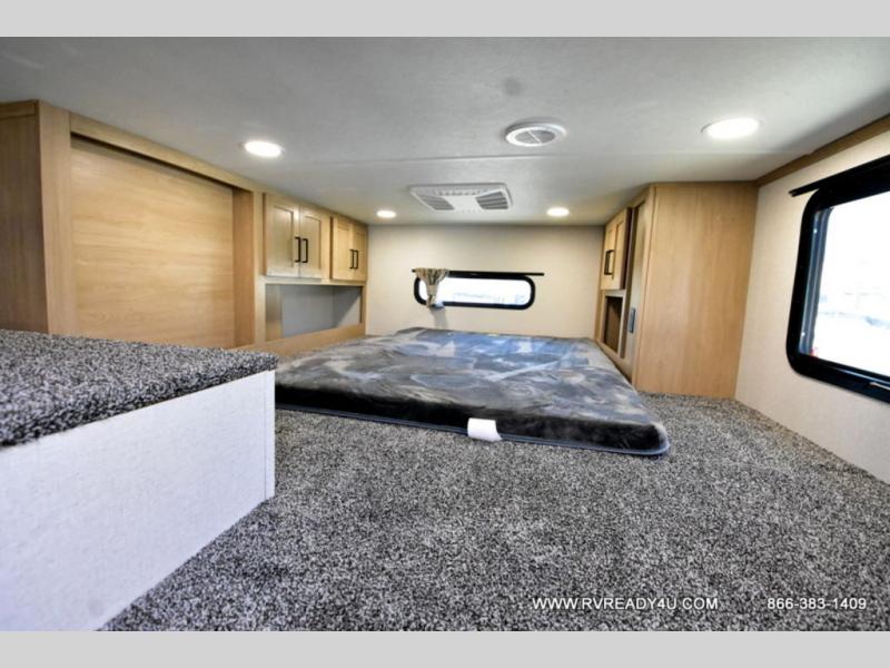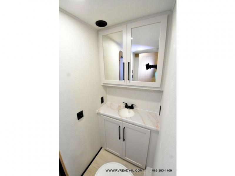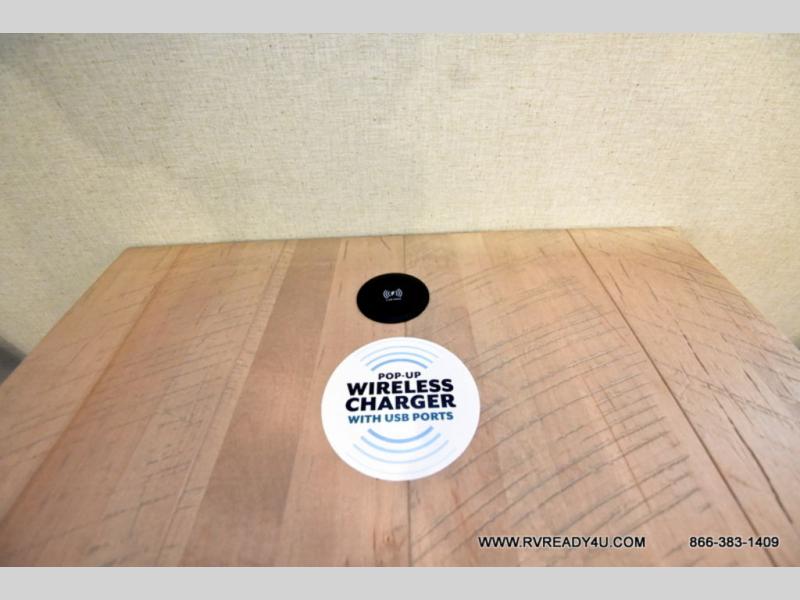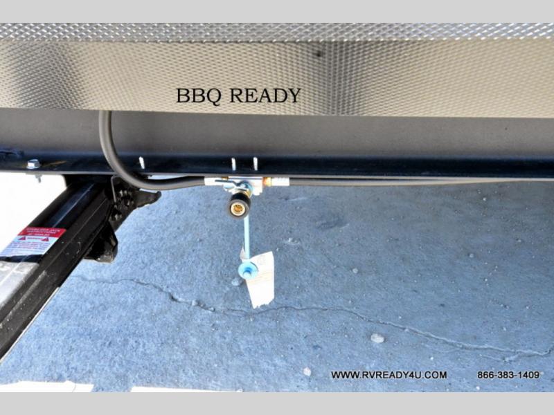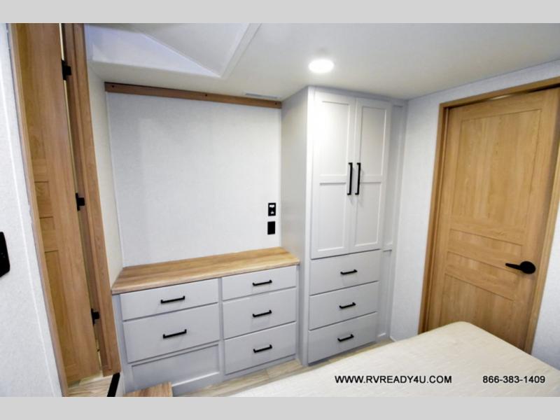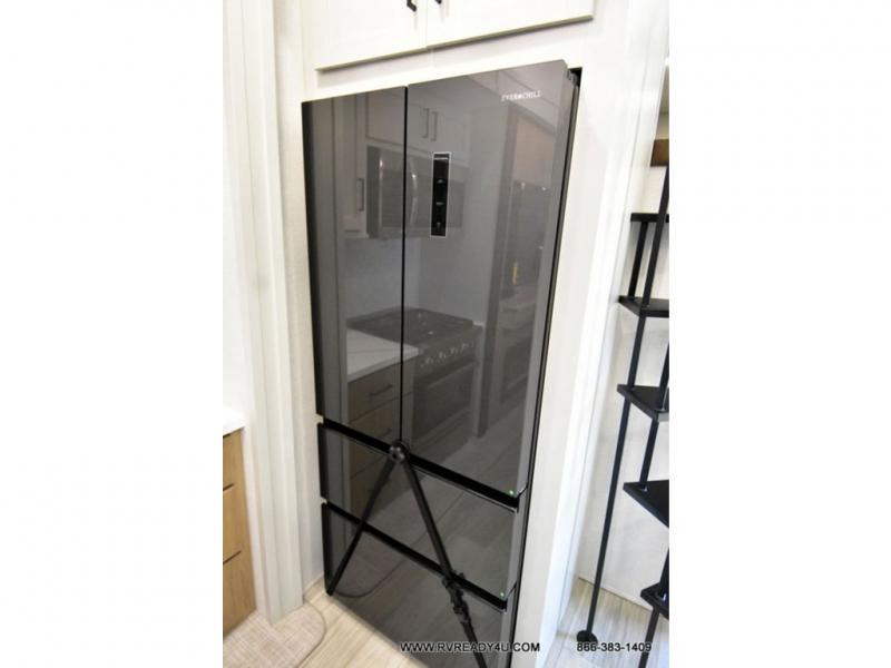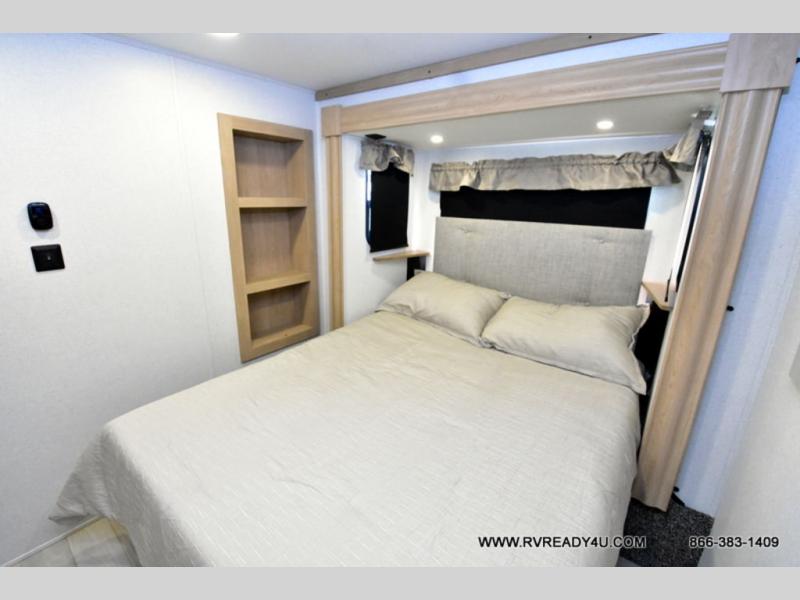 You won't believe the comfort and convenience found in this destination trailer. There are two private bedrooms; one up front with a queen bed slide out and storage space, and one in back with a queen bed slide out and a half bath! There is even washer and dryer prep here if you want to add those appliances and the second entry door is also found in this location so you can easily slip out in the morning. Above each of these rooms is a loft providing three total bunk mats for sleeping, storage cabinets, and TV prep if you want to add entertainment. Everyone can meet in the combined kitchen and living room that includes dual opposing slides, a 60" theater seating across from a 50" flat screen TV and fireplace, plus a free-standing table with chairs and a bench to dine at. The chef of your group will love the large kitchen island, Chef Collection three burner range, and a 16.2 cu. ft. refrigerator for food storage.