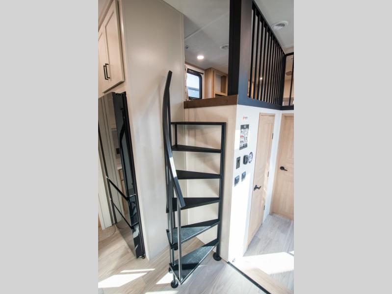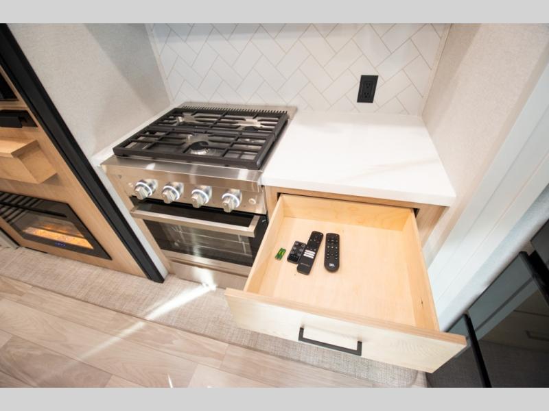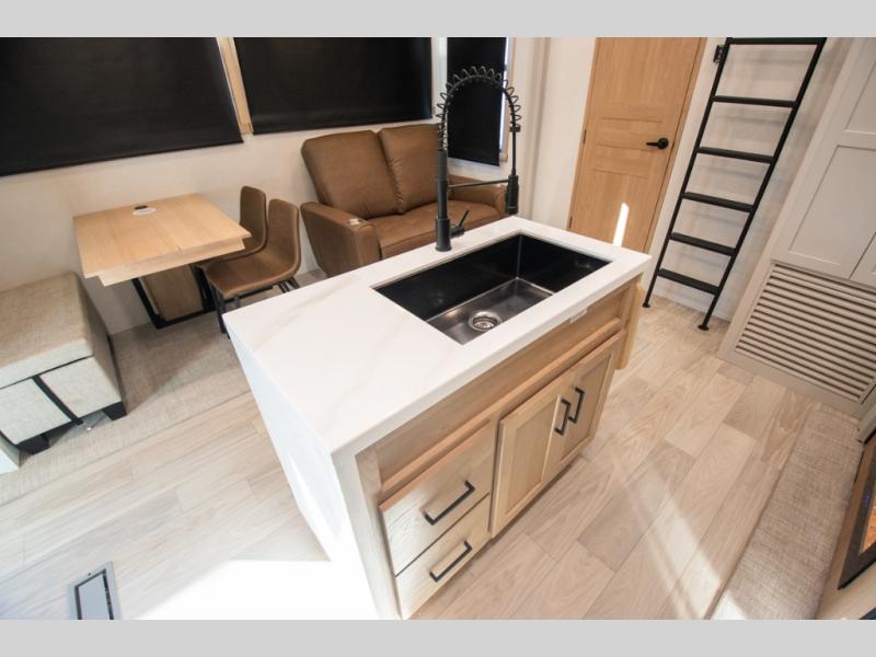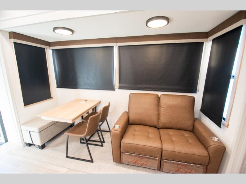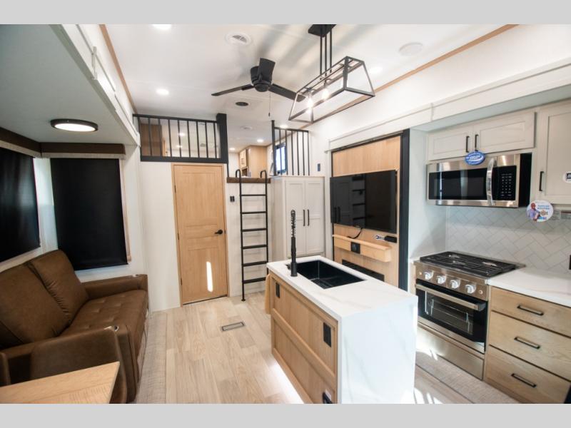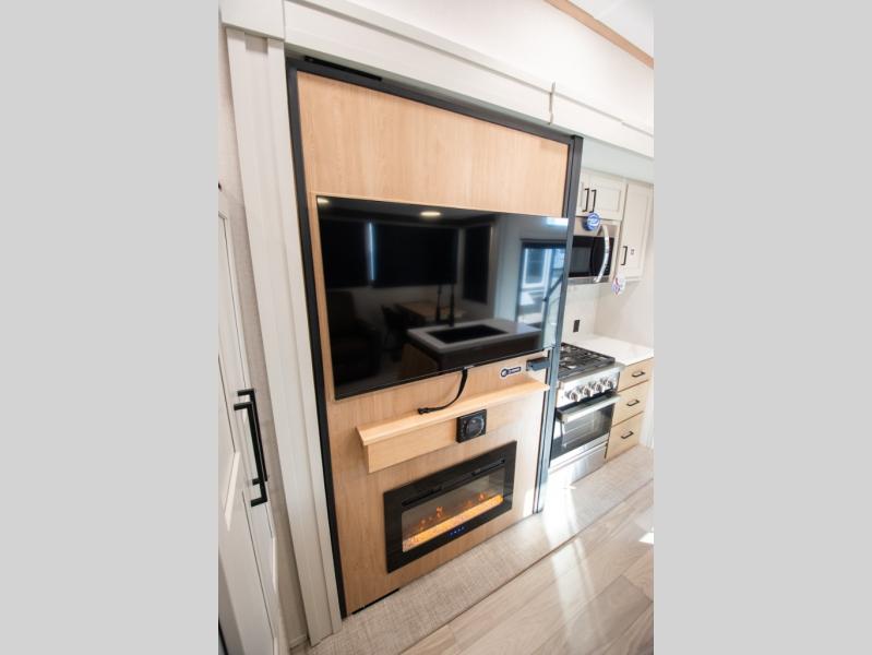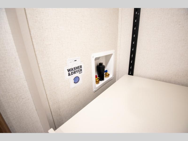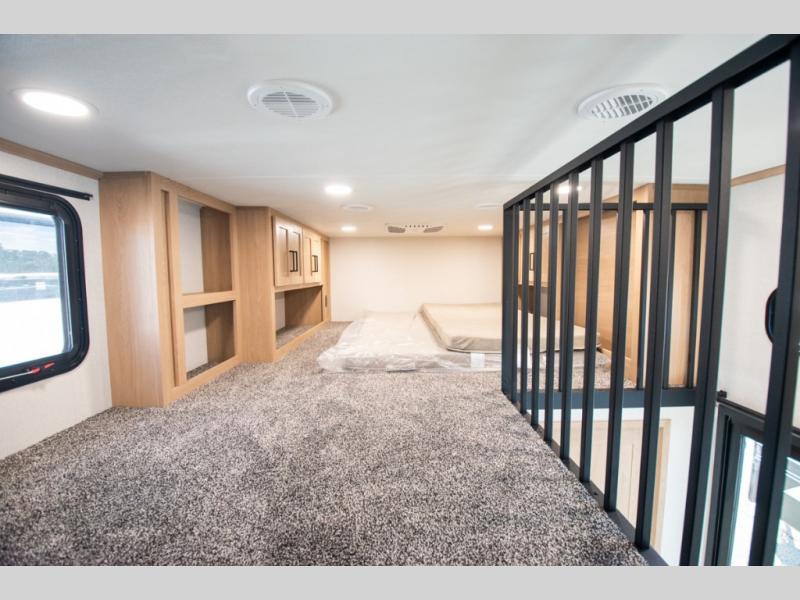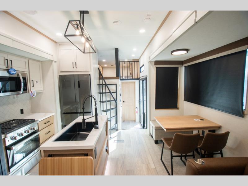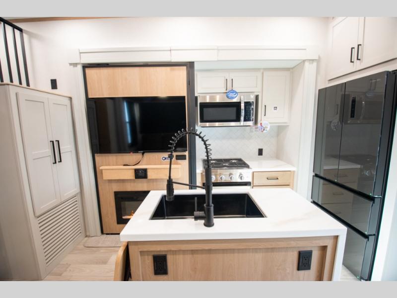 You won't believe the comfort and convenience found in this destination trailer. There are two private bedrooms; one up front with a queen bed slide out and storage space, and one in back with a queen bed slide out and a half bath! There is even washer and dryer prep here if you want to add those appliances and the second entry door is also found in this location so you can easily slip out in the morning. Above each of these rooms is a loft providing three total bunk mats for sleeping, storage cabinets, and TV prep if you want to add entertainment. Everyone can meet in the combined kitchen and living room that includes dual opposing slides, a 60" theater seating across from a 50" flat screen TV and fireplace, plus a free-standing table with chairs and a bench to dine at. The chef of your group will love the large kitchen island, Chef Collection three burner range, and a 16.2 cu. ft. refrigerator for food storage.