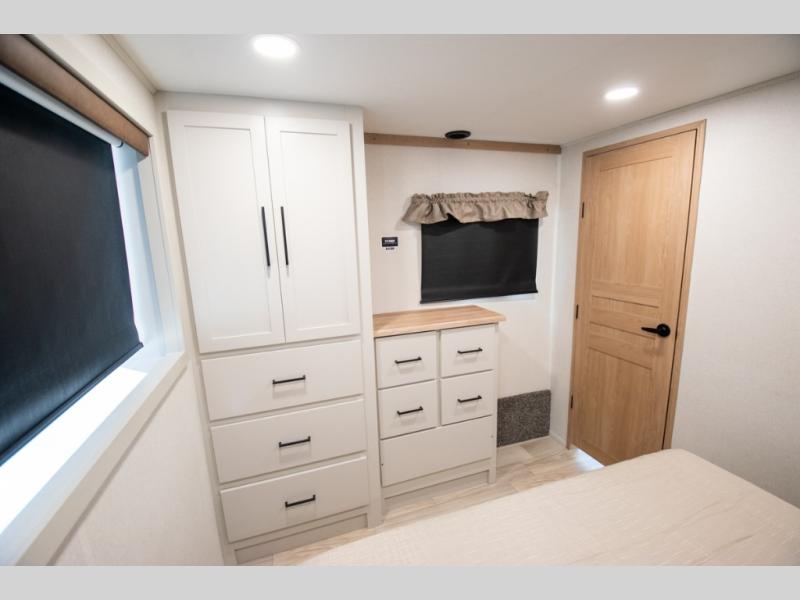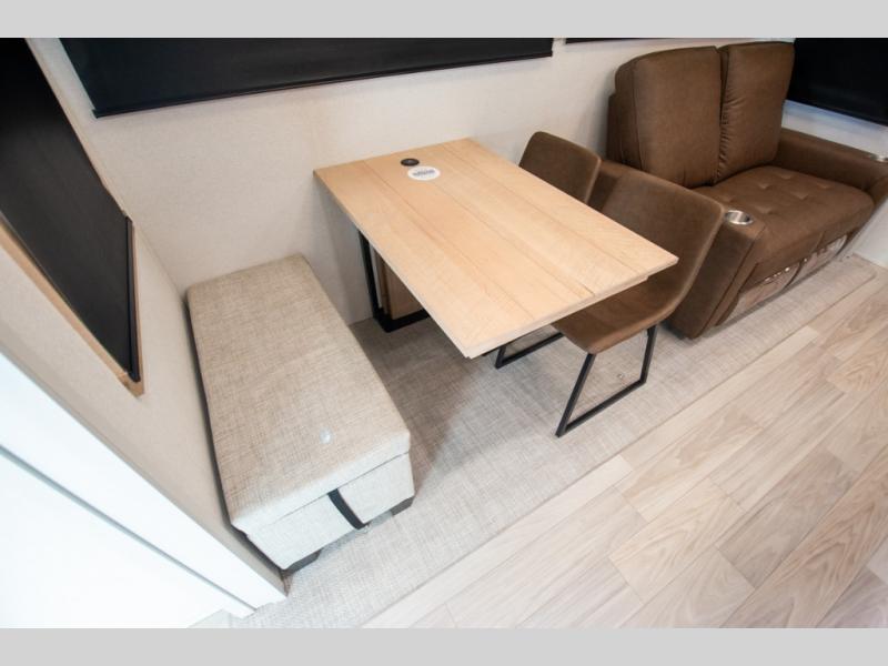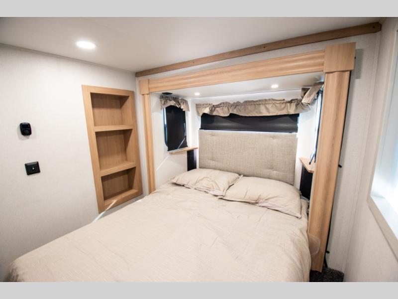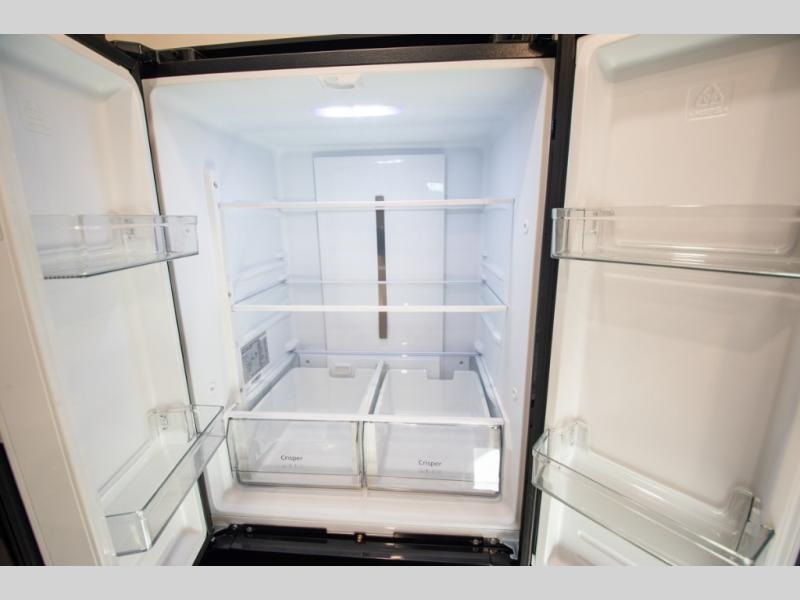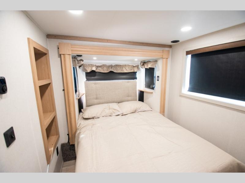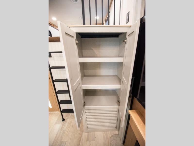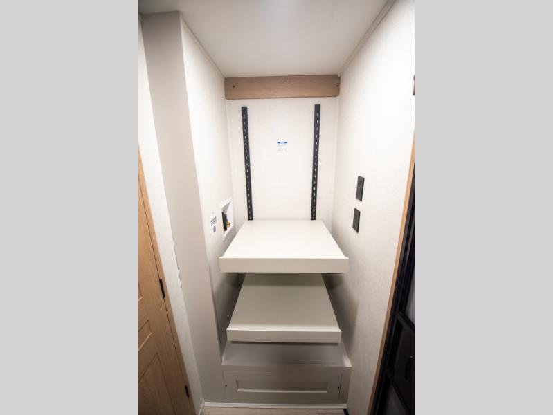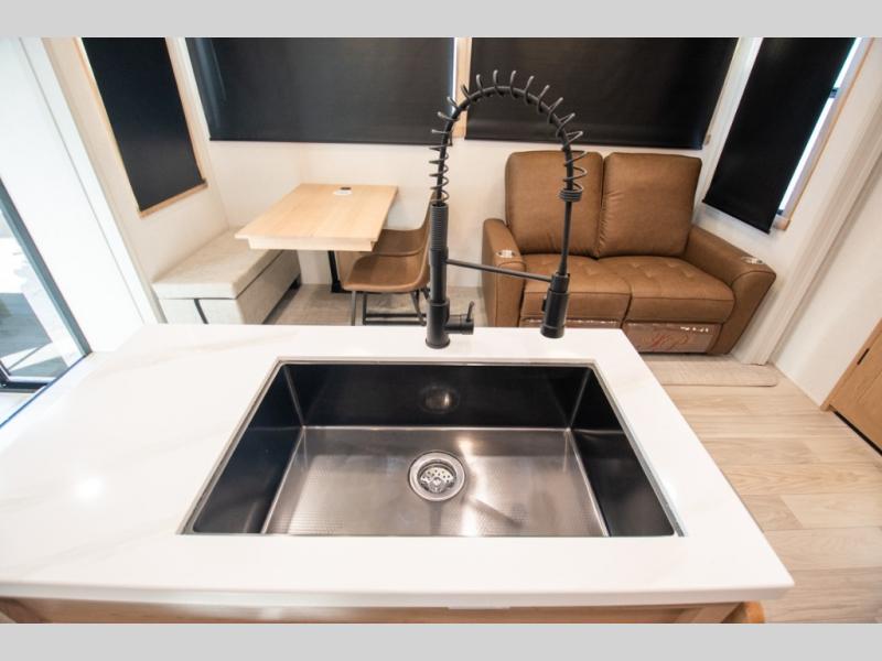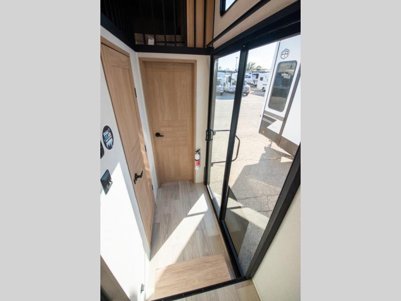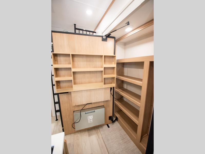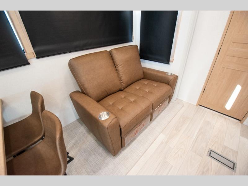 You won't believe the comfort and convenience found in this destination trailer. There are two private bedrooms; one up front with a queen bed slide out and storage space, and one in back with a queen bed slide out and a half bath! There is even washer and dryer prep here if you want to add those appliances and the second entry door is also found in this location so you can easily slip out in the morning. Above each of these rooms is a loft providing three total bunk mats for sleeping, storage cabinets, and TV prep if you want to add entertainment. Everyone can meet in the combined kitchen and living room that includes dual opposing slides, a 60" theater seating across from a 50" flat screen TV and fireplace, plus a free-standing table with chairs and a bench to dine at. The chef of your group will love the large kitchen island, Chef Collection three burner range, and a 16.2 cu. ft. refrigerator for food storage.