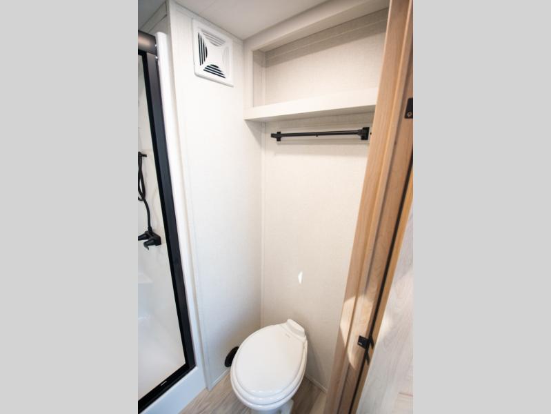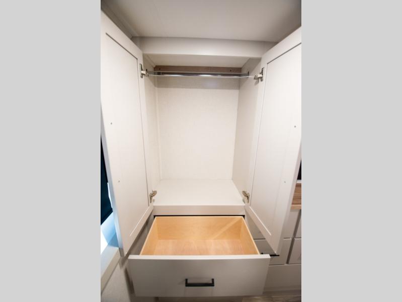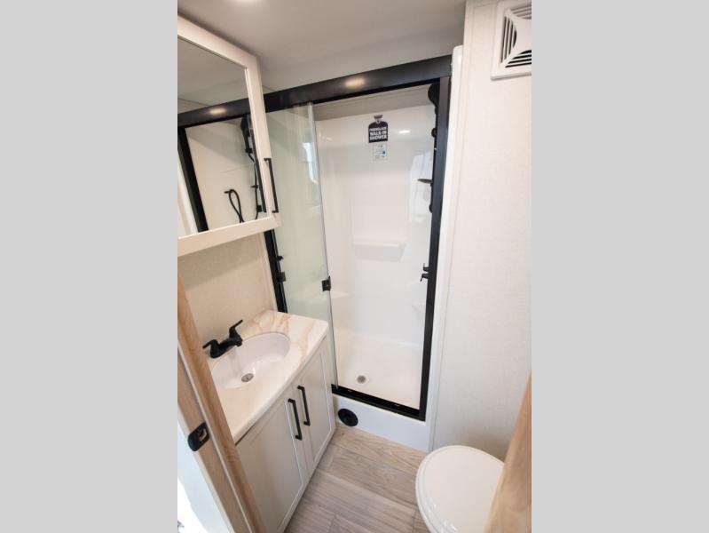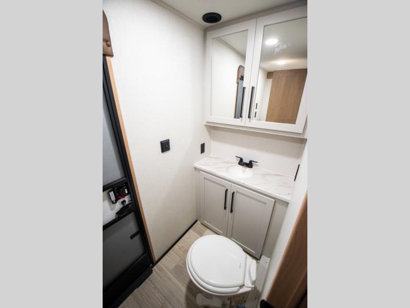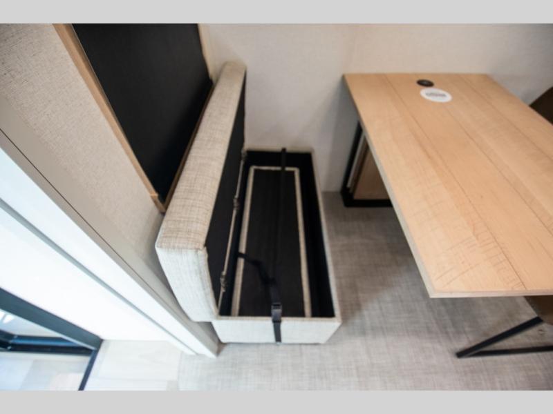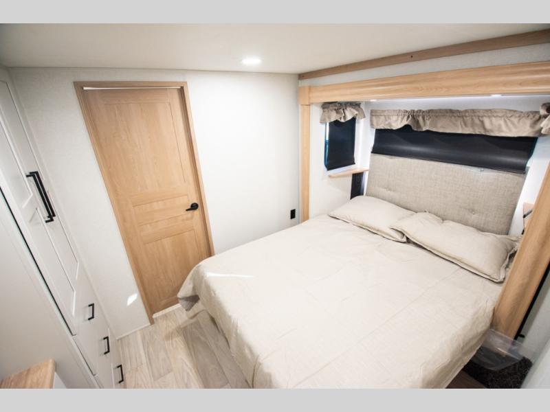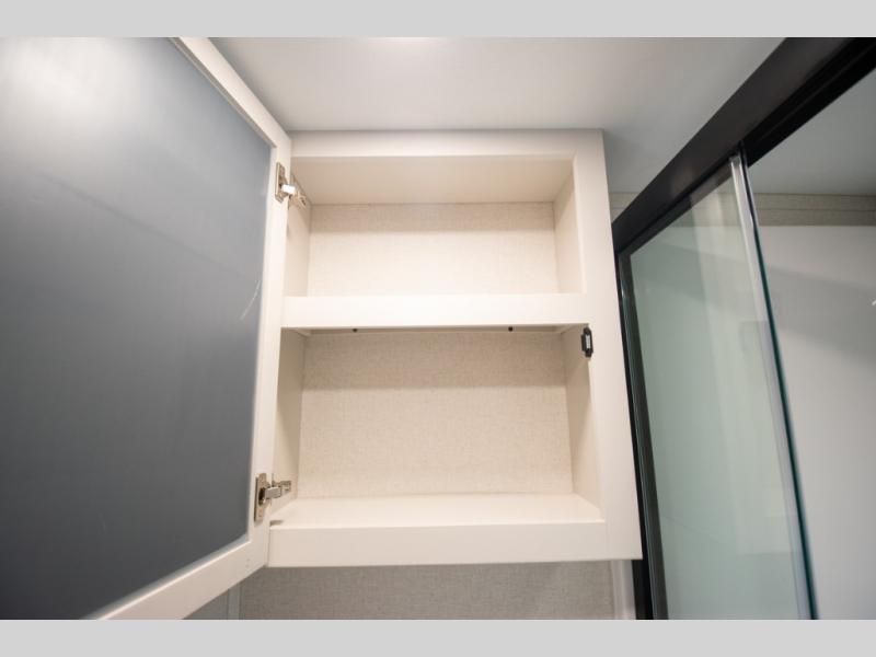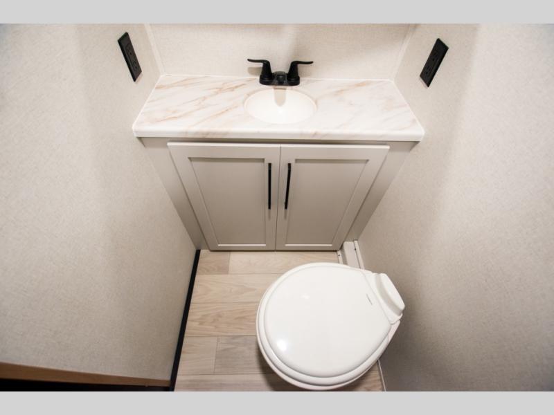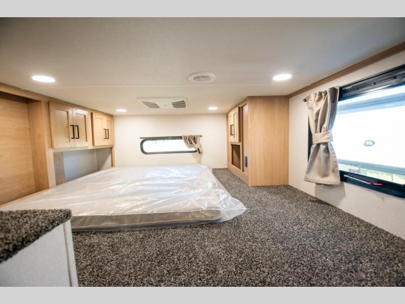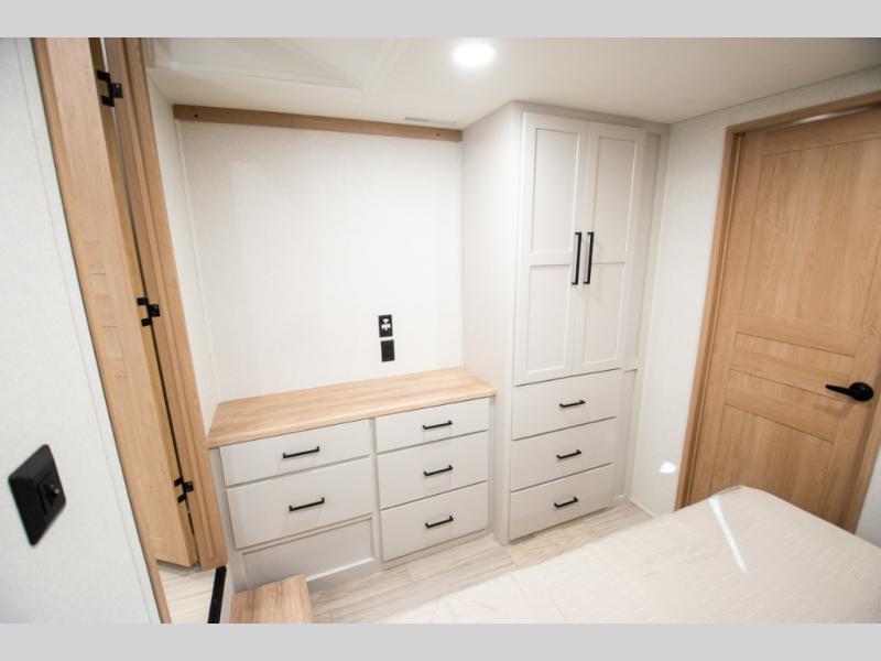 You won't believe the comfort and convenience found in this destination trailer. There are two private bedrooms; one up front with a queen bed slide out and storage space, and one in back with a queen bed slide out and a half bath! There is even washer and dryer prep here if you want to add those appliances and the second entry door is also found in this location so you can easily slip out in the morning. Above each of these rooms is a loft providing three total bunk mats for sleeping, storage cabinets, and TV prep if you want to add entertainment. Everyone can meet in the combined kitchen and living room that includes dual opposing slides, a 60" theater seating across from a 50" flat screen TV and fireplace, plus a free-standing table with chairs and a bench to dine at. The chef of your group will love the large kitchen island, Chef Collection three burner range, and a 16.2 cu. ft. refrigerator for food storage.