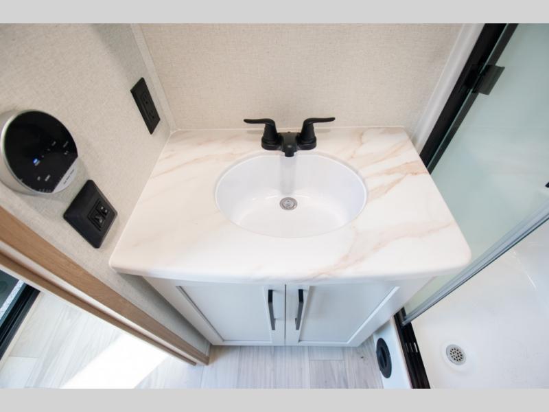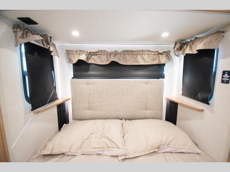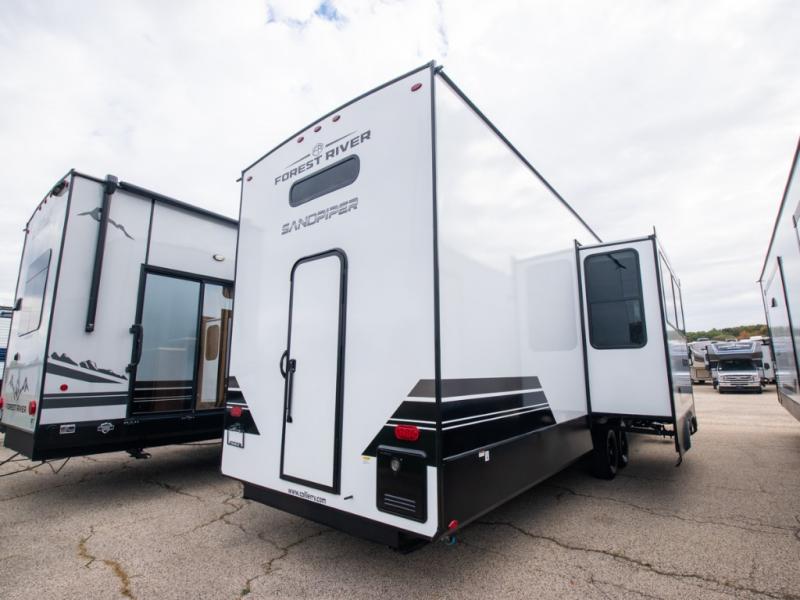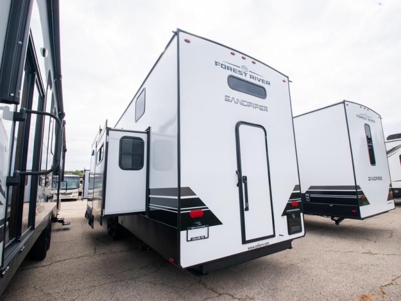 With each Sandpiper Destination Trailer by Forest River you will enjoy many luxurious features, such as crown molding over the kitchen cabinets, solid surface kitchen countertops, a memory foam mattress, plus so much more. The extra large picture windows throughout let natural light in and provide beautiful outdoor views, and each model includes three or more slides for added interior space. You'll find many exterior conveniences, like the porch light with an interior switch, the rain gutters with extra long drip spouts to prevent black streaking, and an electric awning with LED light strip, plus more! You will stay comfortable year around with dual 15,000 A/C units plus each model is constructed with an Underbelly Armor for better protection and insulation!