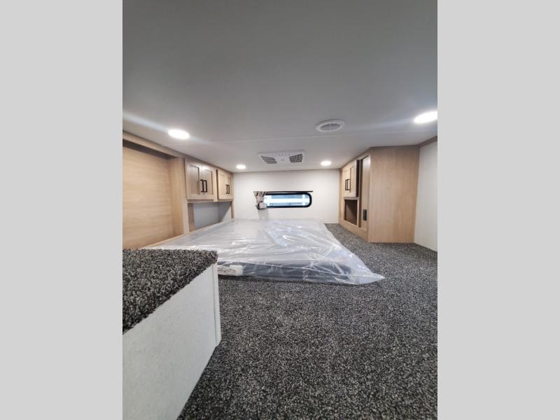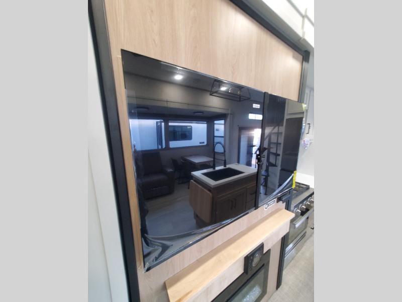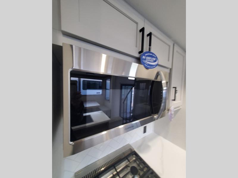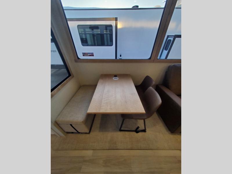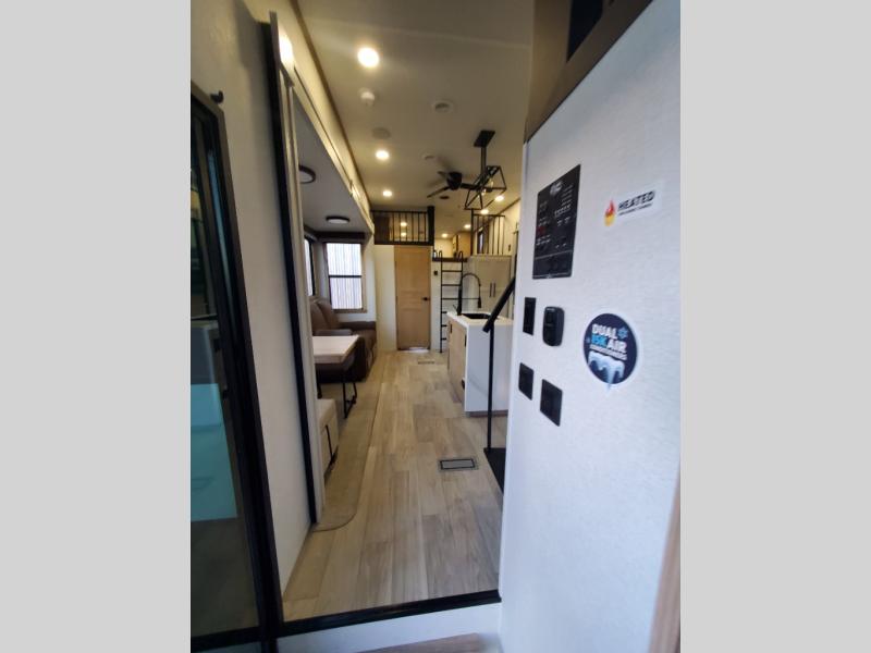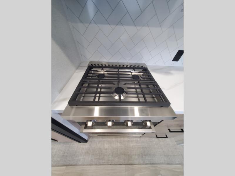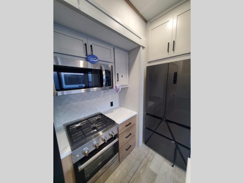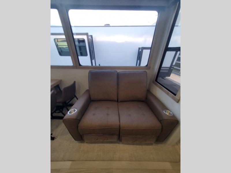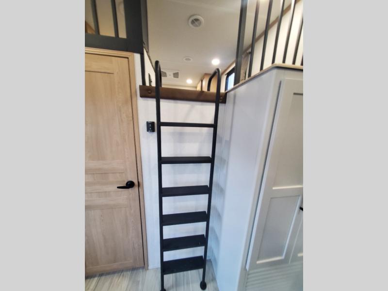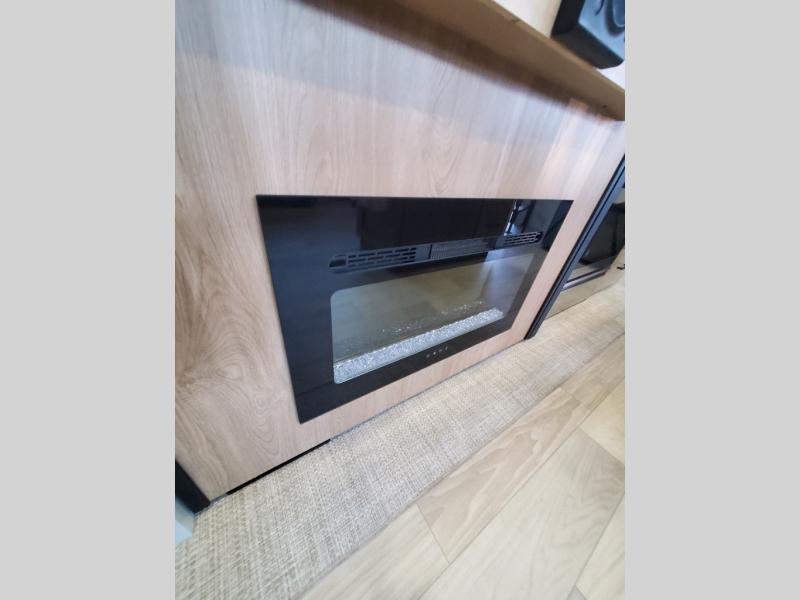 You won't believe the comfort and convenience found in this destination trailer. There are two private bedrooms; one up front with a queen bed slide out and storage space, and one in back with a queen bed slide out and a half bath! There is even washer and dryer prep here if you want to add those appliances and the second entry door is also found in this location so you can easily slip out in the morning. Above each of these rooms is a loft providing three total bunk mats for sleeping, storage cabinets, and TV prep if you want to add entertainment. Everyone can meet in the combined kitchen and living room that includes dual opposing slides, a 60" theater seating across from a 50" flat screen TV and fireplace, plus a free-standing table with chairs and a bench to dine at. The chef of your group will love the large kitchen island, Chef Collection three burner range, and a 16.2 cu. ft. refrigerator for food storage.