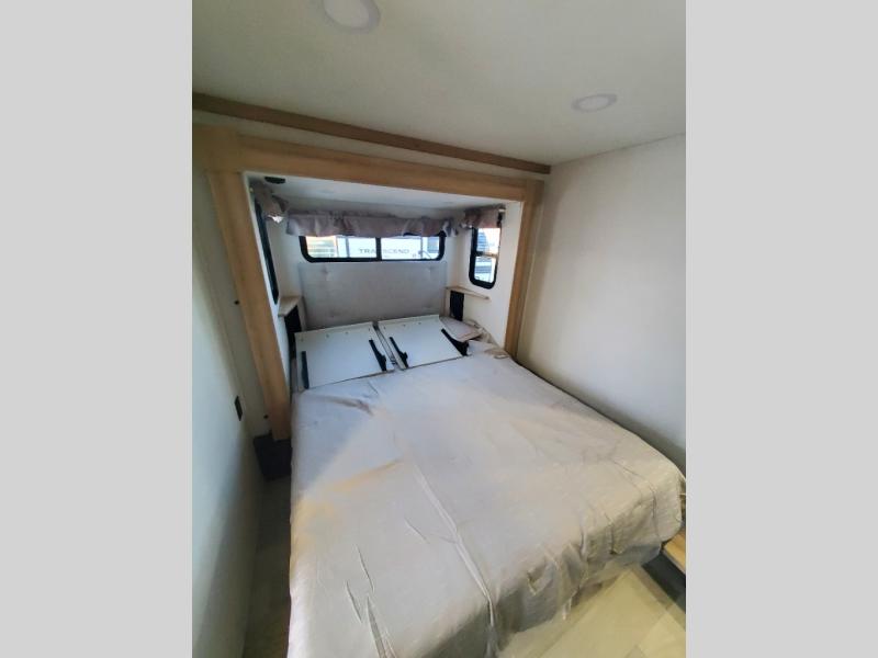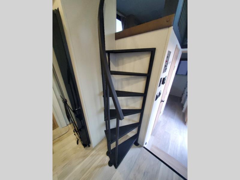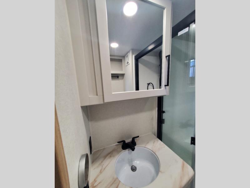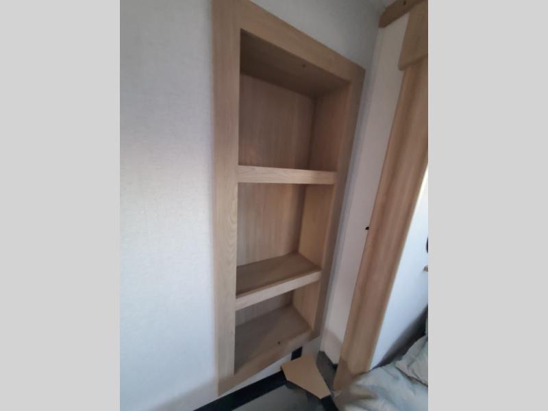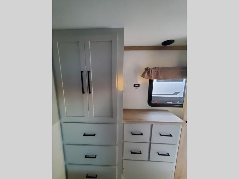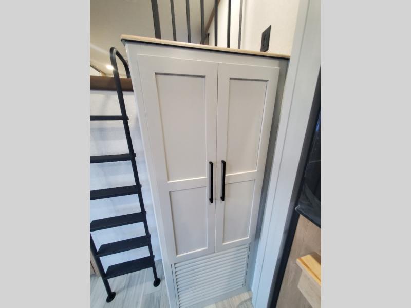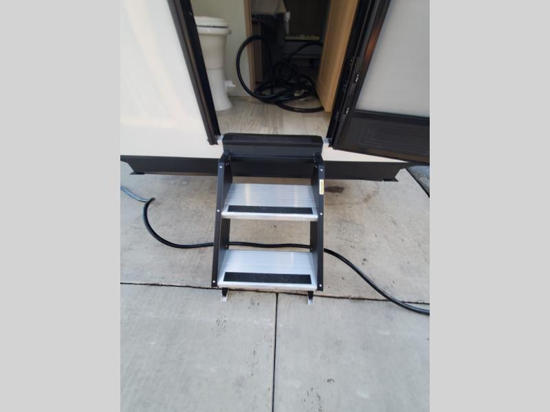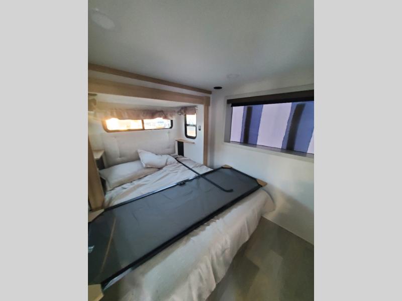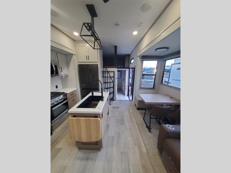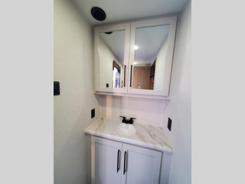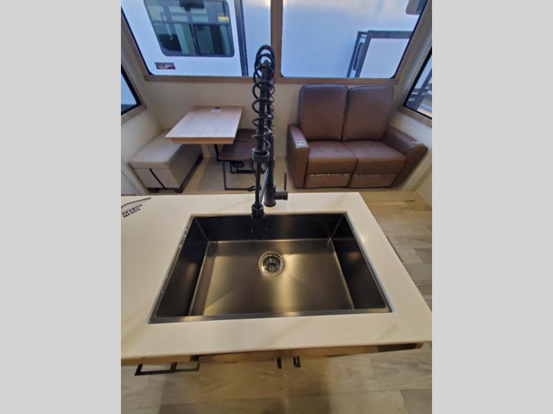 You won't believe the comfort and convenience found in this destination trailer. There are two private bedrooms; one up front with a queen bed slide out and storage space, and one in back with a queen bed slide out and a half bath! There is even washer and dryer prep here if you want to add those appliances and the second entry door is also found in this location so you can easily slip out in the morning. Above each of these rooms is a loft providing three total bunk mats for sleeping, storage cabinets, and TV prep if you want to add entertainment. Everyone can meet in the combined kitchen and living room that includes dual opposing slides, a 60" theater seating across from a 50" flat screen TV and fireplace, plus a free-standing table with chairs and a bench to dine at. The chef of your group will love the large kitchen island, Chef Collection three burner range, and a 16.2 cu. ft. refrigerator for food storage.
