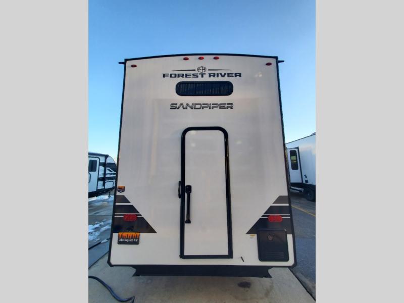 With each Sandpiper Destination Trailer by Forest River you will enjoy many luxurious features, such as crown molding over the kitchen cabinets, solid surface kitchen countertops, a memory foam mattress, plus so much more. The extra large picture windows throughout let natural light in and provide beautiful outdoor views, and each model includes three or more slides for added interior space. You'll find many exterior conveniences, like the porch light with an interior switch, the rain gutters with extra long drip spouts to prevent black streaking, and an electric awning with LED light strip, plus more! You will stay comfortable year around with dual 15,000 A/C units plus each model is constructed with an Underbelly Armor for better protection and insulation!