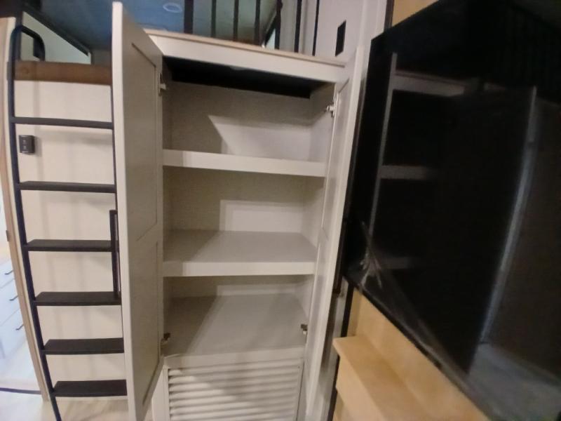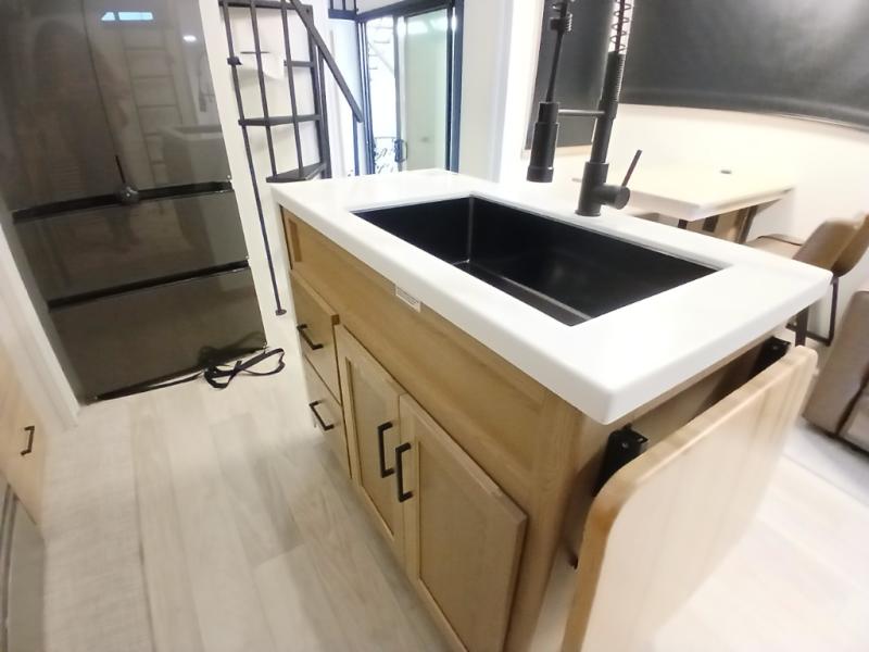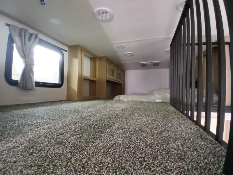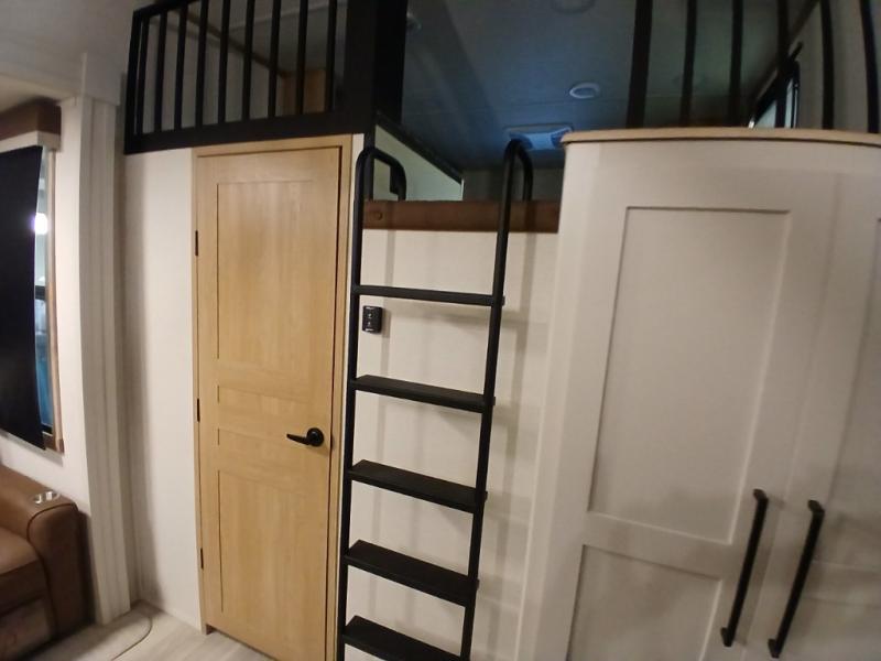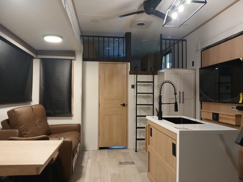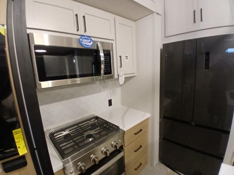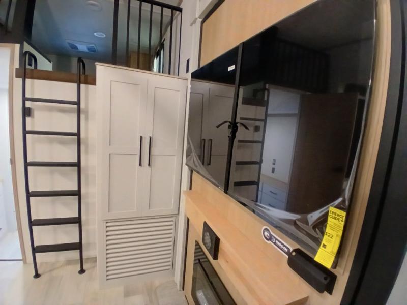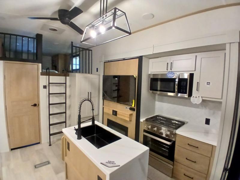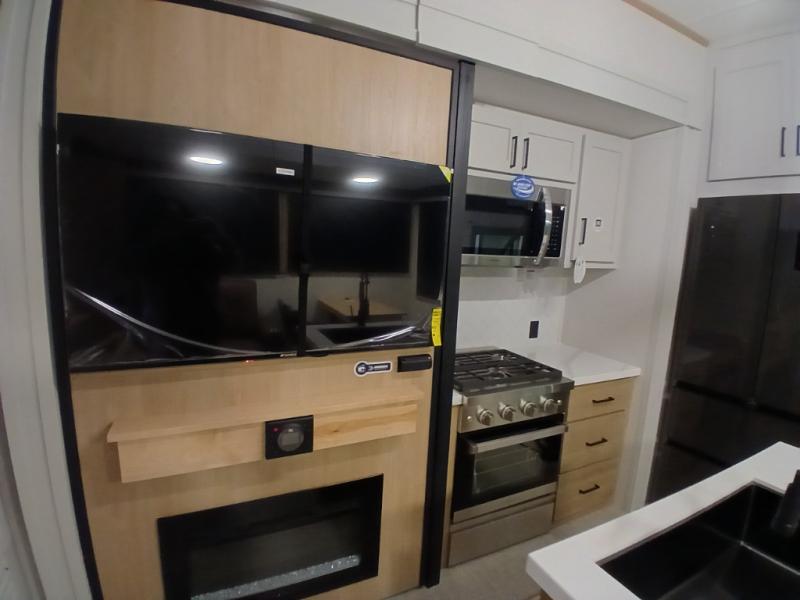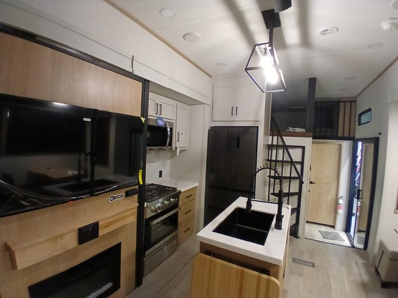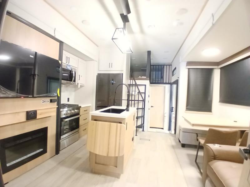 You won't believe the comfort and convenience found in this destination trailer. There are two private bedrooms; one up front with a queen bed slide out and storage space, and one in back with a queen bed slide out and a half bath! There is even washer and dryer prep here if you want to add those appliances and the second entry door is also found in this location so you can easily slip out in the morning. Above each of these rooms is a loft providing three total bunk mats for sleeping, storage cabinets, and TV prep if you want to add entertainment. Everyone can meet in the combined kitchen and living room that includes dual opposing slides, a 60" theater seating across from a 50" flat screen TV and fireplace, plus a free-standing table with chairs and a bench to dine at. The chef of your group will love the large kitchen island, Chef Collection three burner range, and a 16.2 cu. ft. refrigerator for food storage.