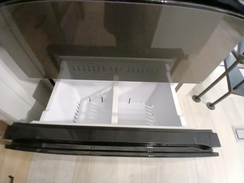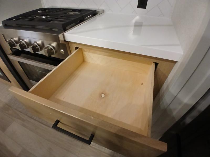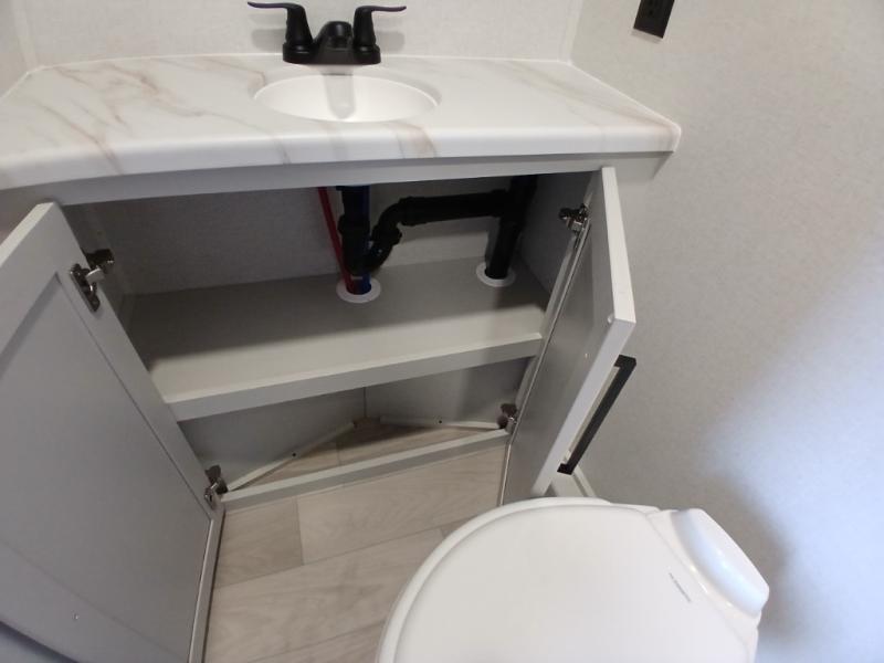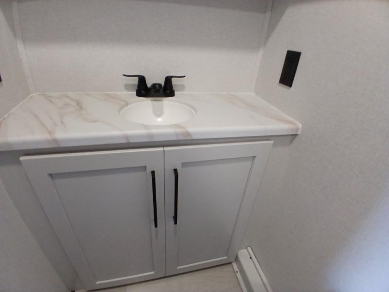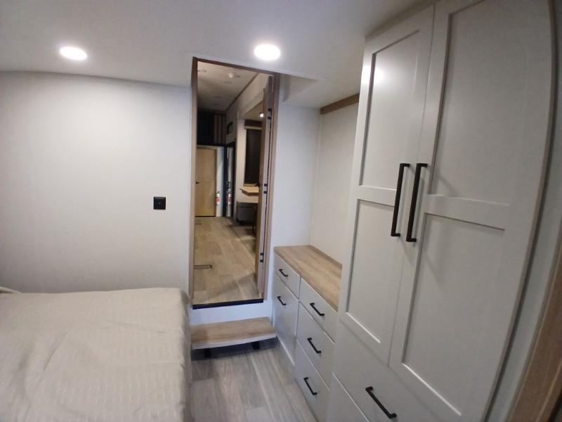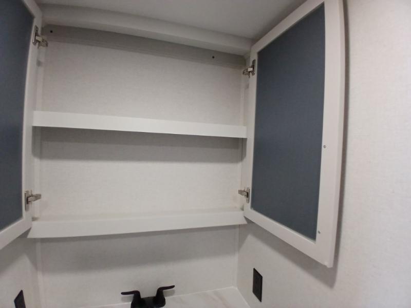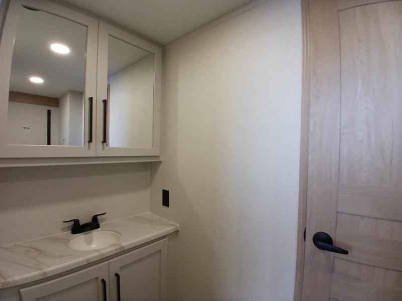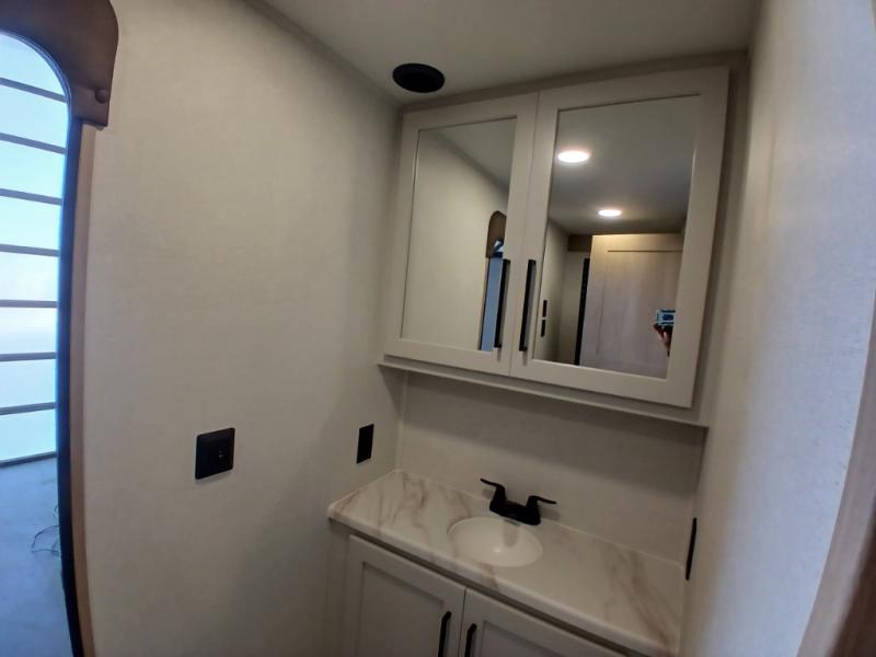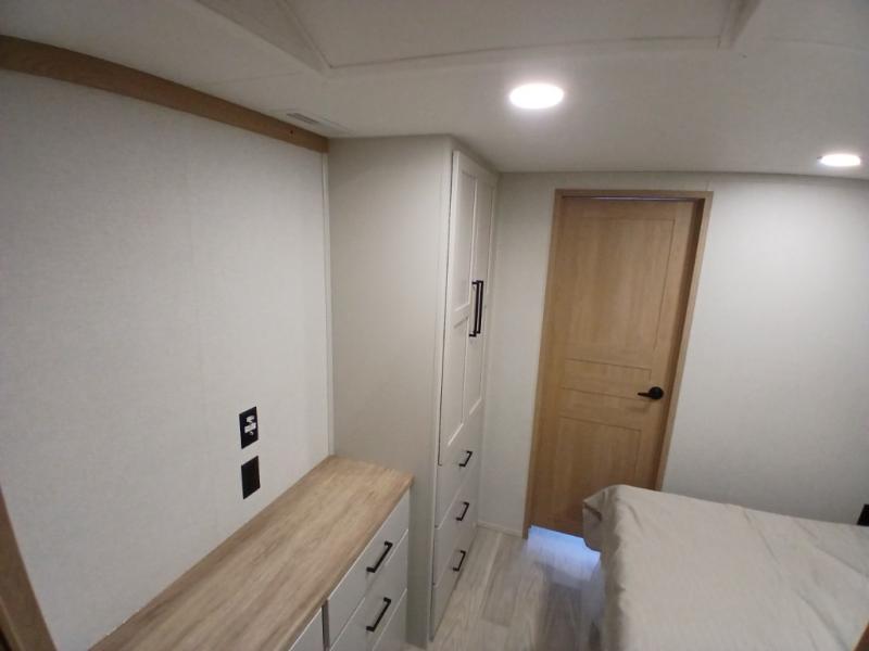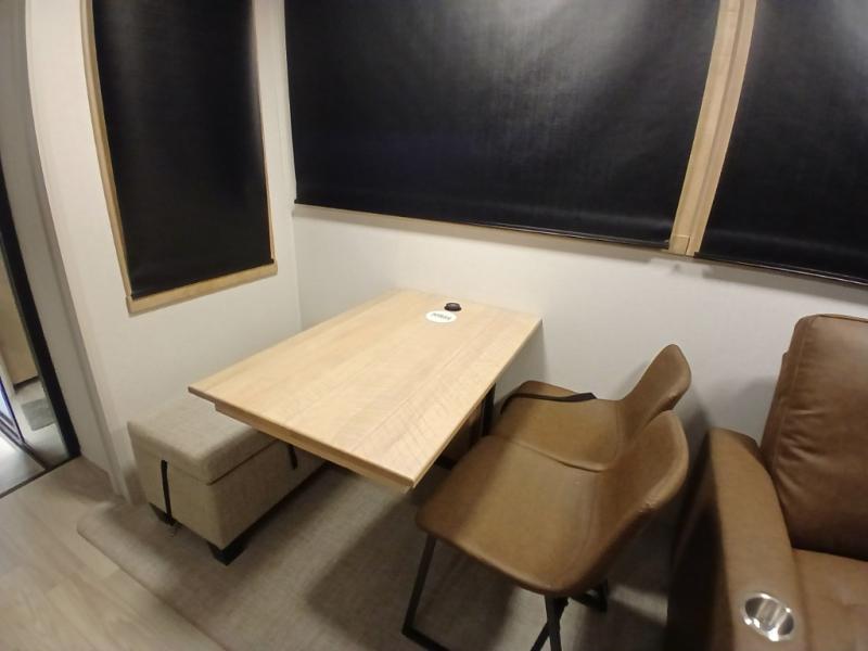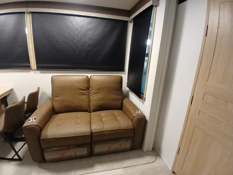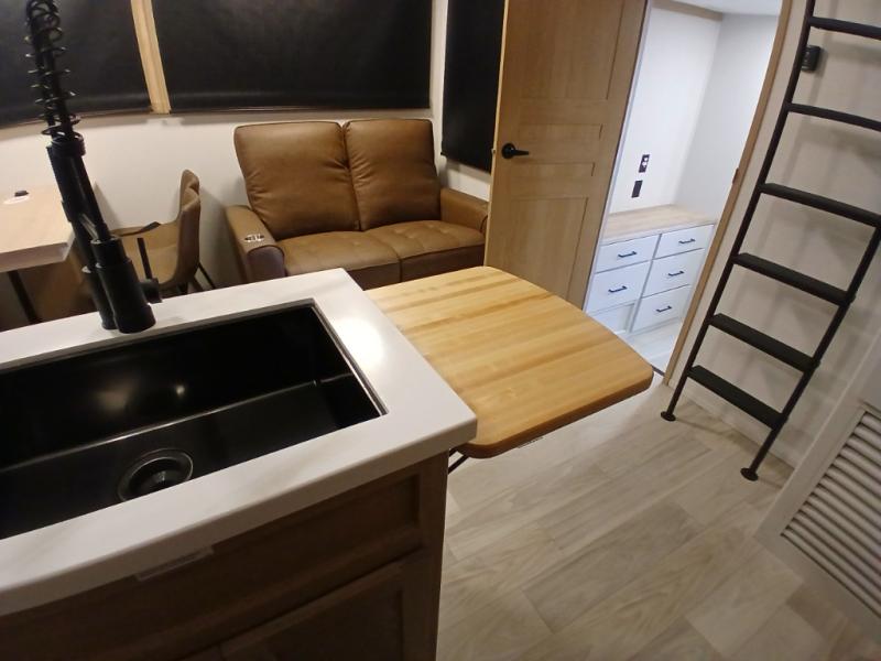 You won't believe the comfort and convenience found in this destination trailer. There are two private bedrooms; one up front with a queen bed slide out and storage space, and one in back with a queen bed slide out and a half bath! There is even washer and dryer prep here if you want to add those appliances and the second entry door is also found in this location so you can easily slip out in the morning. Above each of these rooms is a loft providing three total bunk mats for sleeping, storage cabinets, and TV prep if you want to add entertainment. Everyone can meet in the combined kitchen and living room that includes dual opposing slides, a 60" theater seating across from a 50" flat screen TV and fireplace, plus a free-standing table with chairs and a bench to dine at. The chef of your group will love the large kitchen island, Chef Collection three burner range, and a 16.2 cu. ft. refrigerator for food storage.