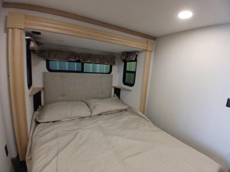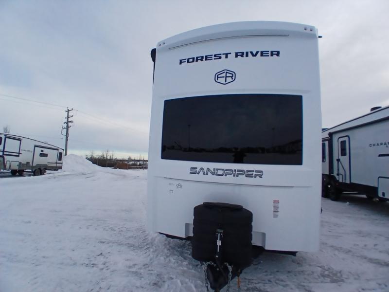 With each Sandpiper Destination Trailer by Forest River you will enjoy many luxurious features, such as crown molding over the kitchen cabinets, solid surface kitchen countertops, a memory foam mattress, plus so much more. The extra large picture windows throughout let natural light in and provide beautiful outdoor views, and each model includes three or more slides for added interior space. You'll find many exterior conveniences, like the porch light with an interior switch, the rain gutters with extra long drip spouts to prevent black streaking, and an electric awning with LED light strip, plus more! You will stay comfortable year around with dual 15,000 A/C units plus each model is constructed with an Underbelly Armor for better protection and insulation!