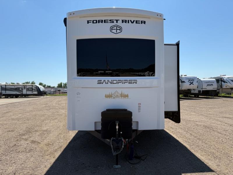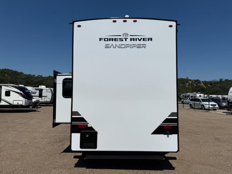 With each Sandpiper Destination Trailer by Forest River you will enjoy many luxurious features, such as crown molding over the kitchen cabinets, solid surface kitchen countertops, a memory foam mattress, plus so much more. The extra large picture windows throughout let natural light in and provide beautiful outdoor views, and each model includes three or more slides for added interior space. You'll find many exterior conveniences, like the porch light with an interior switch, the rain gutters with extra long drip spouts to prevent black streaking, and an electric awning with LED light strip, plus more! You will stay comfortable year around with dual 15,000 A/C units plus each model is constructed with an Underbelly Armor for better protection and insulation!