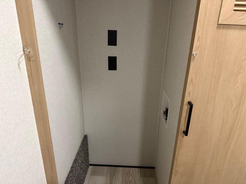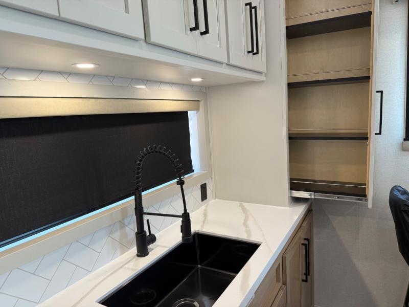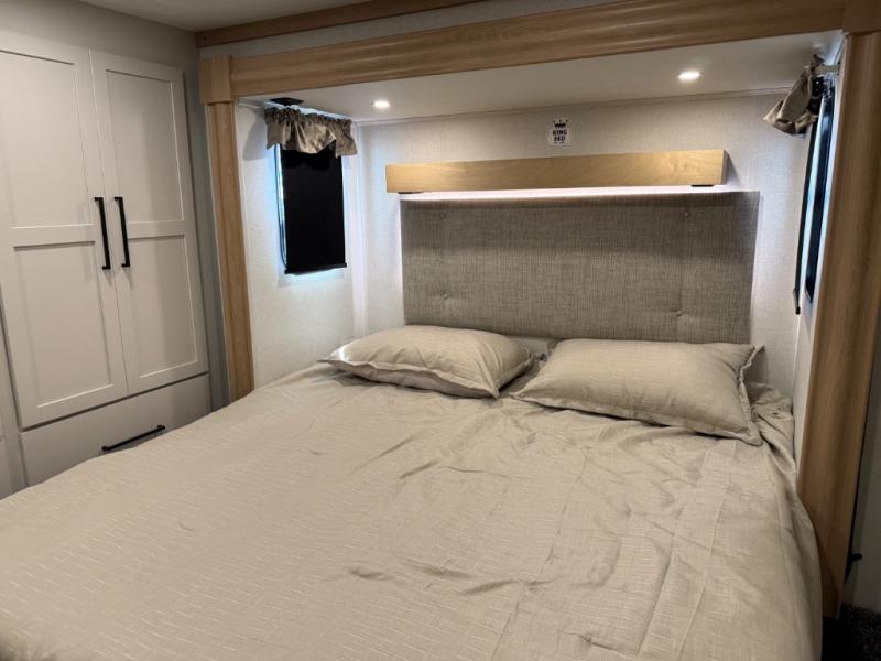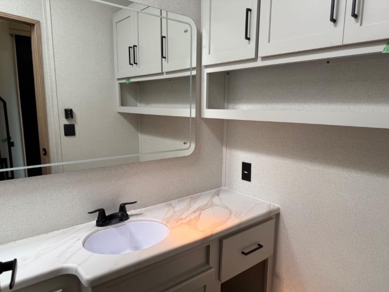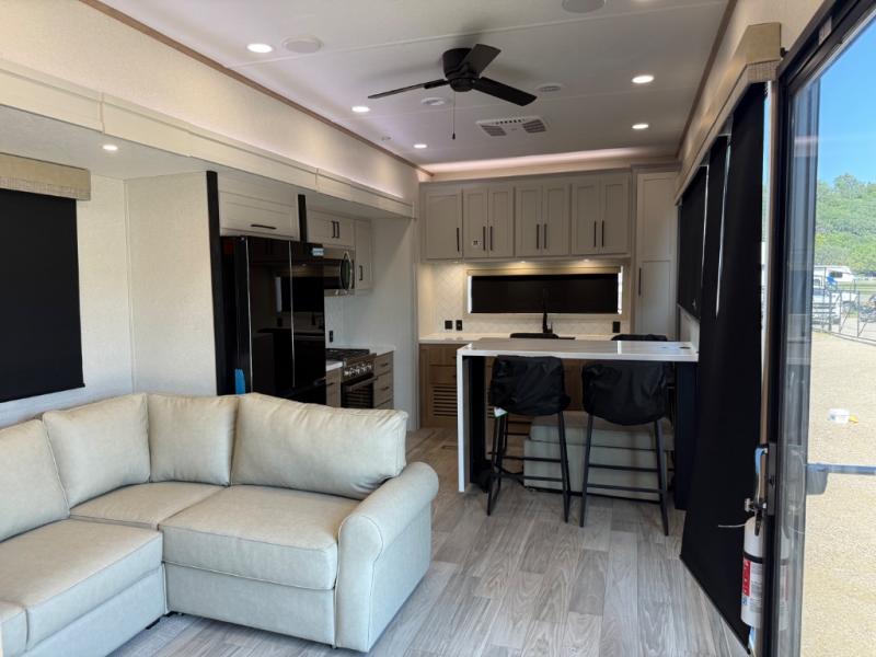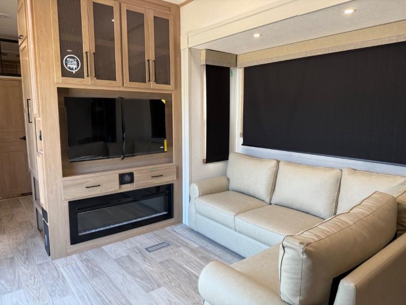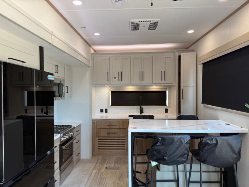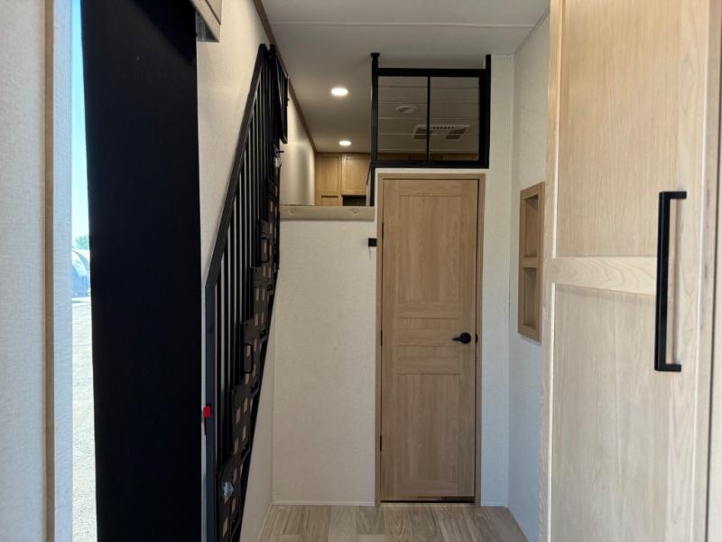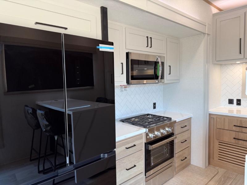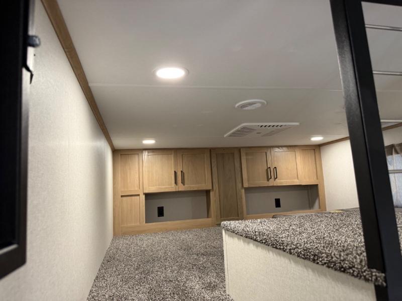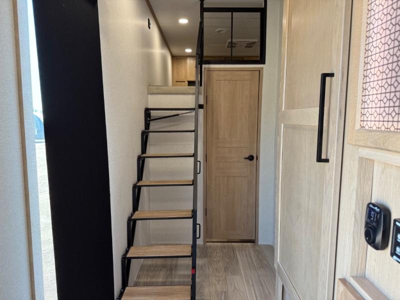 This incredible destination trailer has everything you need to live life to the fullest. Imagine retreating to a peaceful rear bedroom, complete with a king bed slide, spacious wardrobe, plus a closet with washer and dryer prep. Unwind and pamper yourself in style in the incredible full bathroom, featuring a linen closet, medicine cabinets, and a fiberglass shower with a seat. The living room is the heart of the home, boasting a comfortable sectional sofa, ottoman, and entertainment center perfect for gathering with family or friends and creating unforgettable memories. The loft is a cozy retreat for kids or guests, featuring two bunk mats, and a dual wardrobe/bookcases for their things. The front kitchen has a 19 cu. ft. refrigerator, overhead cabinet, microwave, three-burner cooktop, and free-standing dinette with a waterfall edge, and the pantry provides ample storage for all your favorite foods. Finally, step outside and enjoy the shade and protection of the two awnings and the two entry and two exit doors will make it easy to come and go.