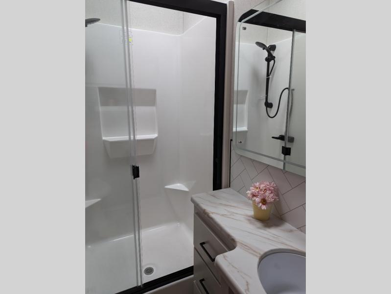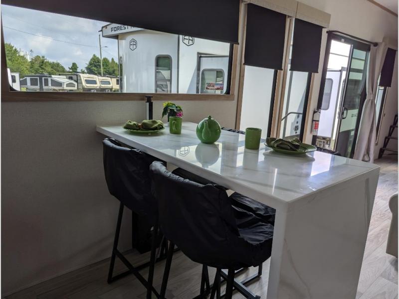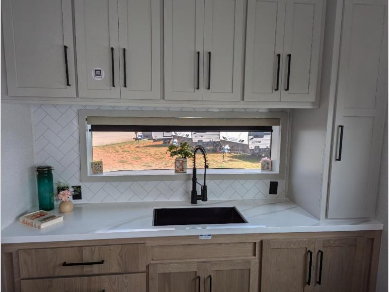 The Sandpiper Destination Trailers by Forest River are ready for extended stays at the location of your choice! The cambered powder coated frame with rust prohibitor will help extend the life of your RV and the Underbelly Armor will protect your trailer and provide better insulation. There are also color matched exterior fiberglass sidewalls outside, along with rain gutters with extra long drip spouts to prevent black streaking, and an exterior porch light just like at home. The Destination Package includes features to make your trips hassle-free, like the two 15,000 BTU A/C units, and on-demand water heater, and Chef Collection three burner 24" range. A commercial style kitchen faucet and designer backsplash is included with the Extended Stay Package, as well as solid surface countertops, and a stainless steel apron sink with a strainer to name a few comforts. Available options include a central vacuum system, stabilizer jacks, plus dual pane windows and more!