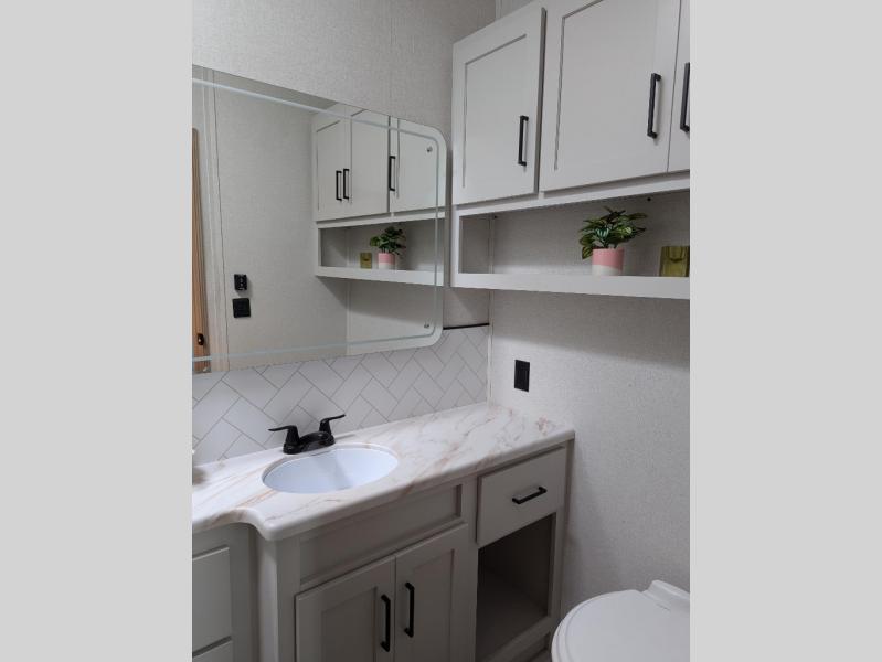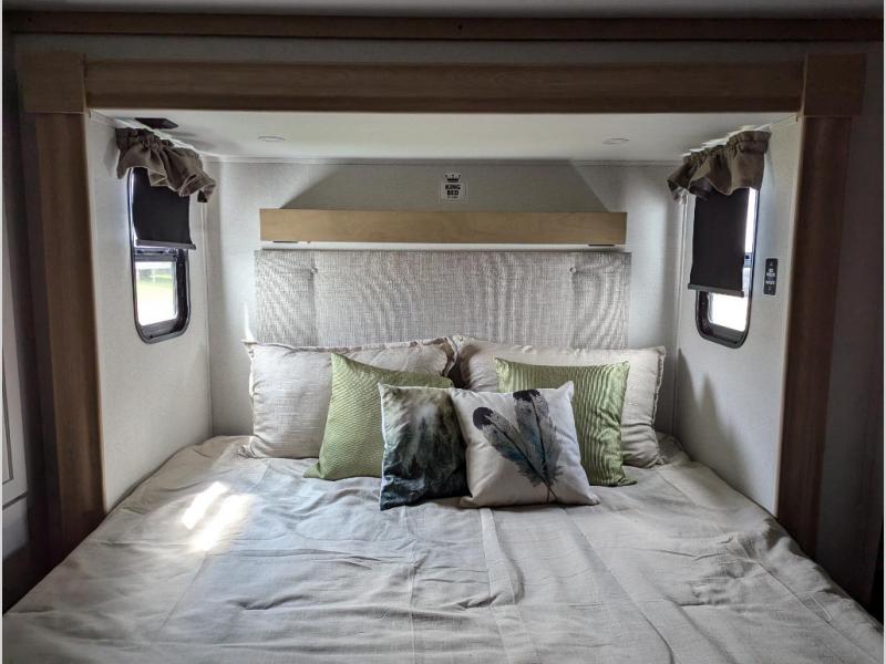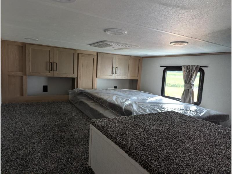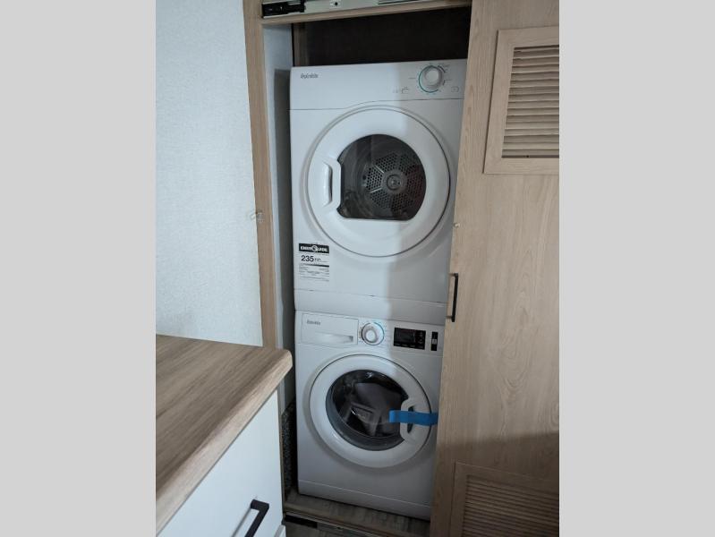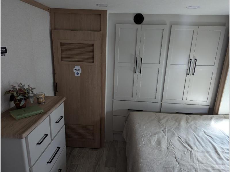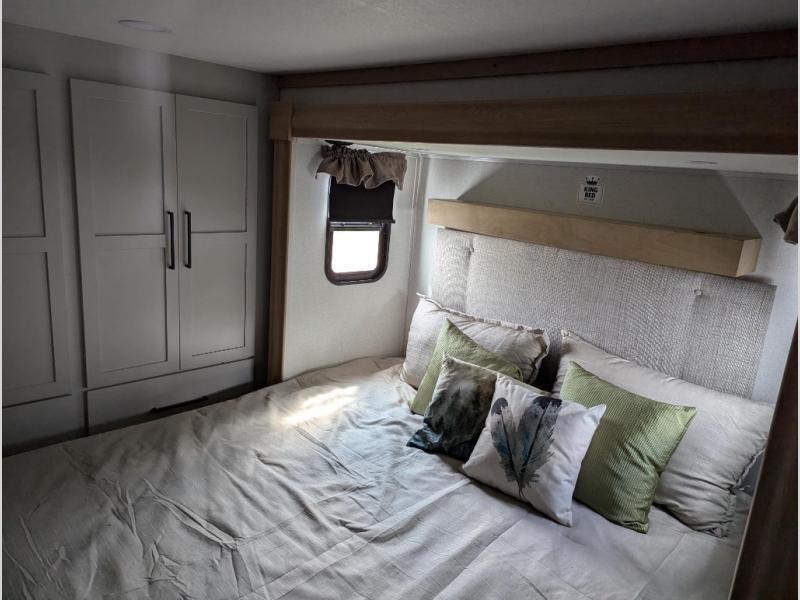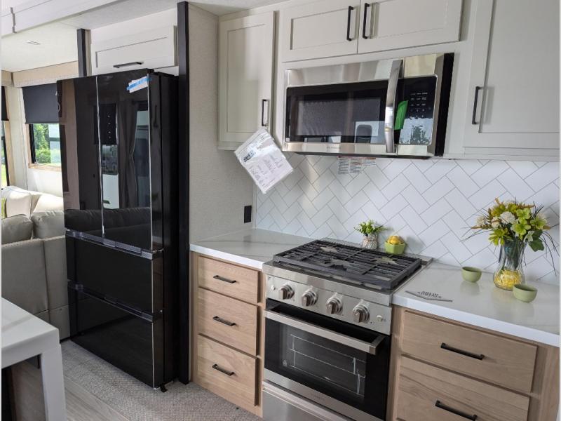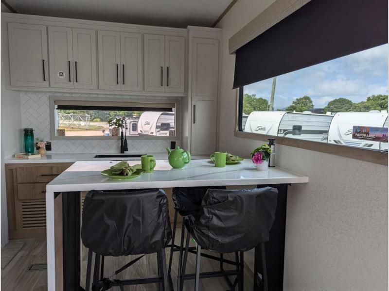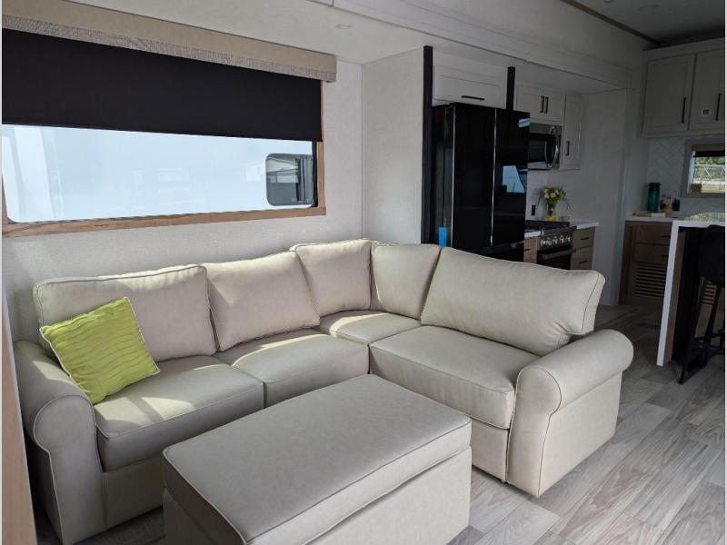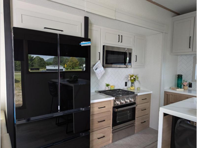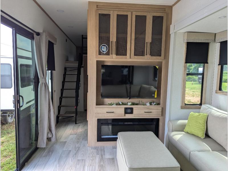 Comfort is found at every turn in this double slide out destination trailer. The chef of your group will love cooking in the front kitchen with ample counter space, a three burner cooktop and 30" over-the-range stainless microwave, plus a 19.6 cu. ft. 12V refrigerator and pantry for food storage. There is a free-standing table with a waterfall edge where you can dine together, and after dinner you can relax on the sectional sofa with an ottoman. There is a collapsible staircase that lead to the loft area that includes two bunk bats, a wardrobe/cabinet, and two wardrobes/bookcases to keep this space tidy. And you'll enjoy your own space in the rear bedroom with its king bed slide out, large wardrobe and dresser, plus a closet with washer and dryer prep!