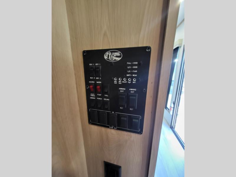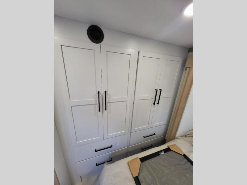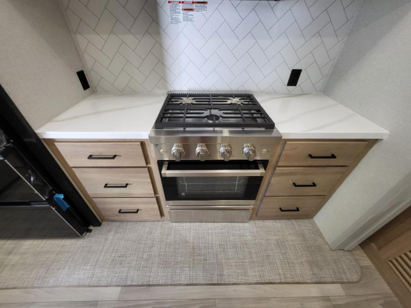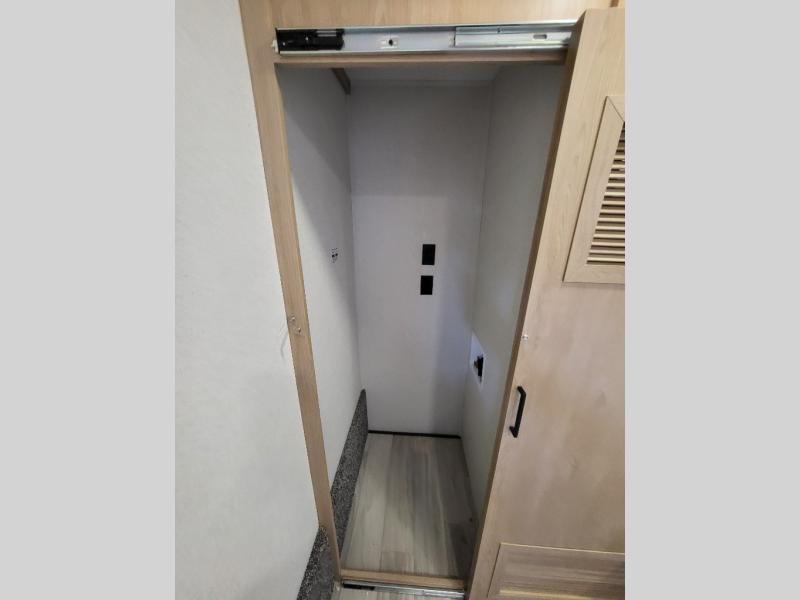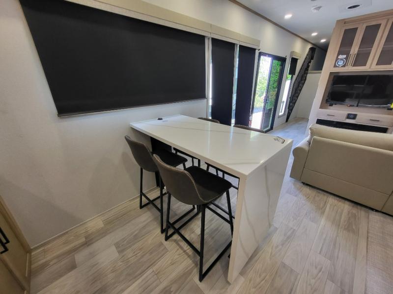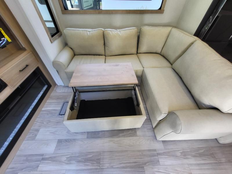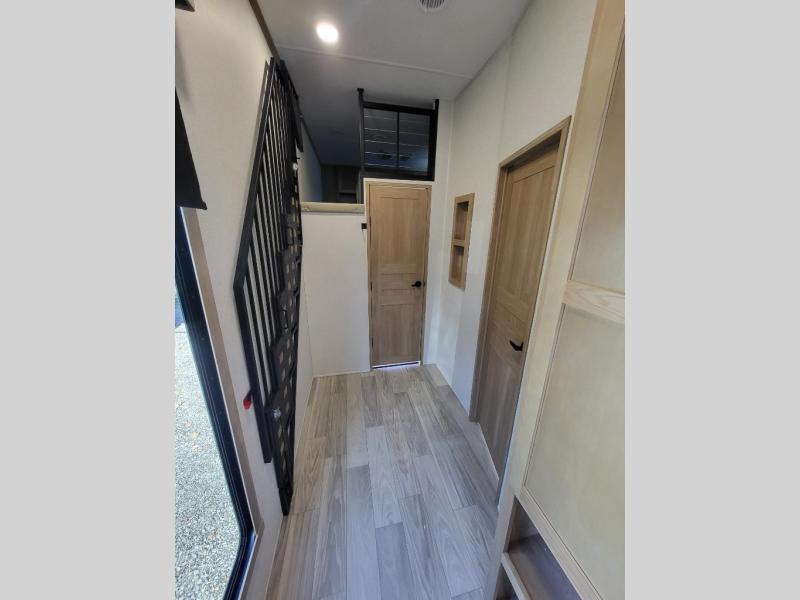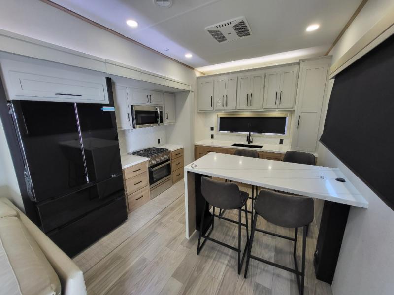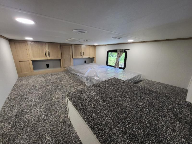 This incredible destination trailer has everything you need to live life to the fullest. Imagine retreating to a peaceful rear bedroom, complete with a king bed, spacious wardrobe, plus a closet with washer and dryer prep. Unwind and pamper yourself in style in the incredible full bathroom, featuring a linen closet, medicine cabinets, and a fiberglass shower with a seat. The living room is the heart of the home, boasting a comfortable sectional sofa, ottoman, and entertainment center perfect for gathering with family or friends and creating unforgettable memories. The loft is a cozy retreat for kids or guests, featuring two bunk mats, and a dual wardrobe/bookcases for their things. The front kitchen has a 19 cu. ft. refrigerator, overhead cabinet, microwave, three-burner cooktop, and free-standing dinette with a waterfall edge, and the pantry provides ample storage for all your favorite foods. Finally, step outside and enjoy the shade and protection of the two awnings and the two entry and two exit doors will make it easy to come and go.