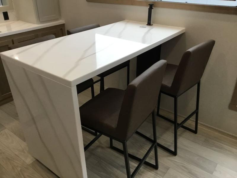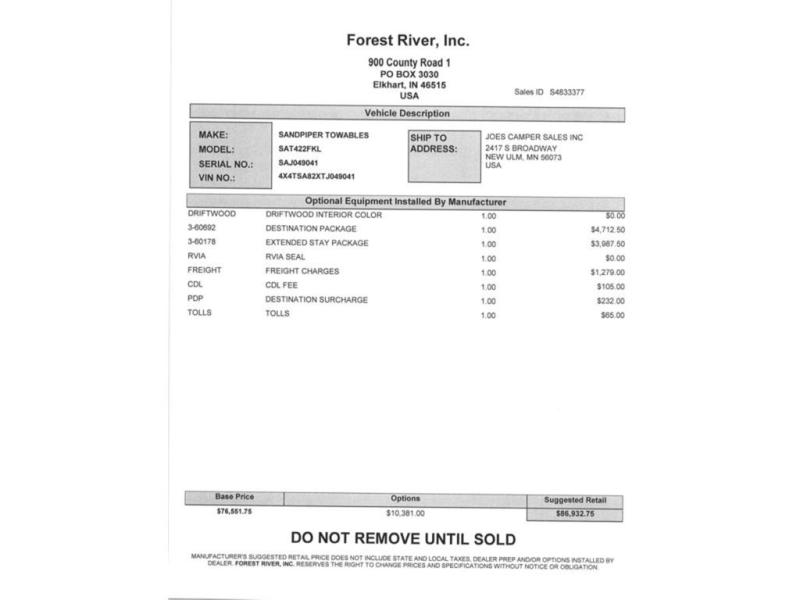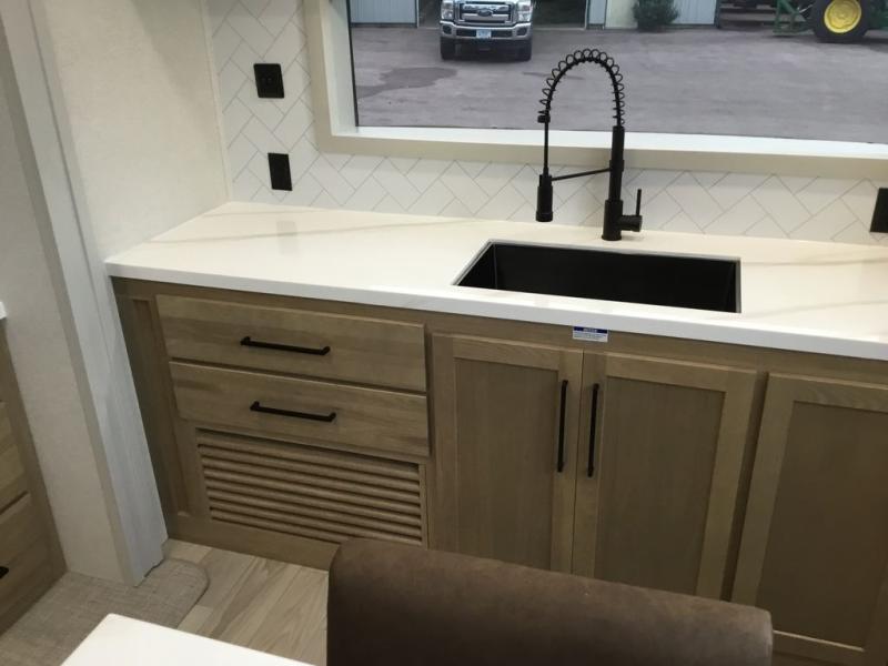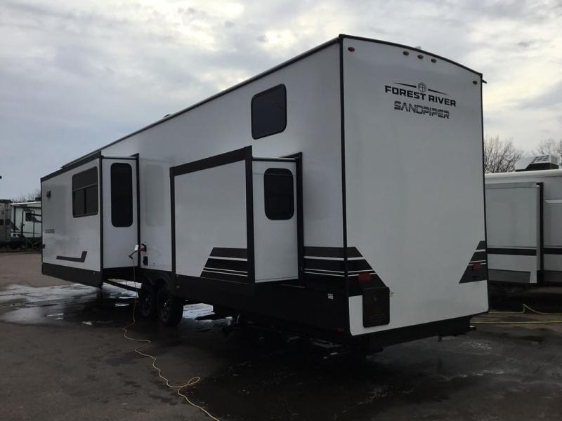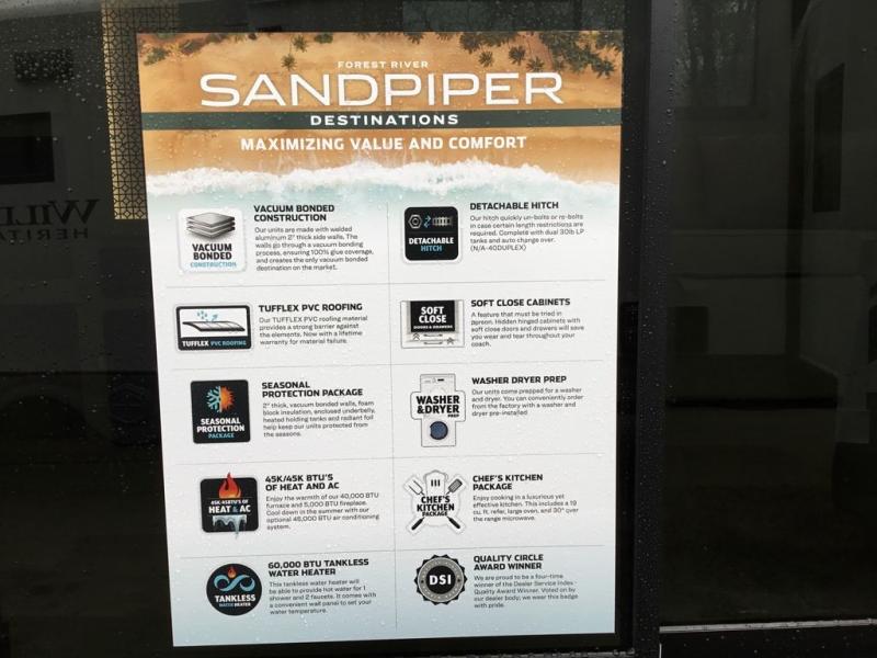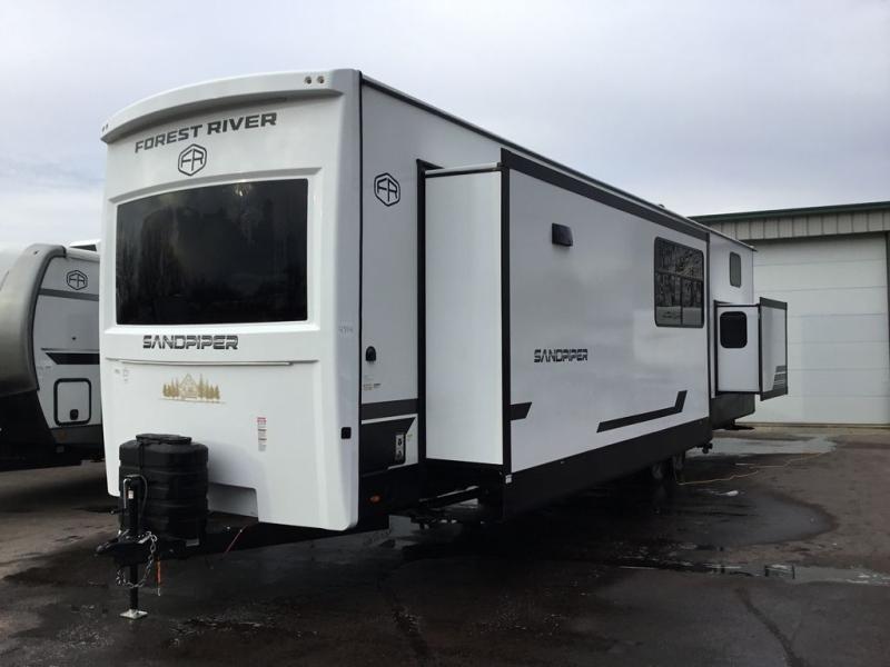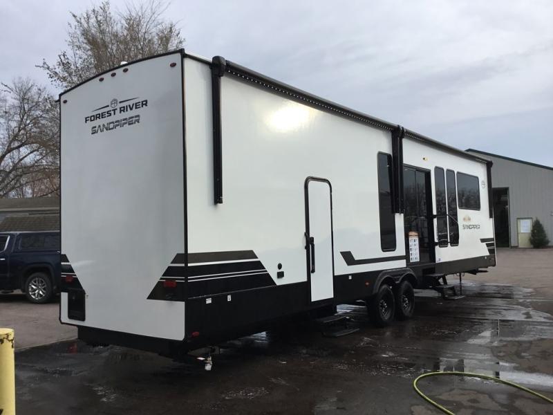 With each Sandpiper Destination Trailer by Forest River you will enjoy many luxurious features, such as crown molding over the kitchen cabinets, solid surface kitchen countertops, a memory foam mattress, plus so much more. The extra large picture windows throughout let natural light in and provide beautiful outdoor views, and each model includes three or more slides for added interior space. You'll find many exterior conveniences, like the porch light with an interior switch, the rain gutters with extra long drip spouts to prevent black streaking, and an electric awning with LED light strip, plus more! You will stay comfortable year around with dual 15,000 A/C units plus each model is constructed with an Underbelly Armor for better protection and insulation!
