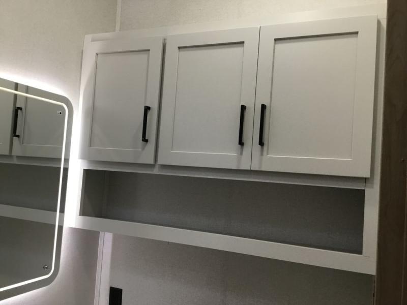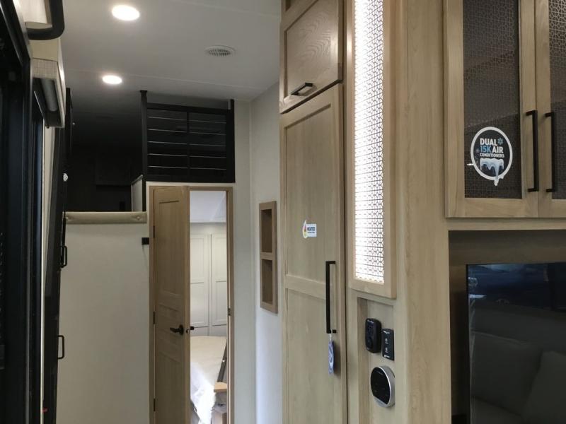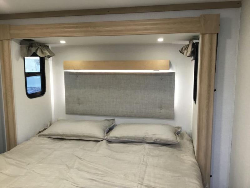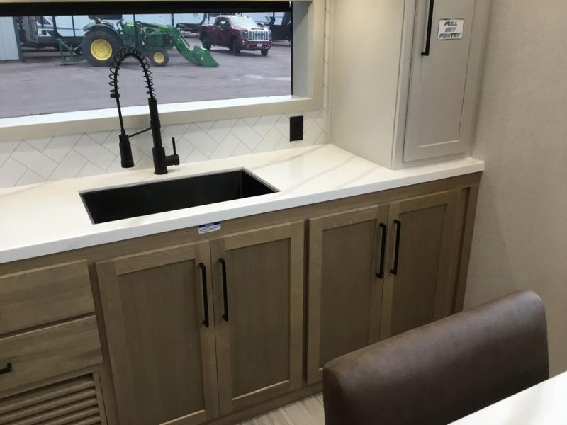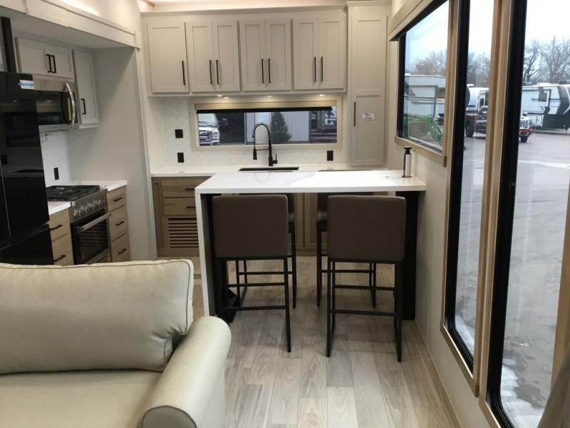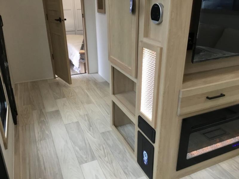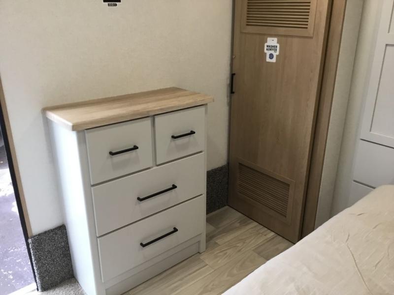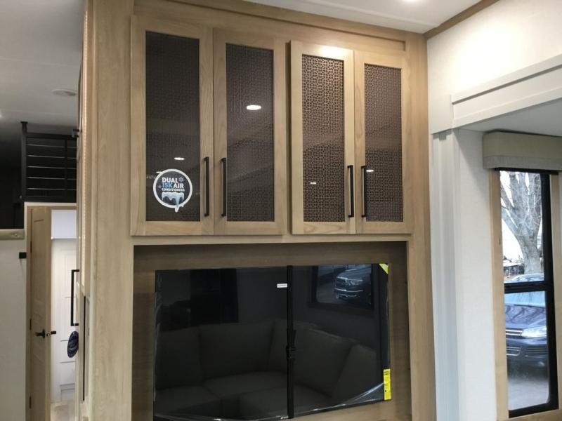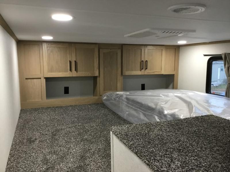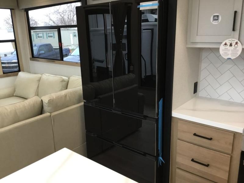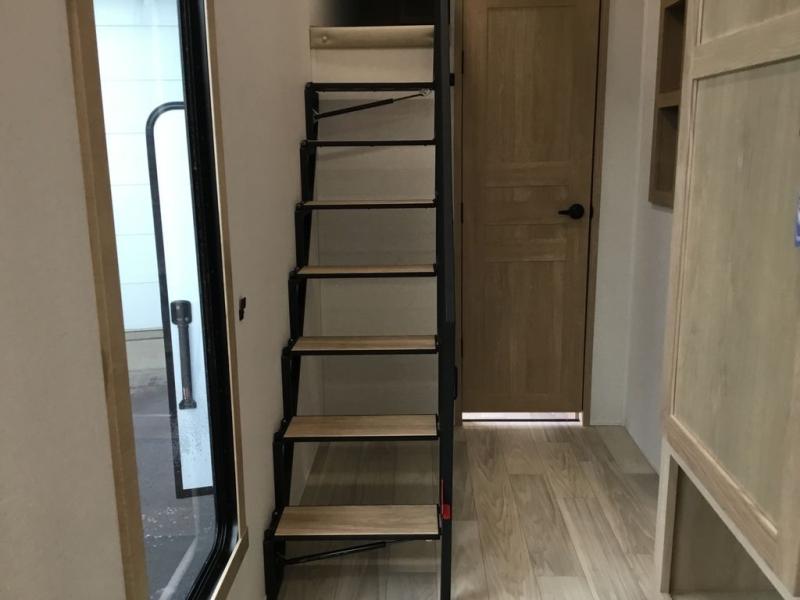 This incredible destination trailer has everything you need to live life to the fullest. Imagine retreating to a peaceful rear bedroom, complete with a king bed slide, spacious wardrobe, plus a closet with washer and dryer prep. Unwind and pamper yourself in style in the incredible full bathroom, featuring a linen closet, medicine cabinets, and a fiberglass shower with a seat. The living room is the heart of the home, boasting a comfortable sectional sofa, ottoman, and entertainment center perfect for gathering with family or friends and creating unforgettable memories. The loft is a cozy retreat for kids or guests, featuring two bunk mats, and a dual wardrobe/bookcases for their things. The front kitchen has a 19 cu. ft. refrigerator, overhead cabinet, microwave, three-burner cooktop, and free-standing dinette with a waterfall edge, and the pantry provides ample storage for all your favorite foods. Finally, step outside and enjoy the shade and protection of the two awnings and the two entry and two exit doors will make it easy to come and go.