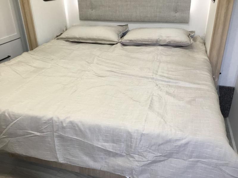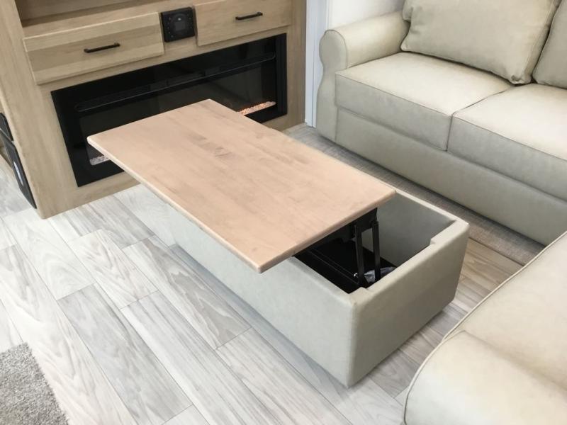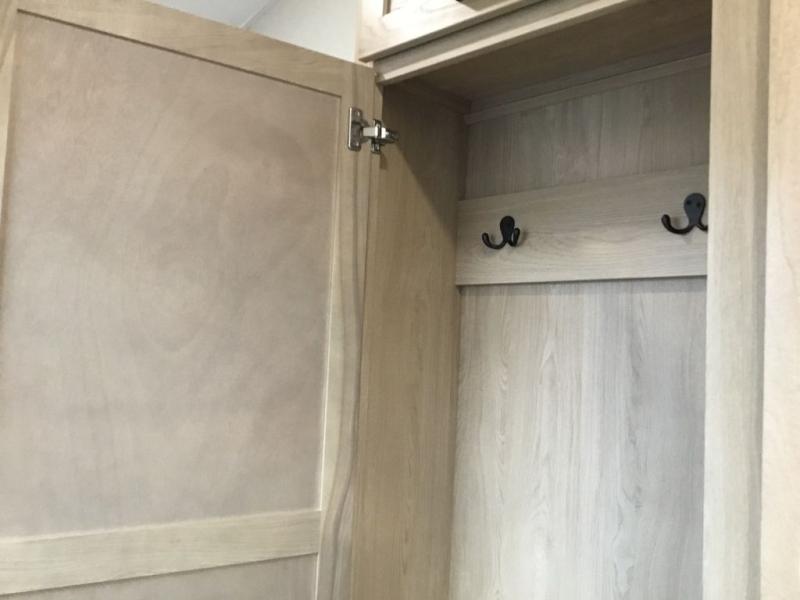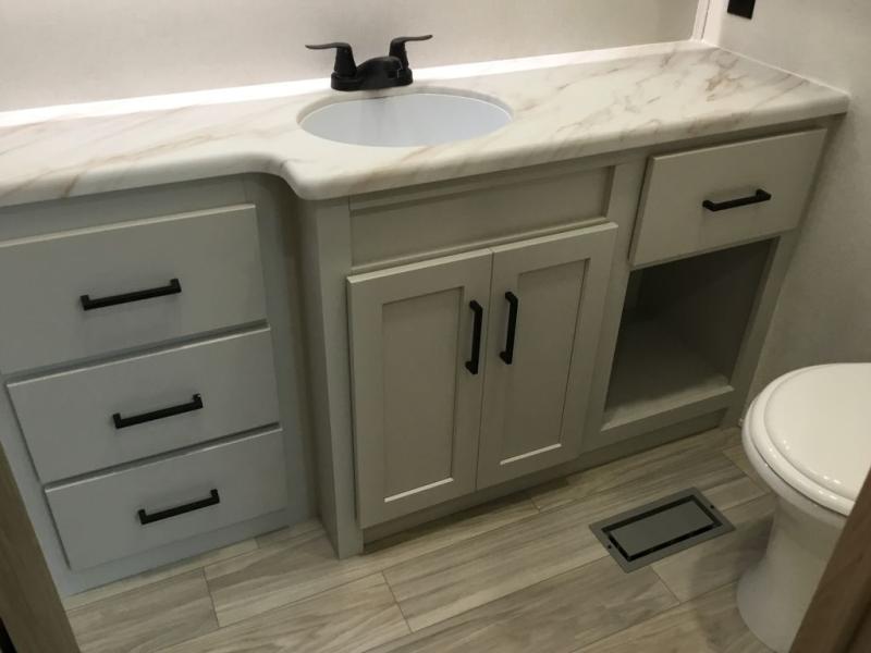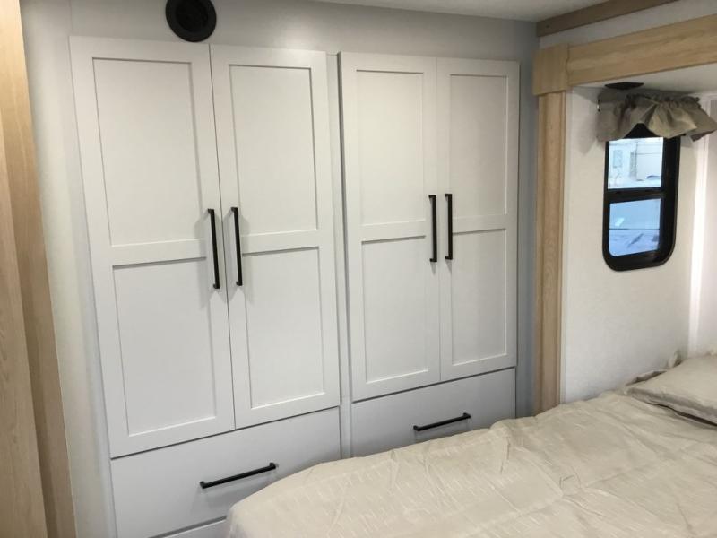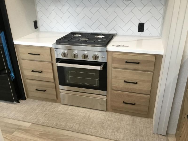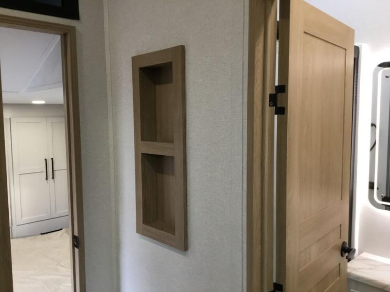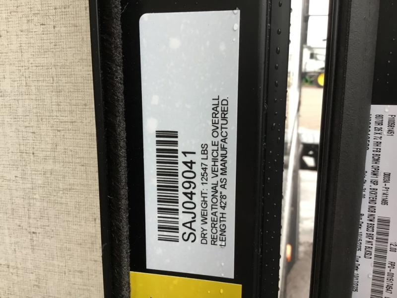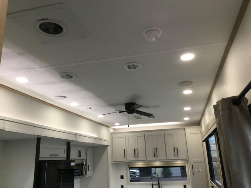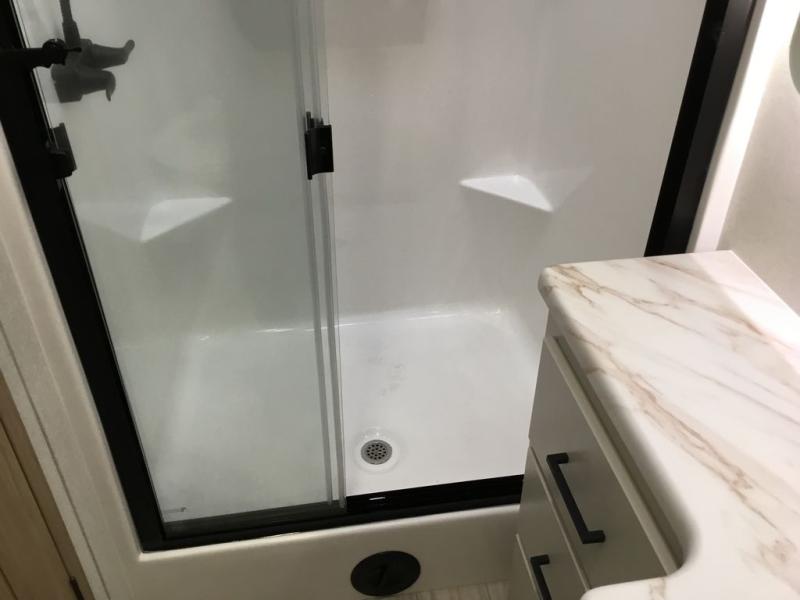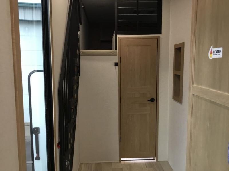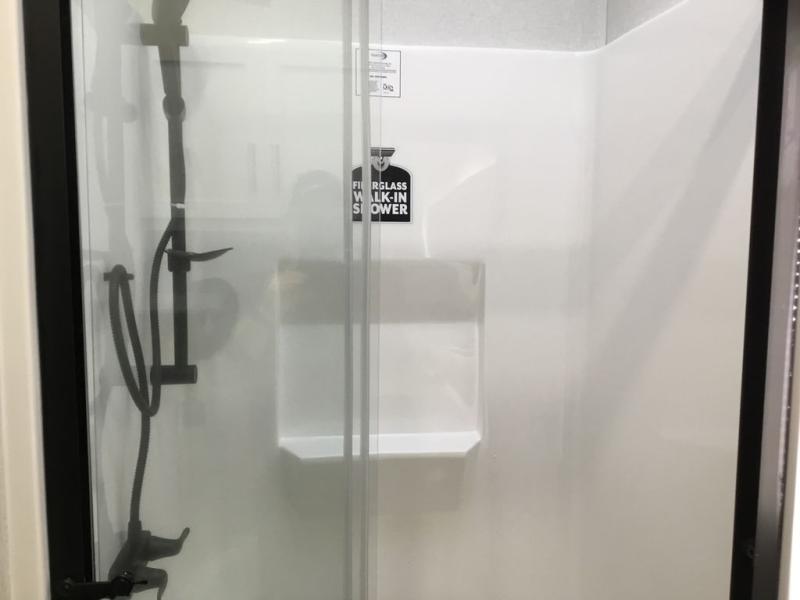 This incredible destination trailer has everything you need to live life to the fullest. Imagine retreating to a peaceful rear bedroom, complete with a king bed slide, spacious wardrobe, plus a closet with washer and dryer prep. Unwind and pamper yourself in style in the incredible full bathroom, featuring a linen closet, medicine cabinets, and a fiberglass shower with a seat. The living room is the heart of the home, boasting a comfortable sectional sofa, ottoman, and entertainment center perfect for gathering with family or friends and creating unforgettable memories. The loft is a cozy retreat for kids or guests, featuring two bunk mats, and a dual wardrobe/bookcases for their things. The front kitchen has a 19 cu. ft. refrigerator, overhead cabinet, microwave, three-burner cooktop, and free-standing dinette with a waterfall edge, and the pantry provides ample storage for all your favorite foods. Finally, step outside and enjoy the shade and protection of the two awnings and the two entry and two exit doors will make it easy to come and go.