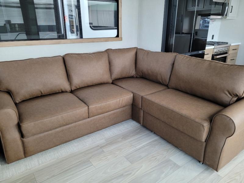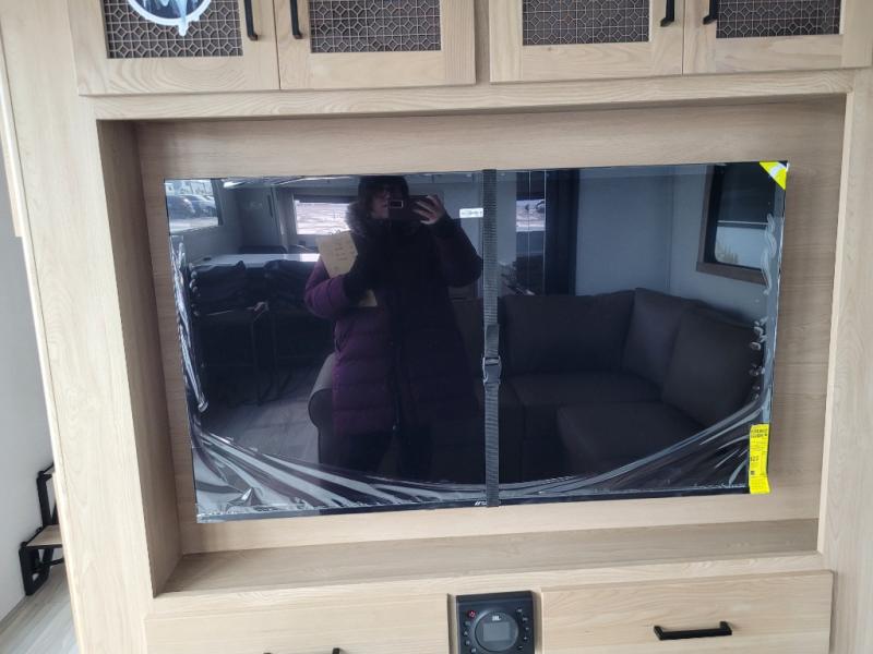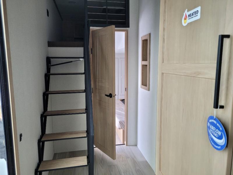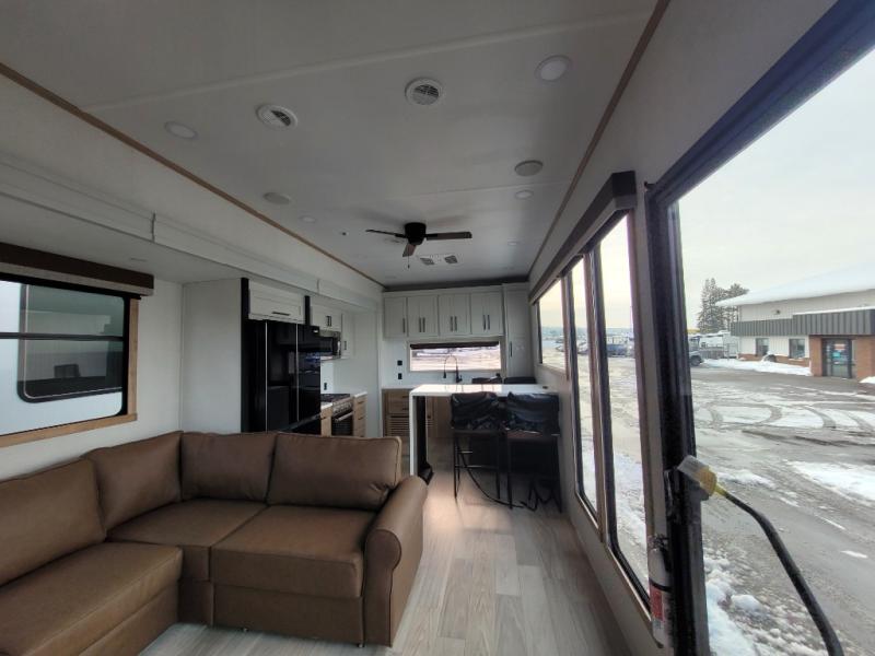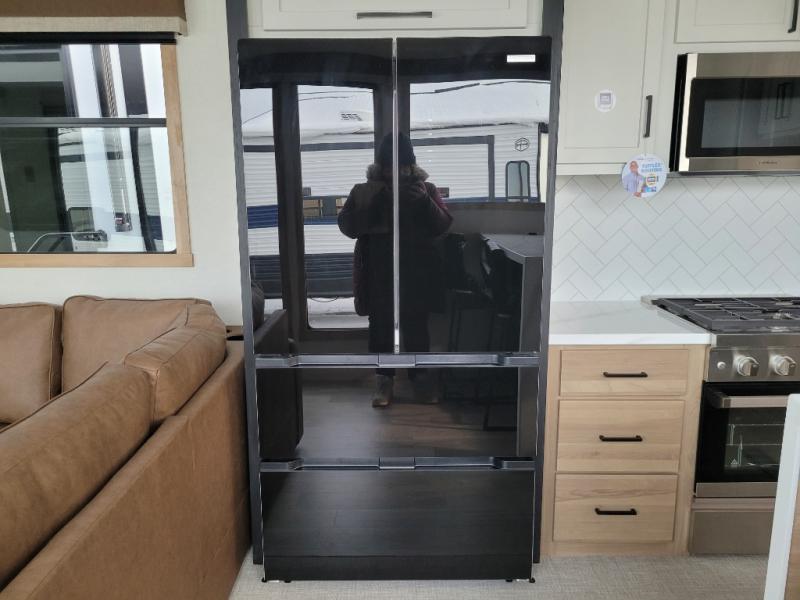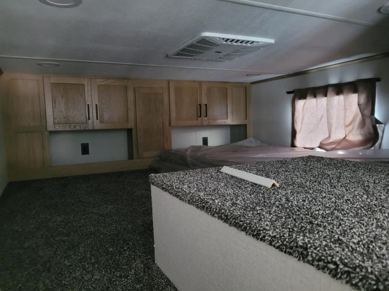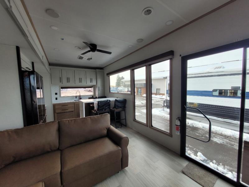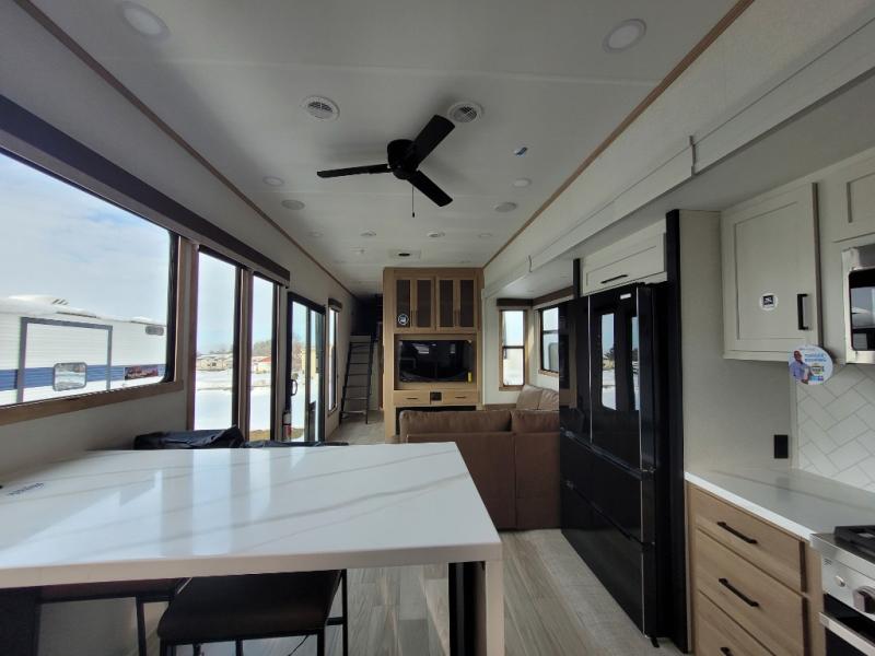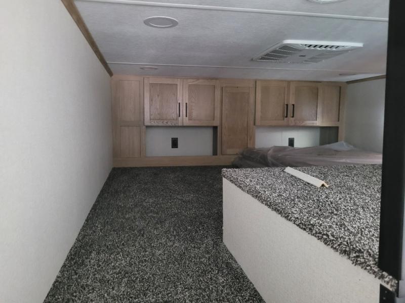 This incredible destination trailer has everything you need to live life to the fullest. Imagine retreating to a peaceful rear bedroom, complete with a king bed slide, spacious wardrobe, plus a closet with washer and dryer prep. Unwind and pamper yourself in style in the incredible full bathroom, featuring a linen closet, medicine cabinets, and a fiberglass shower with a seat. The living room is the heart of the home, boasting a comfortable sectional sofa, ottoman, and entertainment center perfect for gathering with family or friends and creating unforgettable memories. The loft is a cozy retreat for kids or guests, featuring two bunk mats, and a dual wardrobe/bookcases for their things. The front kitchen has a 19 cu. ft. refrigerator, overhead cabinet, microwave, three-burner cooktop, and free-standing dinette with a waterfall edge, and the pantry provides ample storage for all your favorite foods. Finally, step outside and enjoy the shade and protection of the two awnings and the two entry and two exit doors will make it easy to come and go.