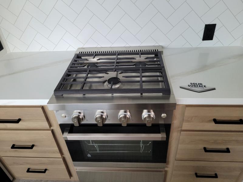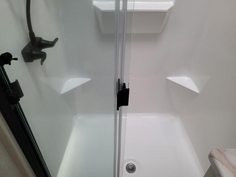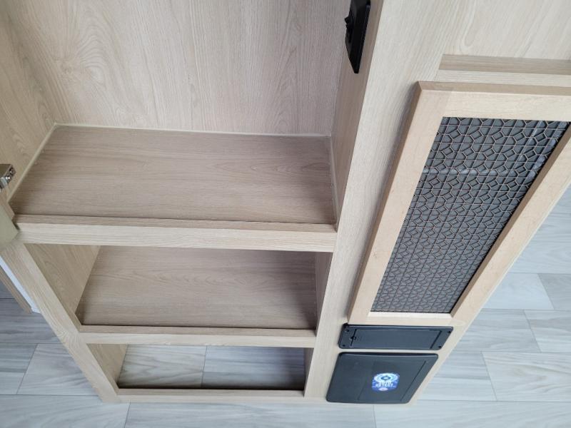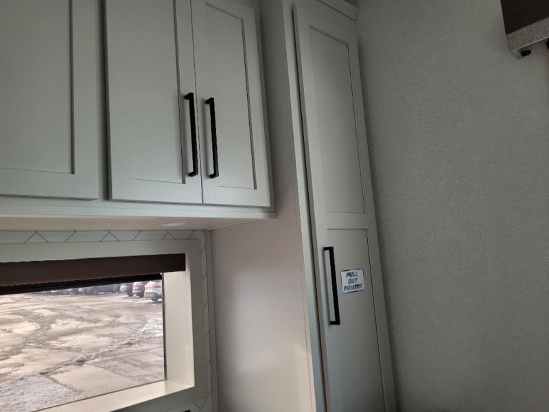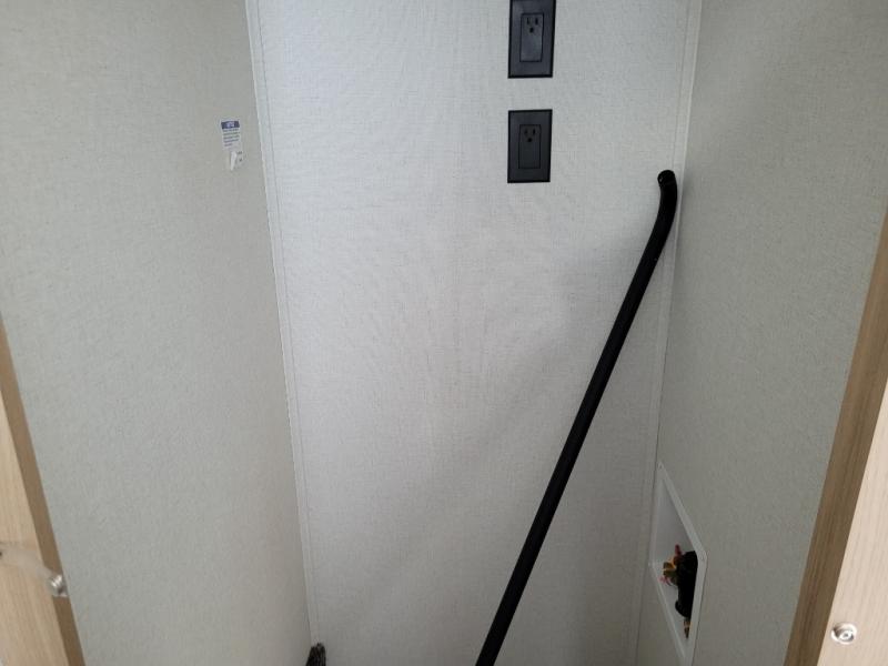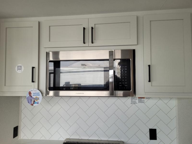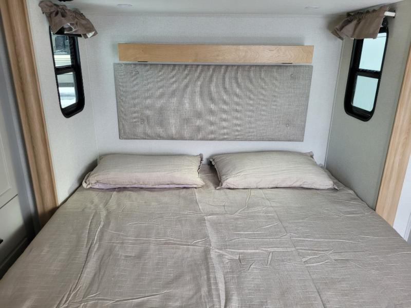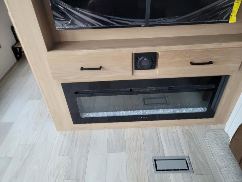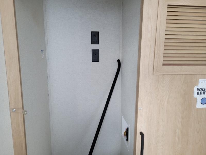 This incredible destination trailer has everything you need to live life to the fullest. Imagine retreating to a peaceful rear bedroom, complete with a king bed slide, spacious wardrobe, plus a closet with washer and dryer prep. Unwind and pamper yourself in style in the incredible full bathroom, featuring a linen closet, medicine cabinets, and a fiberglass shower with a seat. The living room is the heart of the home, boasting a comfortable sectional sofa, ottoman, and entertainment center perfect for gathering with family or friends and creating unforgettable memories. The loft is a cozy retreat for kids or guests, featuring two bunk mats, and a dual wardrobe/bookcases for their things. The front kitchen has a 19 cu. ft. refrigerator, overhead cabinet, microwave, three-burner cooktop, and free-standing dinette with a waterfall edge, and the pantry provides ample storage for all your favorite foods. Finally, step outside and enjoy the shade and protection of the two awnings and the two entry and two exit doors will make it easy to come and go.