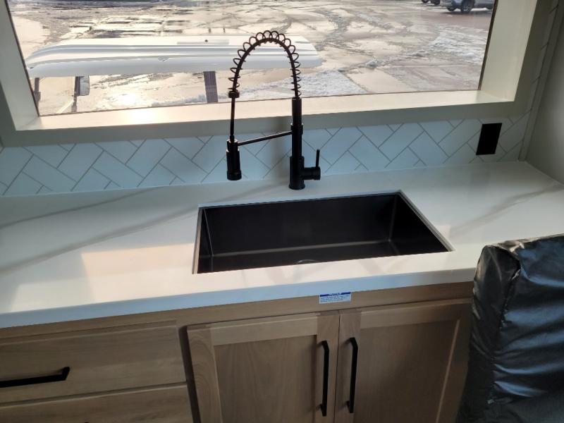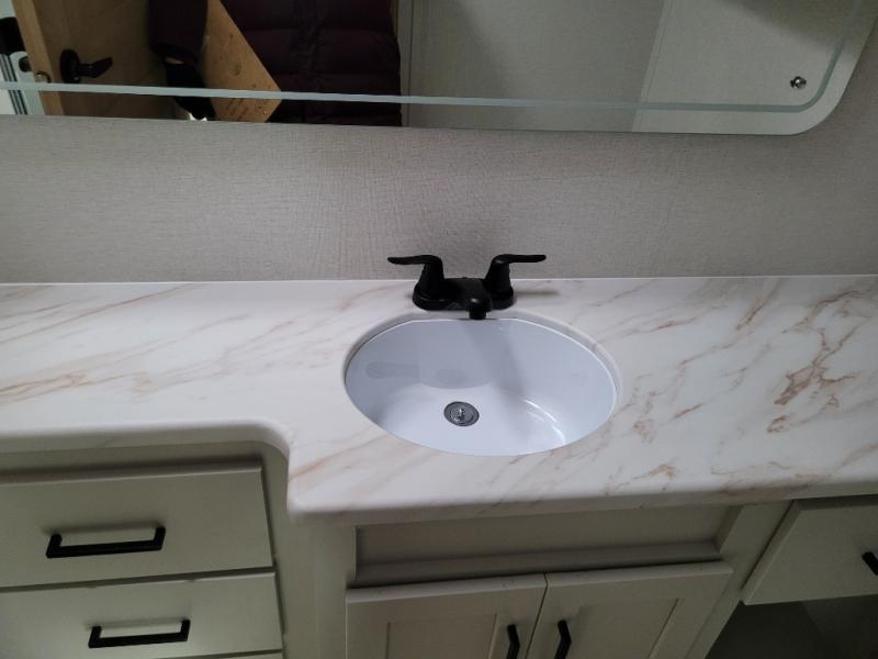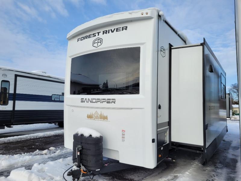 With each Sandpiper Destination Trailer by Forest River you will enjoy many luxurious features, such as crown molding over the kitchen cabinets, solid surface kitchen countertops, a memory foam mattress, plus so much more. The extra large picture windows throughout let natural light in and provide beautiful outdoor views, and each model includes three or more slides for added interior space. You'll find many exterior conveniences, like the porch light with an interior switch, the rain gutters with extra long drip spouts to prevent black streaking, and an electric awning with LED light strip, plus more! You will stay comfortable year around with dual 15,000 A/C units plus each model is constructed with an Underbelly Armor for better protection and insulation!