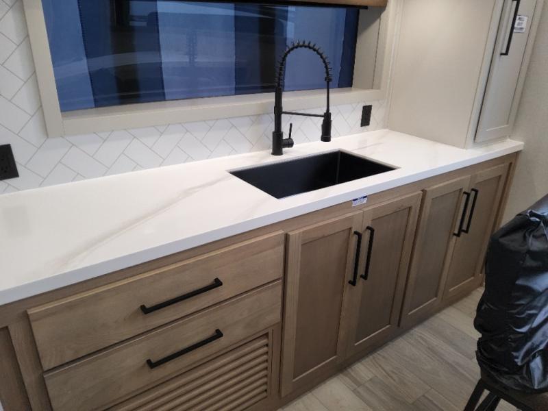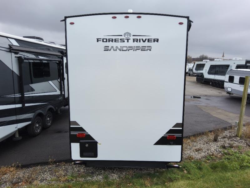 With each Sandpiper Destination Trailer by Forest River you will enjoy many luxurious features, such as crown molding over the kitchen cabinets, solid surface kitchen countertops, a memory foam mattress, plus so much more. The extra large picture windows throughout let natural light in and provide beautiful outdoor views, and each model includes three or more slides for added interior space. You'll find many exterior conveniences, like the porch light with an interior switch, the rain gutters with extra long drip spouts to prevent black streaking, and an electric awning with LED light strip, plus more! You will stay comfortable year around with dual 15,000 A/C units plus each model is constructed with an Underbelly Armor for better protection and insulation!