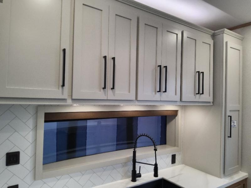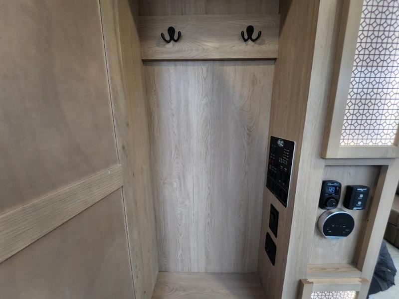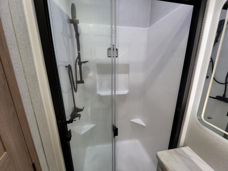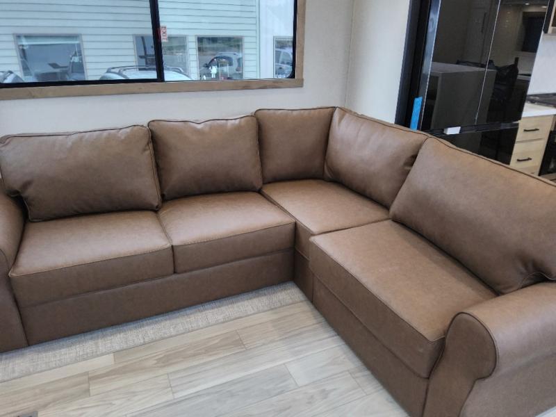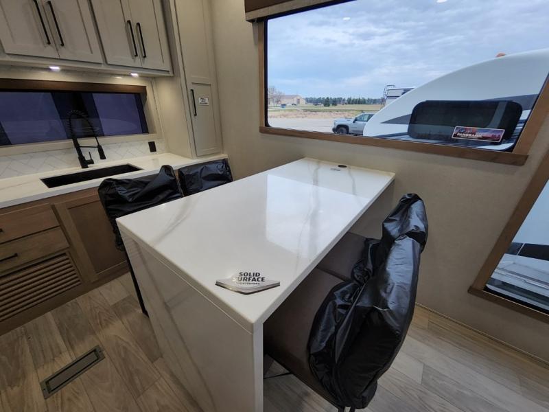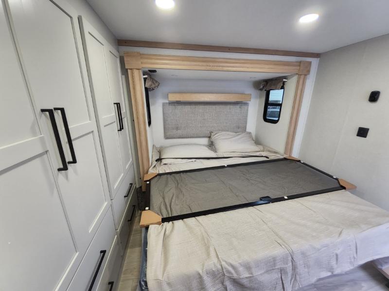 This incredible destination trailer has everything you need to live life to the fullest. Imagine retreating to a peaceful rear bedroom, complete with a king bed slide, spacious wardrobe, plus a closet with washer and dryer prep. Unwind and pamper yourself in style in the incredible full bathroom, featuring a linen closet, medicine cabinets, and a fiberglass shower with a seat. The living room is the heart of the home, boasting a comfortable sectional sofa, ottoman, and entertainment center perfect for gathering with family or friends and creating unforgettable memories. The loft is a cozy retreat for kids or guests, featuring two bunk mats, and a dual wardrobe/bookcases for their things. The front kitchen has a 19 cu. ft. refrigerator, overhead cabinet, microwave, three-burner cooktop, and free-standing dinette with a waterfall edge, and the pantry provides ample storage for all your favorite foods. Finally, step outside and enjoy the shade and protection of the two awnings and the two entry and two exit doors will make it easy to come and go.